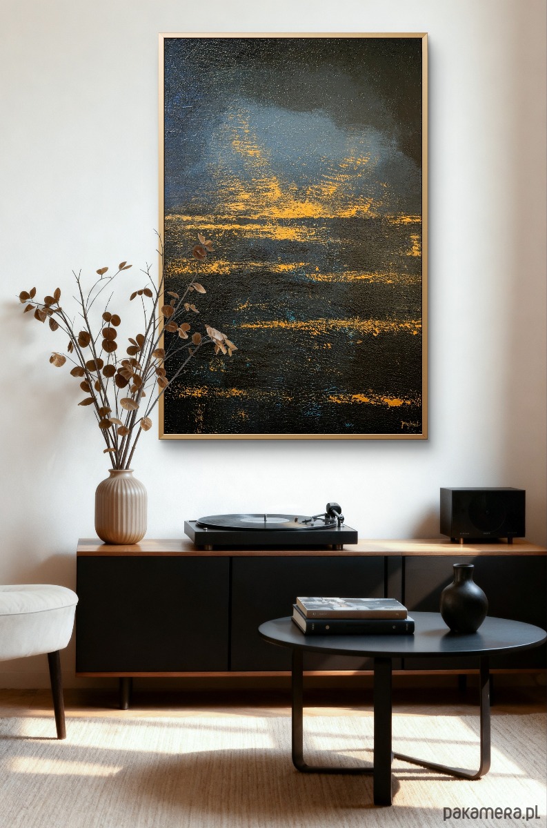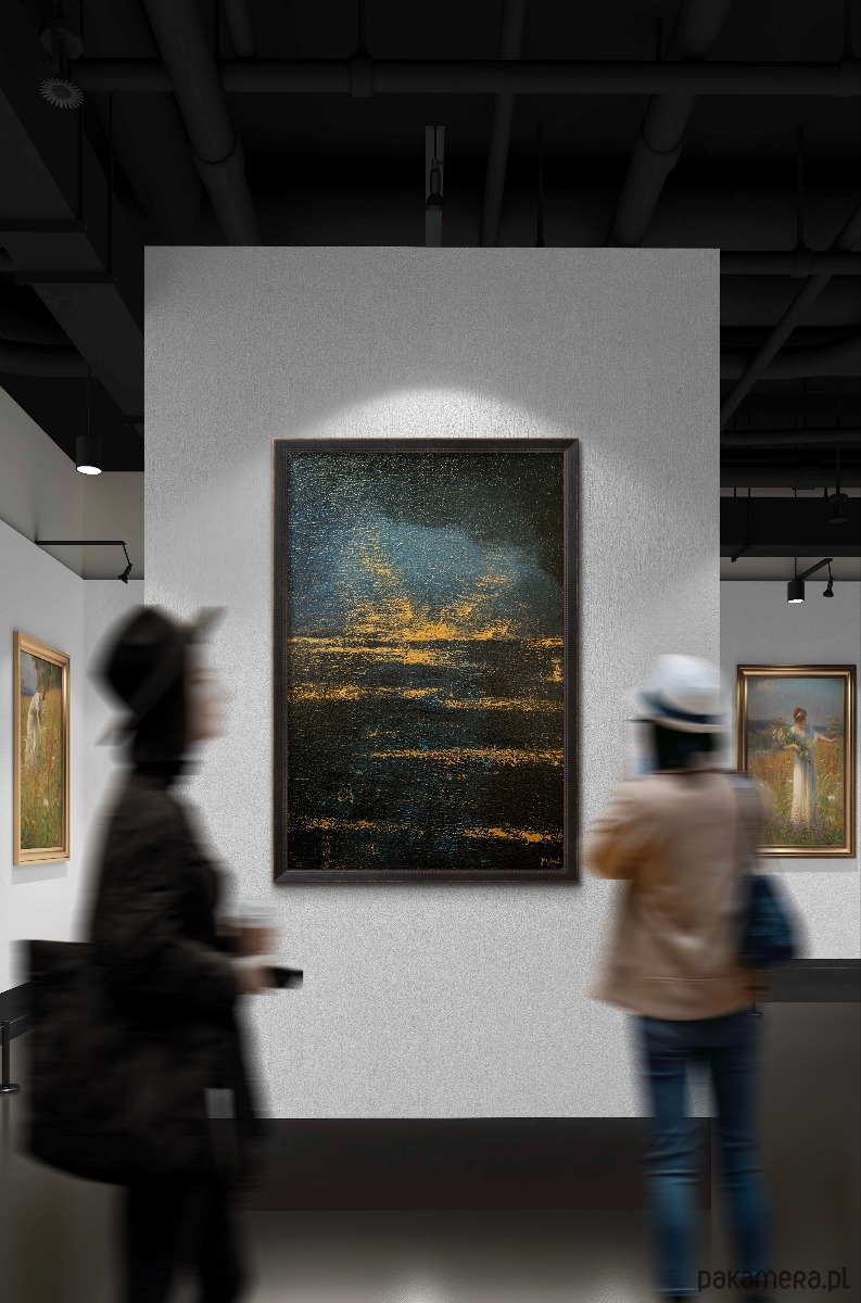 Granatowe i przygaszone, niemal nocne tony spotykają się tutaj ze złotymi refleksami, gęsta faktura farby tworzy wrażenie głębi i falowania, jakby obraz oddychał wraz z morzem. To pejzaż emocjonalny — intymny, cichy, skupiony w sobie, jak moment, kiedy zatrzymujemy się na plaży i pozwalamy myślom opaść.