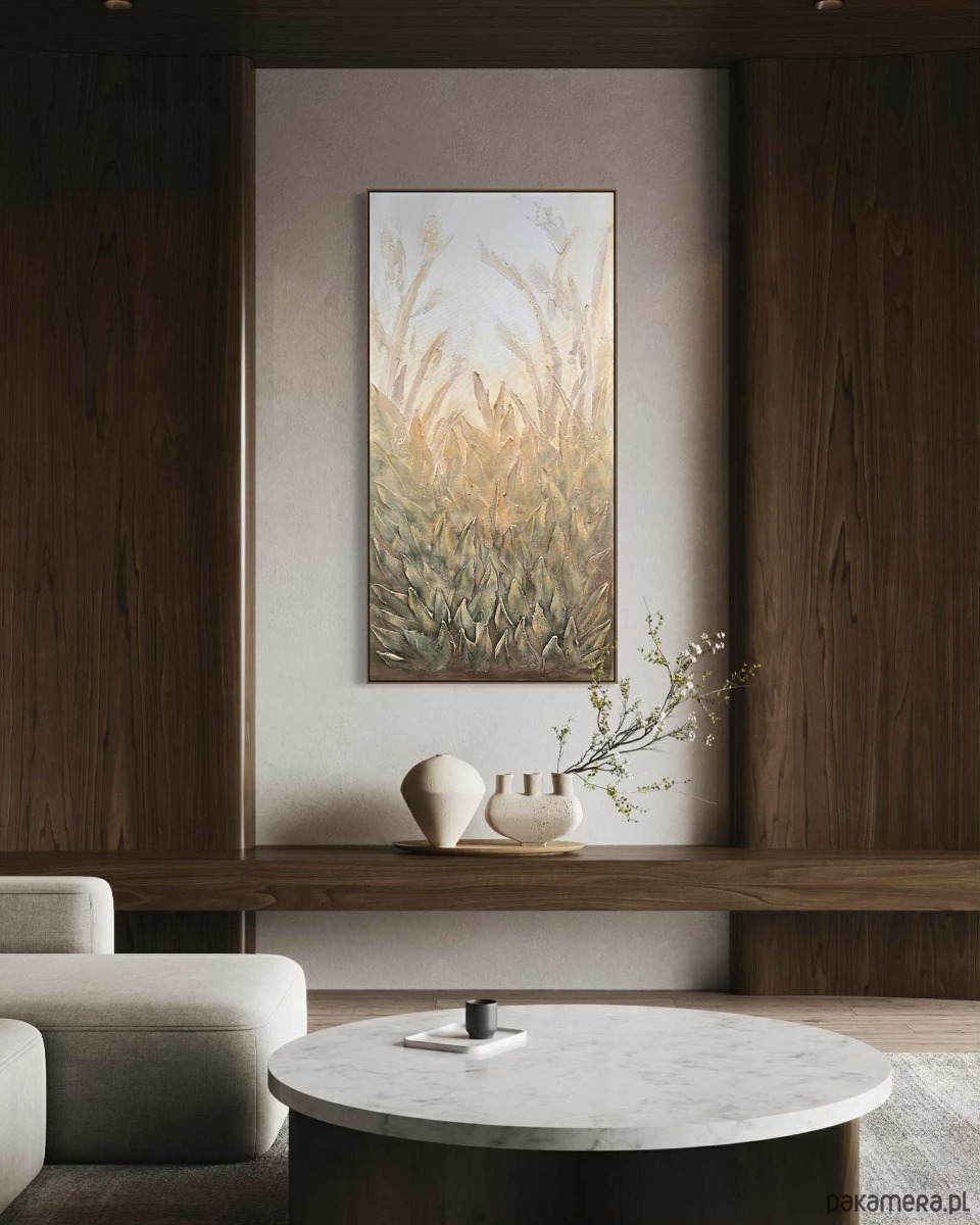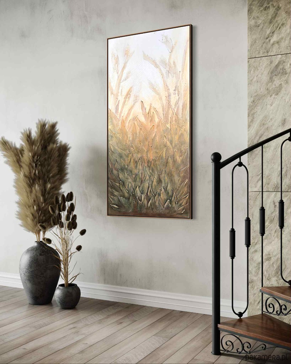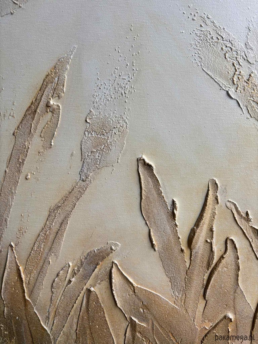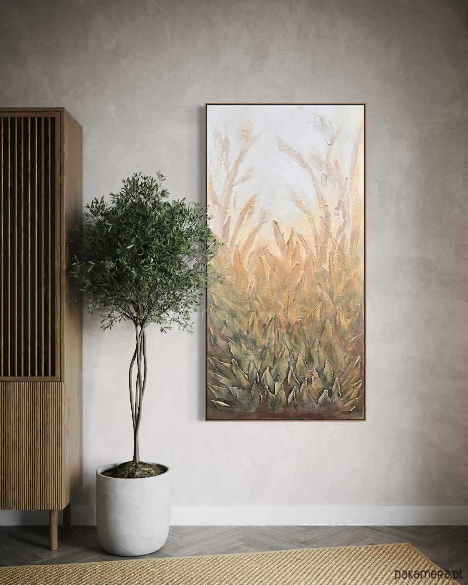 Obraz utrzymany jest w delikatnej, naturalnej palecie barw — od subtelnych kremów i beżów po ciepłe zielenie i przygaszone brązy. Przedstawia gęstą roślinność, której liście i źdźbła unoszą się ku górze, tworząc harmonijną, falującą strukturę. Tekstura farby jest wyraźnie wyczuwalna — grube, wypukłe pociągnięcia pędzla i modelowane powierzchnie dodają całości trójwymiarowości oraz wrażenia zanurzenia w naturze. Górna część obrazu jest jaśniejsza i bardziej mglista, jakby rośliny wyłaniały się z porannej poświaty lub miękkiego, rozproszonego światła wczesnego świtu. W dolnej części kompozycja jest gęstsza i bardziej nasycona, co buduje poczucie głębi i zakorzenienia. Dzieło emanuje spokojem, harmonią i organiczną energią. Przypomina moment zatrzymany pomiędzy nocą a dniem — chwilę, gdy natura oddycha najciszej. To idealna kompozycja do wnętrz, które mają łączyć elegancję z naturalnością.
