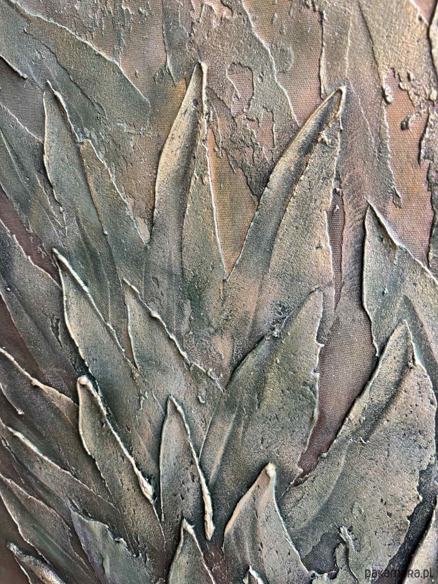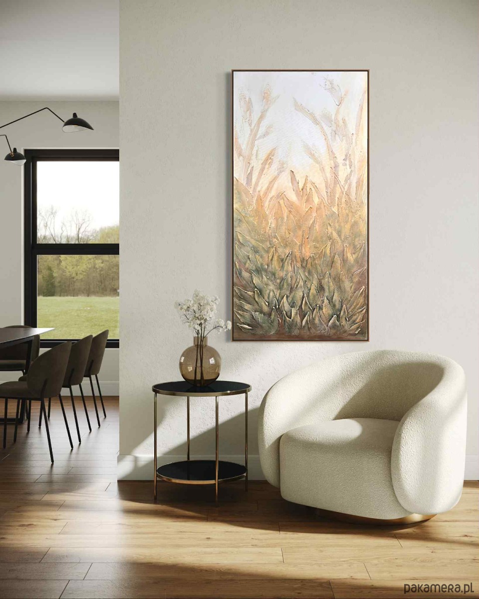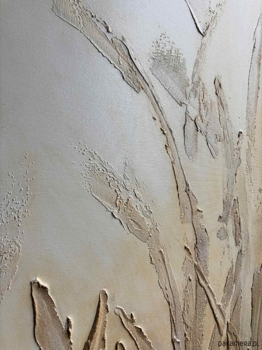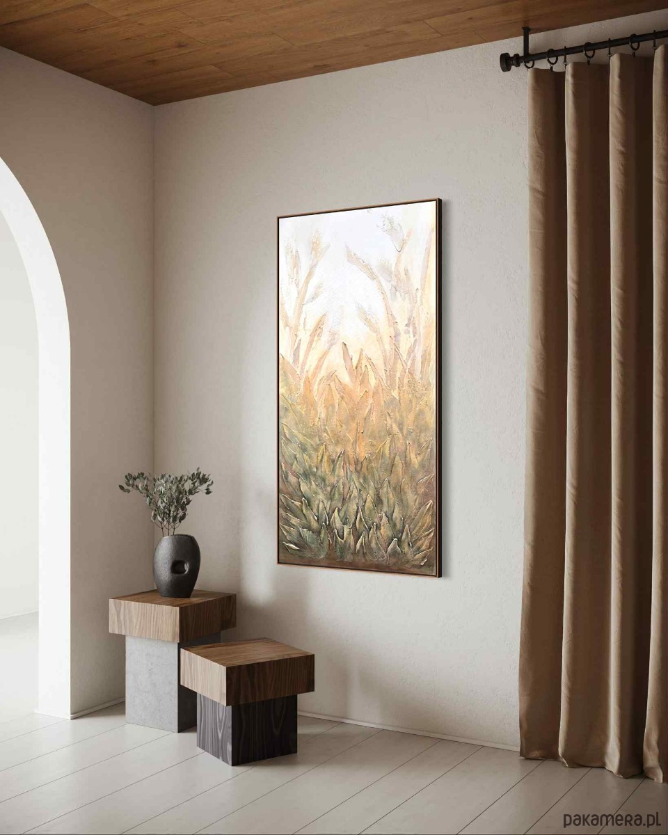 Obraz utrzymany jest w delikatnej, naturalnej palecie barw — od subtelnych kremów i beżów po ciepłe zielenie i przygaszone brązy. Przedstawia gęstą roślinność, której liście i źdźbła unoszą się ku górze, tworząc harmonijną, falującą strukturę. Tekstura farby jest wyraźnie wyczuwalna — grube, wypukłe pociągnięcia pędzla i modelowane powierzchnie dodają całości trójwymiarowości oraz wrażenia zanurzenia w naturze. Górna część obrazu jest jaśniejsza i bardziej mglista, jakby rośliny wyłaniały się z porannej poświaty lub miękkiego, rozproszonego światła wczesnego świtu. W dolnej części kompozycja jest gęstsza i bardziej nasycona, co buduje poczucie głębi i zakorzenienia. Dzieło emanuje spokojem, harmonią i organiczną energią. Przypomina moment zatrzymany pomiędzy nocą a dniem — chwilę, gdy natura oddycha najciszej. To idealna kompozycja do wnętrz, które mają łączyć elegancję z naturalnością.