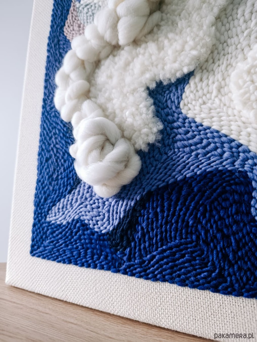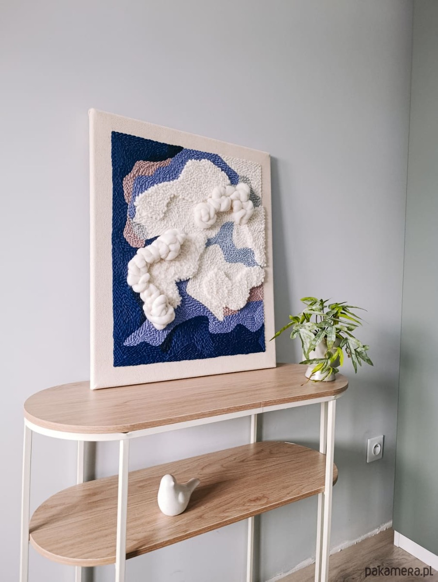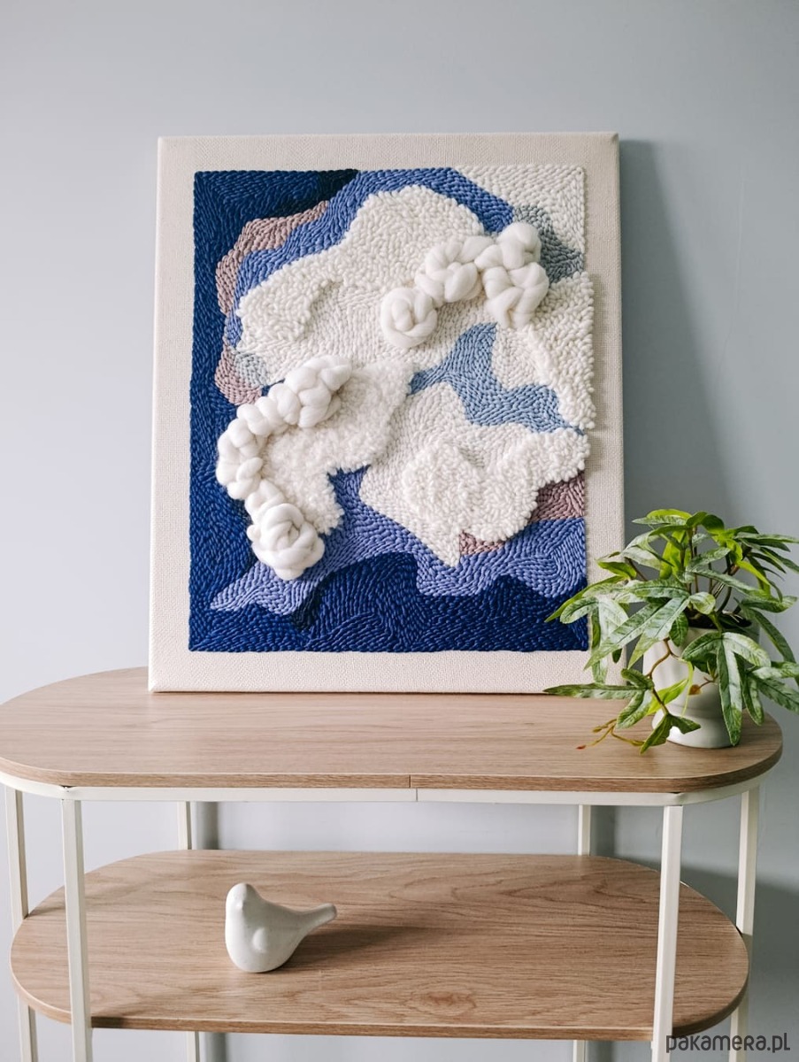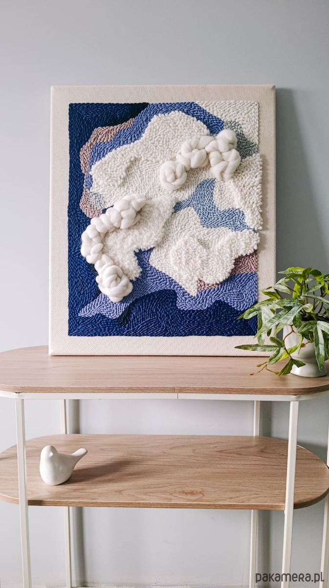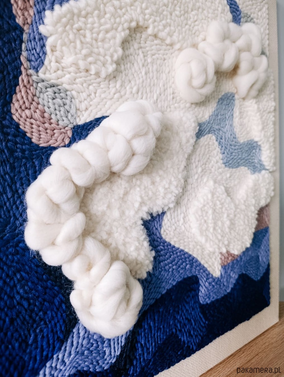 Obraz jest wykonany ręcznie w technice punch needle i jest dostępny od ręki. Jest to druga, nieco zmieniona, wersja obrazu "Wielki błękit", który jest dostępny na zamówienie.