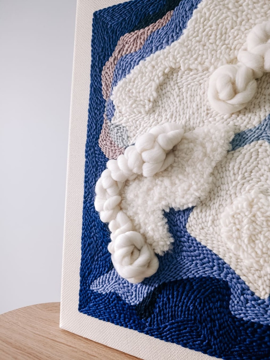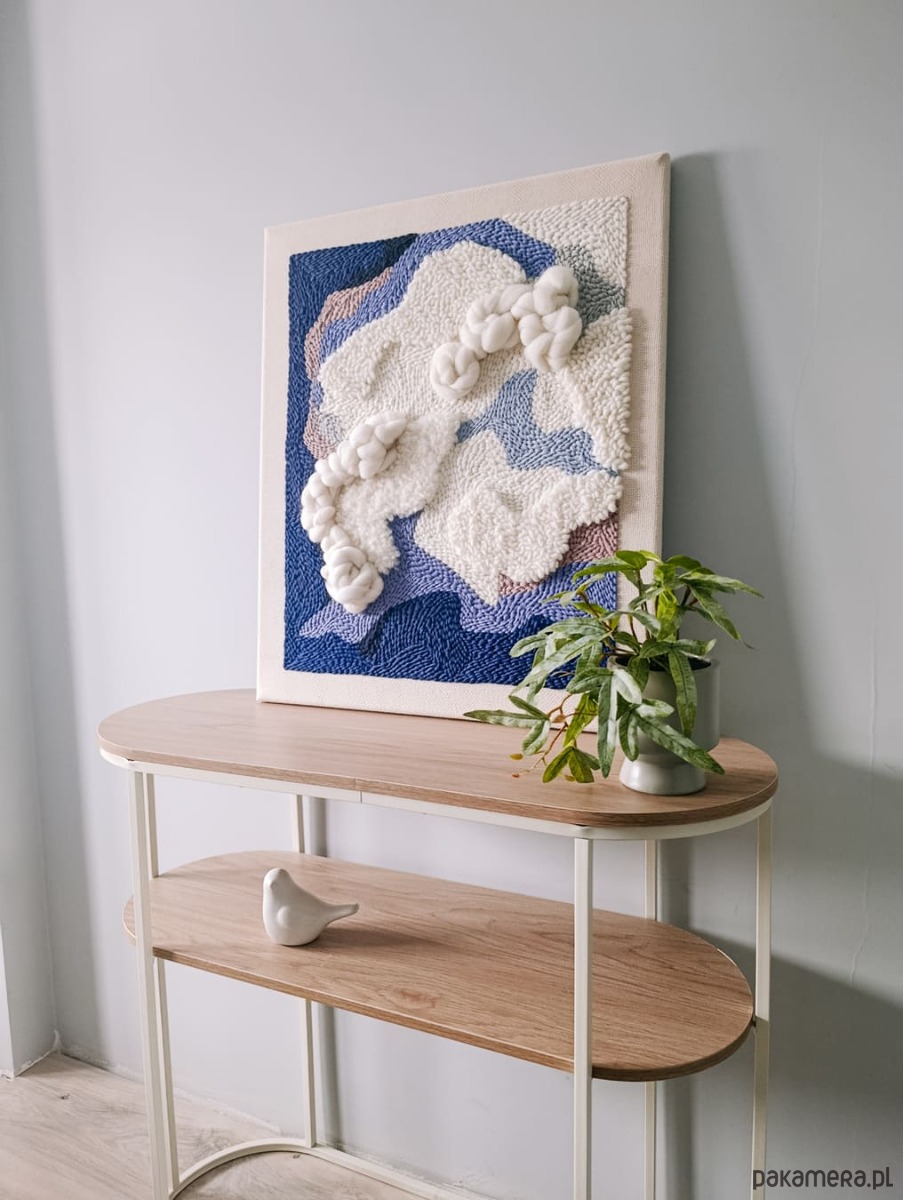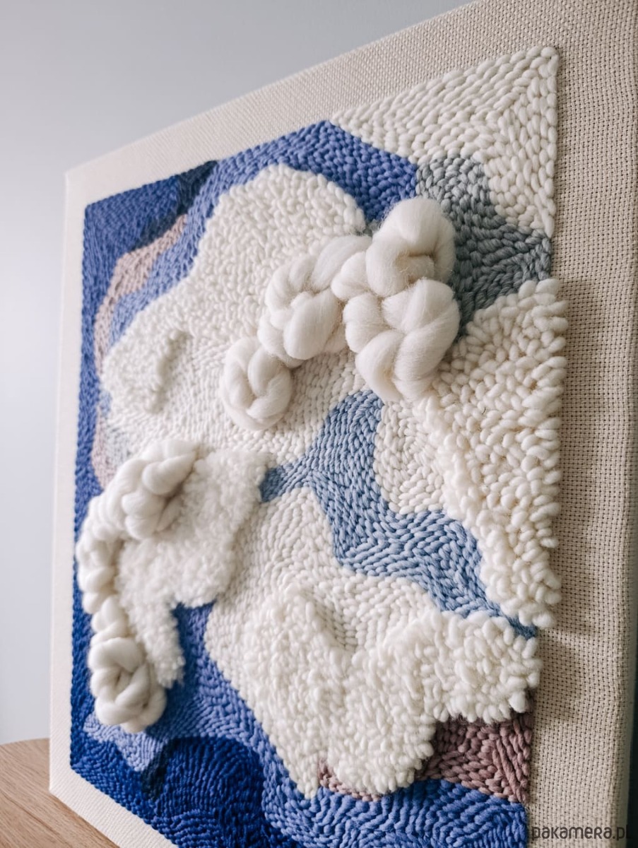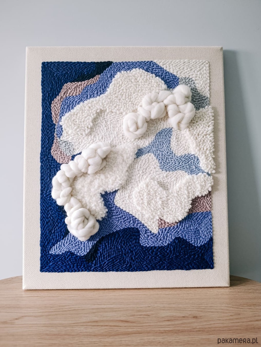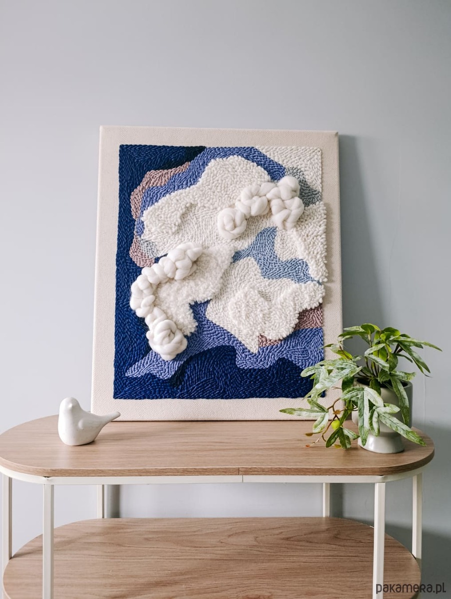 Obraz jest wykonany ręcznie w technice punch needle i jest dostępny od ręki. Jest to druga, nieco zmieniona, wersja obrazu "Wielki błękit", który jest dostępny na zamówienie.