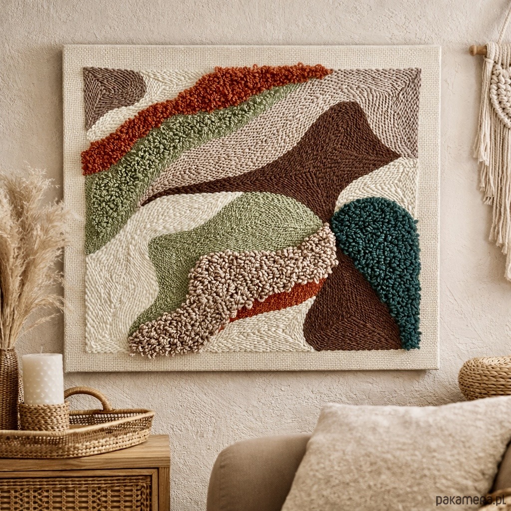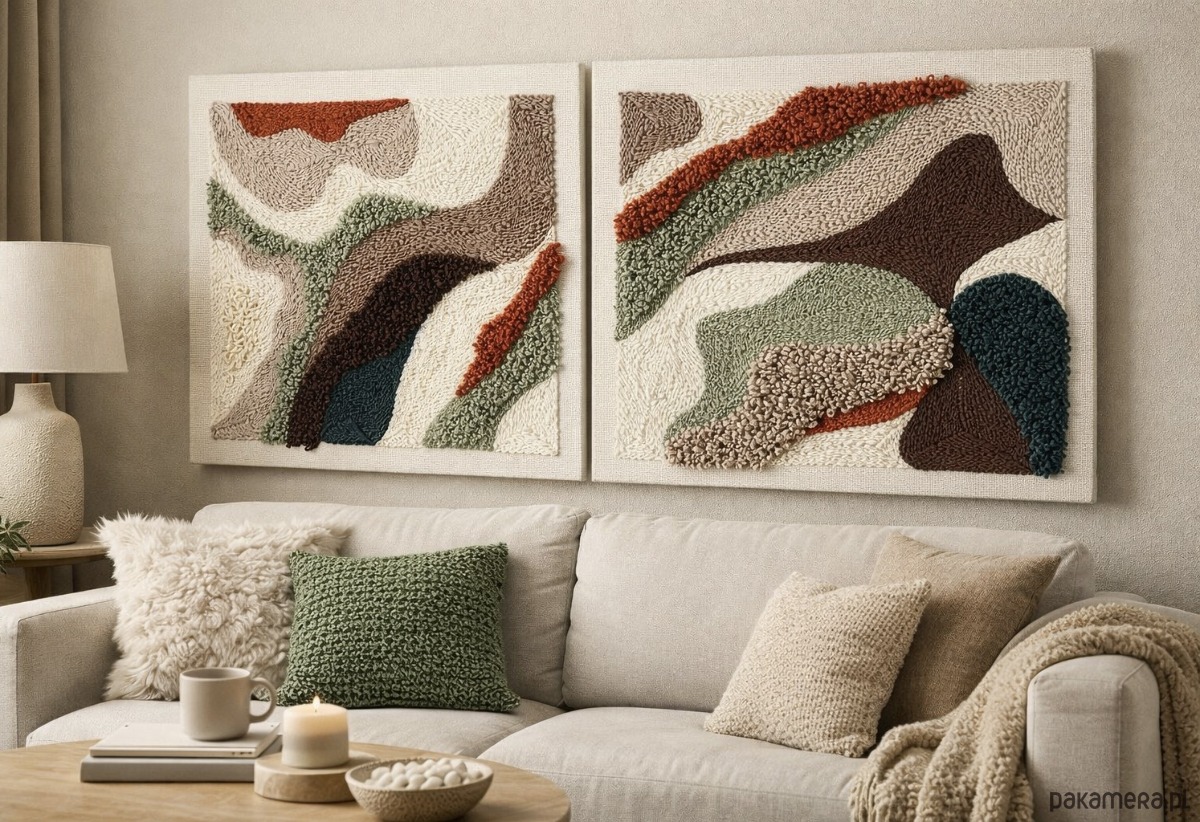 Prezentowany zestaw to dwuczęściowy obraz tkany metodą punch needle w odcieniach beżu, ecru, brązu, zieleni i ceglastych akcentów. Kompozycja przechodzi płynnie z jednej części na drugą, tworząc spójną, przestrzenną całość z wyraźnym efektem 3D dzięki wypukłej strukturze nitek.