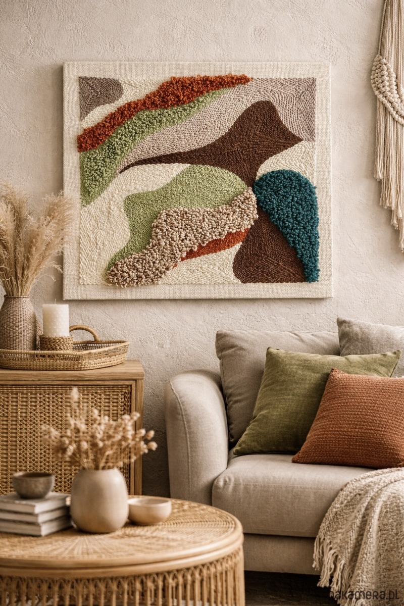 Jeśli szukasz unikatowej, tekstylnej dekoracji ściennej z wyraźną fakturą i naturalnym charakterem — napisz do mnie. Wspólnie stworzymy projekt dopasowany do Twojego domu 🤍