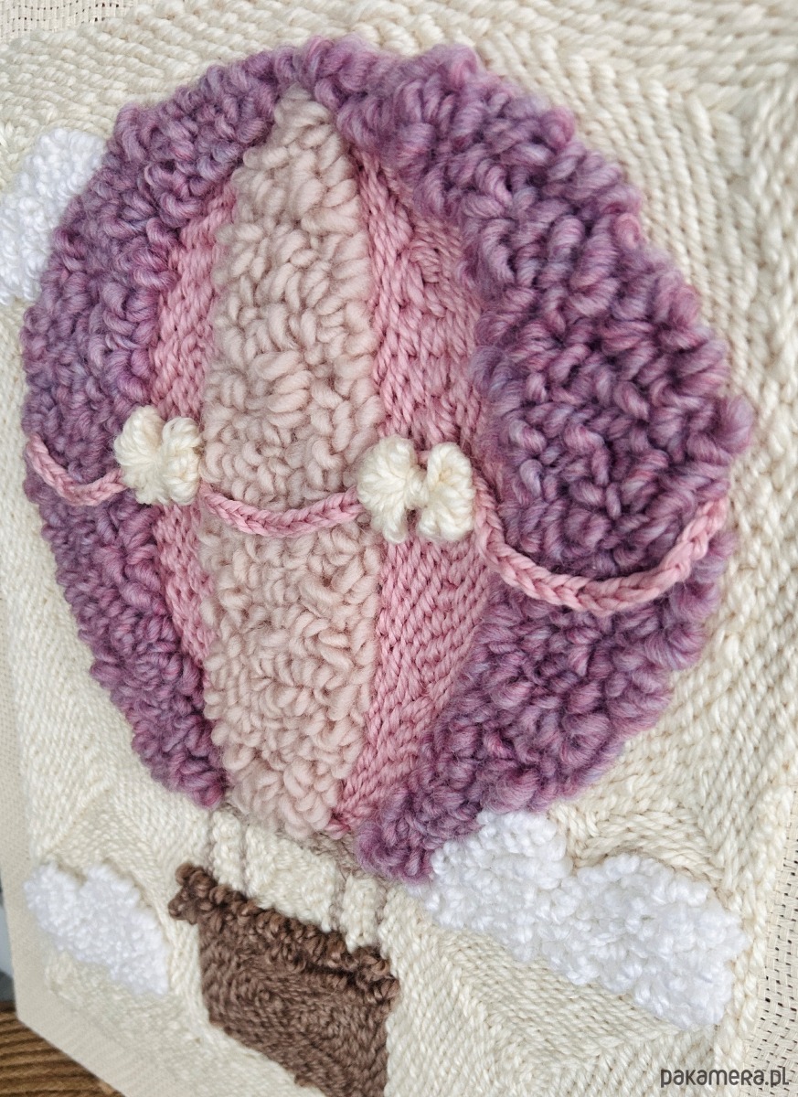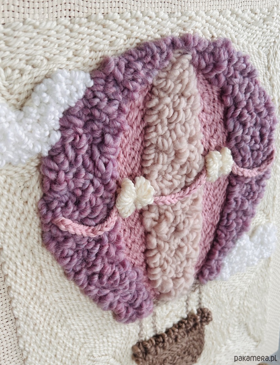 Ręcznie wykonany obraz tkany z motywem dekoracyjnego balonu to wyjątkowa ozdoba dziecięcego pokoju. Utrzymany w ciepłej, subtelnej kolorystyce ecru, pudrowego różu, zgaszonego fioletu oraz naturalnego brązu, wprowadza do wnętrza przytulność i delikatny, bajkowy klimat.