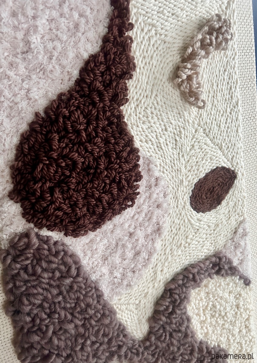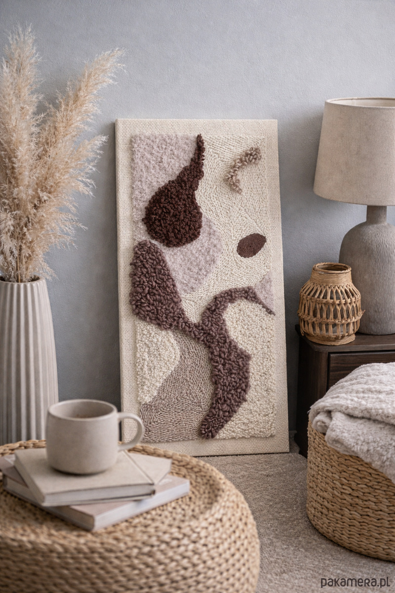Ten ręcznie wykonany obraz tkany to połączenie naturalnych odcieni ecru, chłodnego beżu i głębokiego brązu w nowoczesnej, organicznej kompozycji. Każdy fragment ma inną fakturę – od miękkich, pętelkowych wypukłości po gładkie, wklęsłe sploty. Dzięki temu obraz zyskuje efekt subtelnego 3D, który zmienia się w zależności od światła.