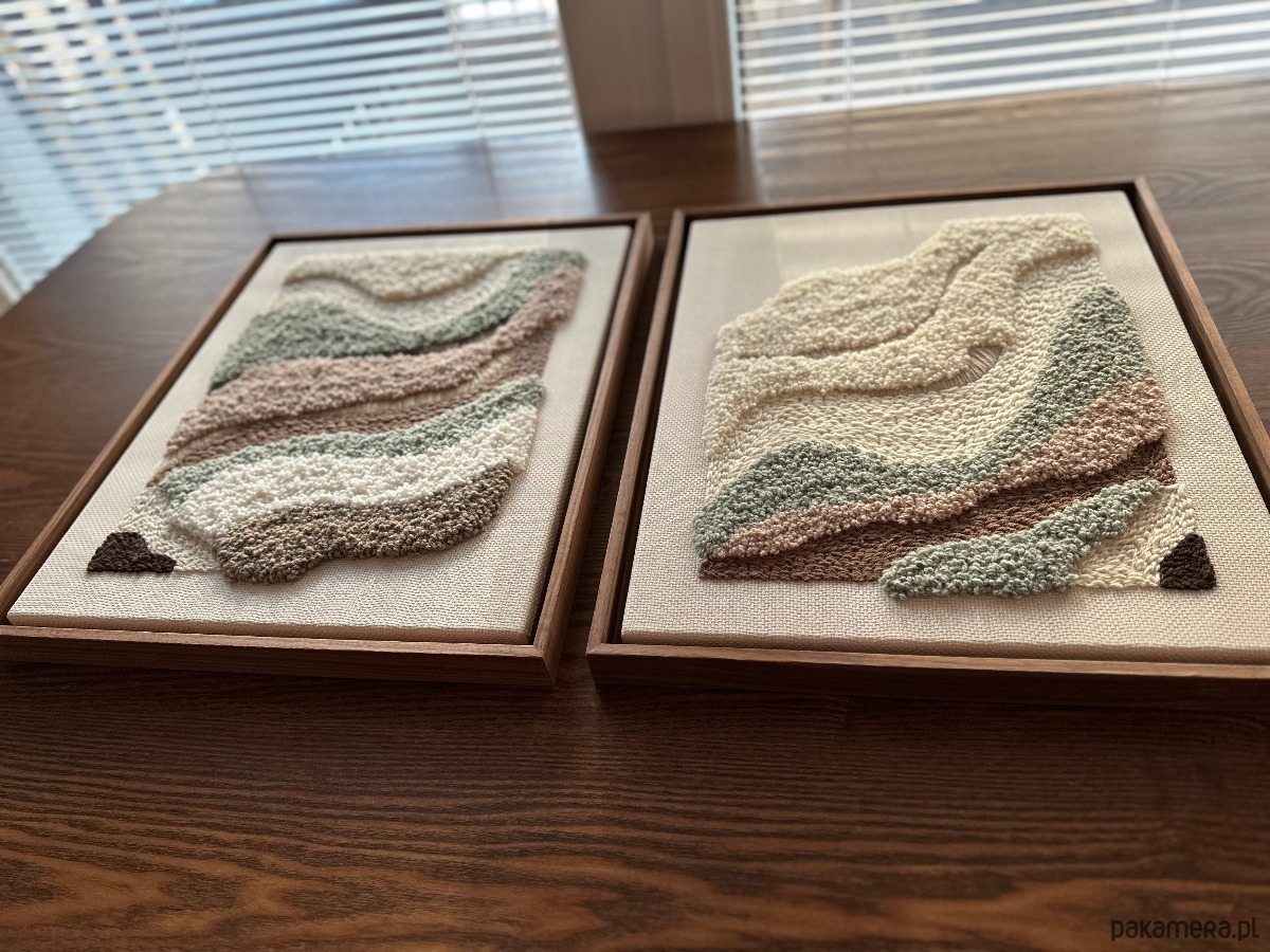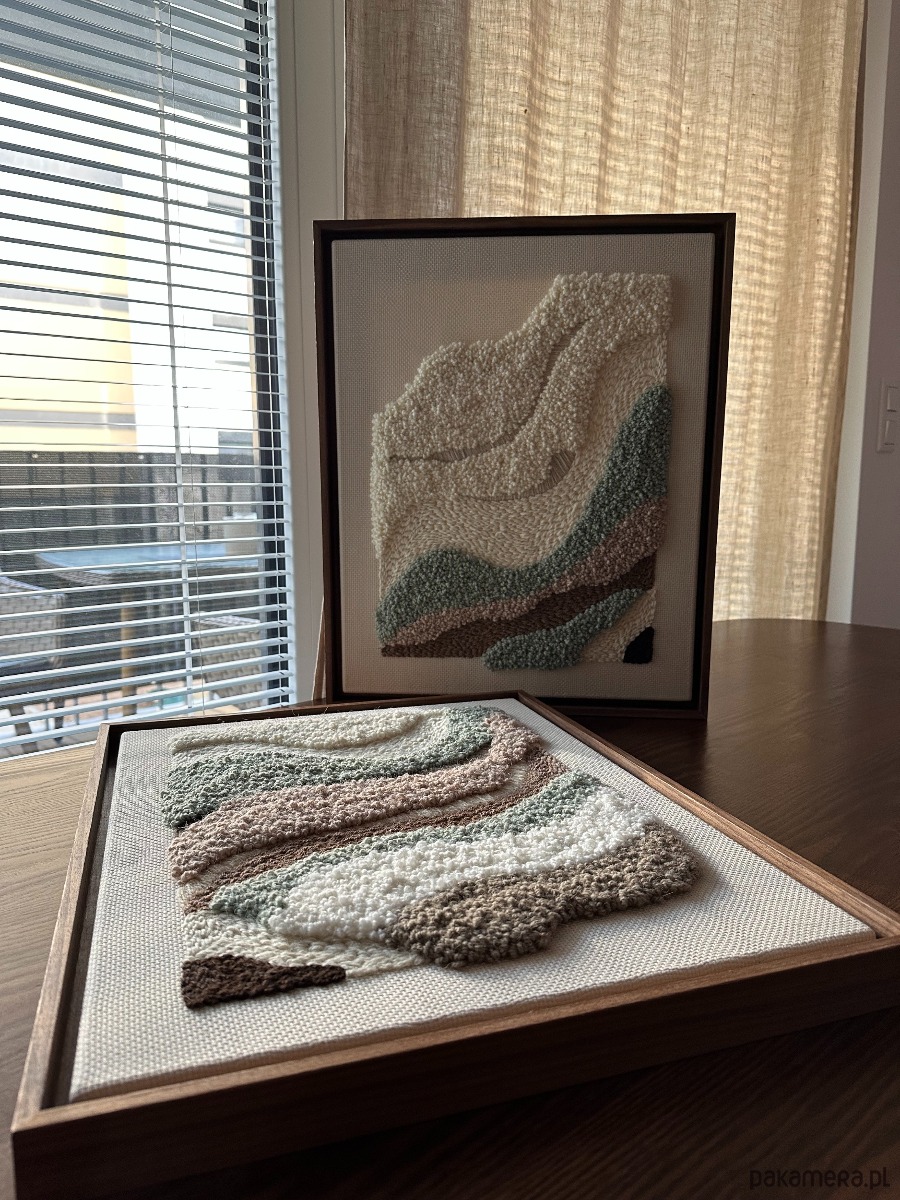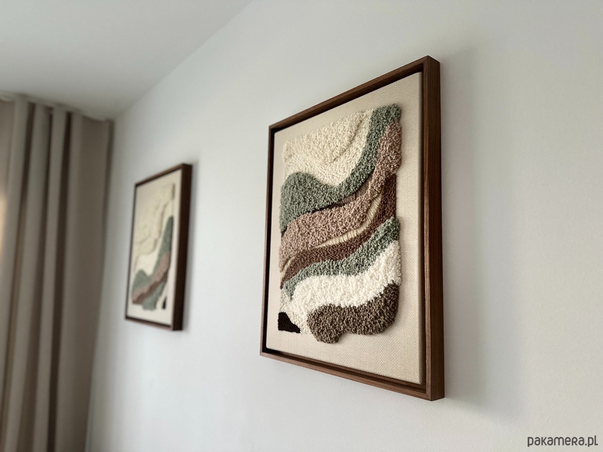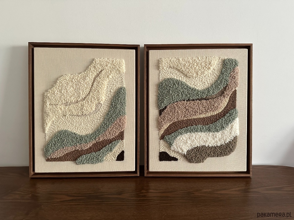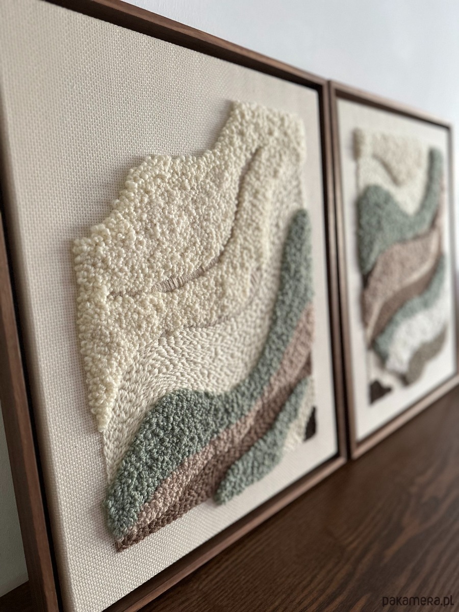 Podwójny obraz ( dyptych ) wykonany metodą punch needle na bawełnianej kanwie, oprawiony w drewnianą ramę w kolorze orzecha. Obraz wykonany jest naturalną wełną owcza i tkacka w kolorach ecre, brązach oraz miętowej zieleni. Wymiar jednego obrazu 44cmx54cm / 2026. Obraz dostępny jest wyłącznie w jednym egzemplarzu, gotowy do wysyłki.