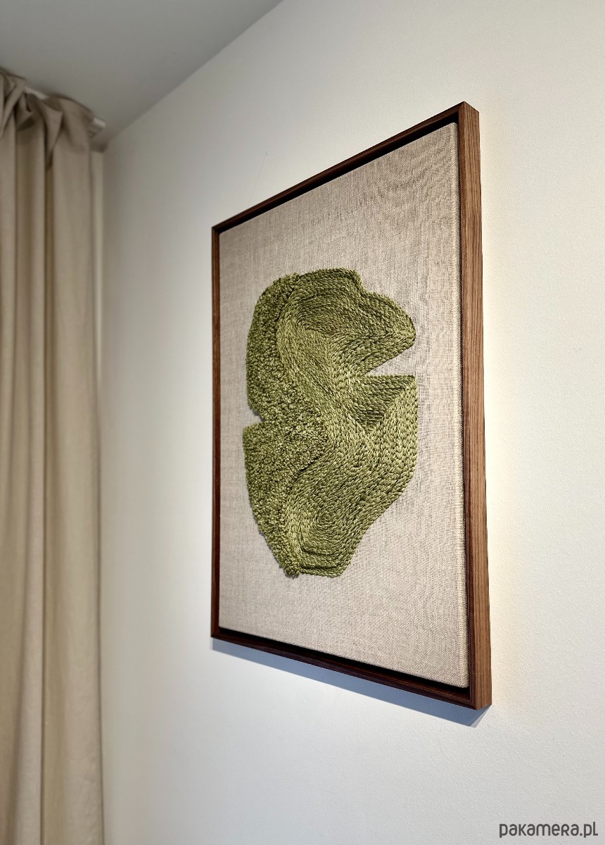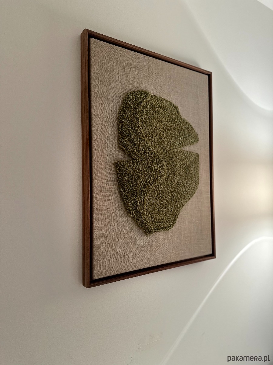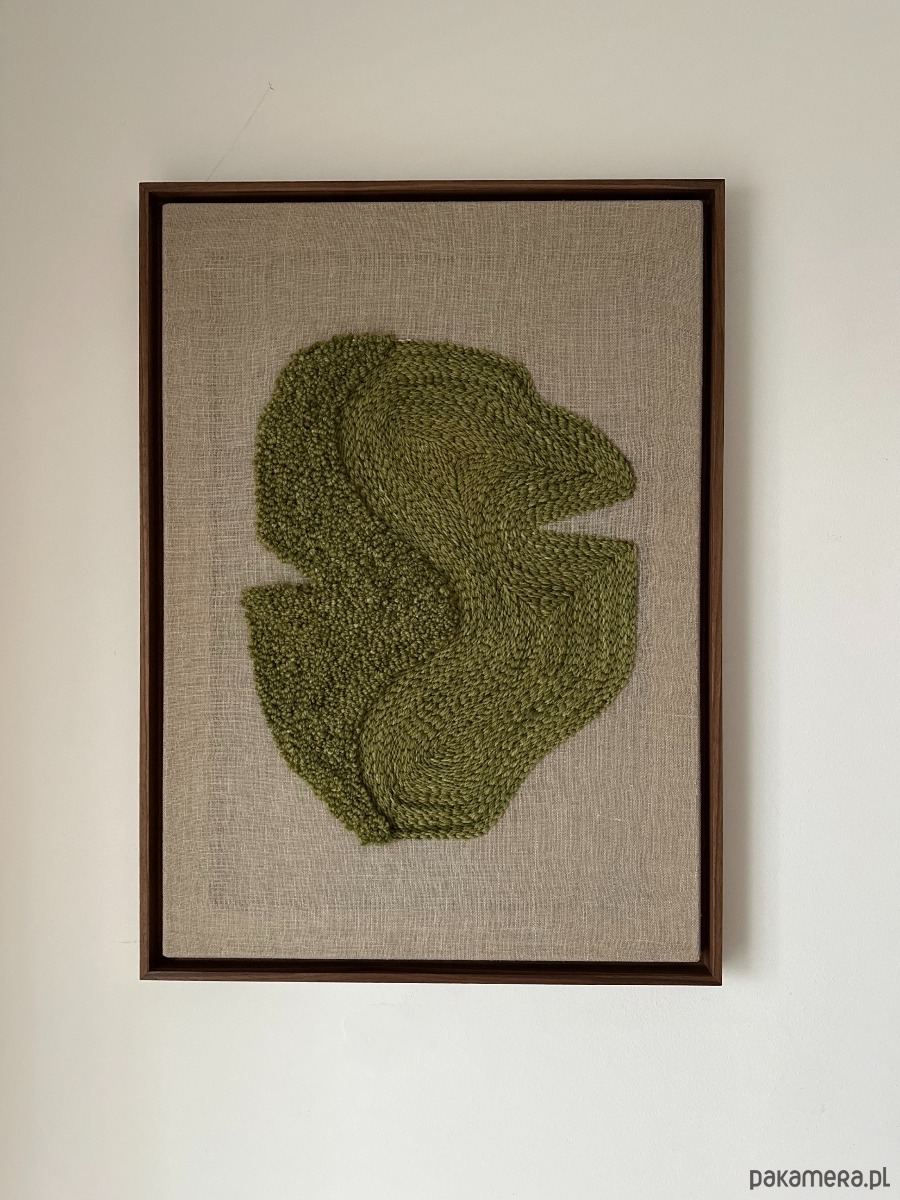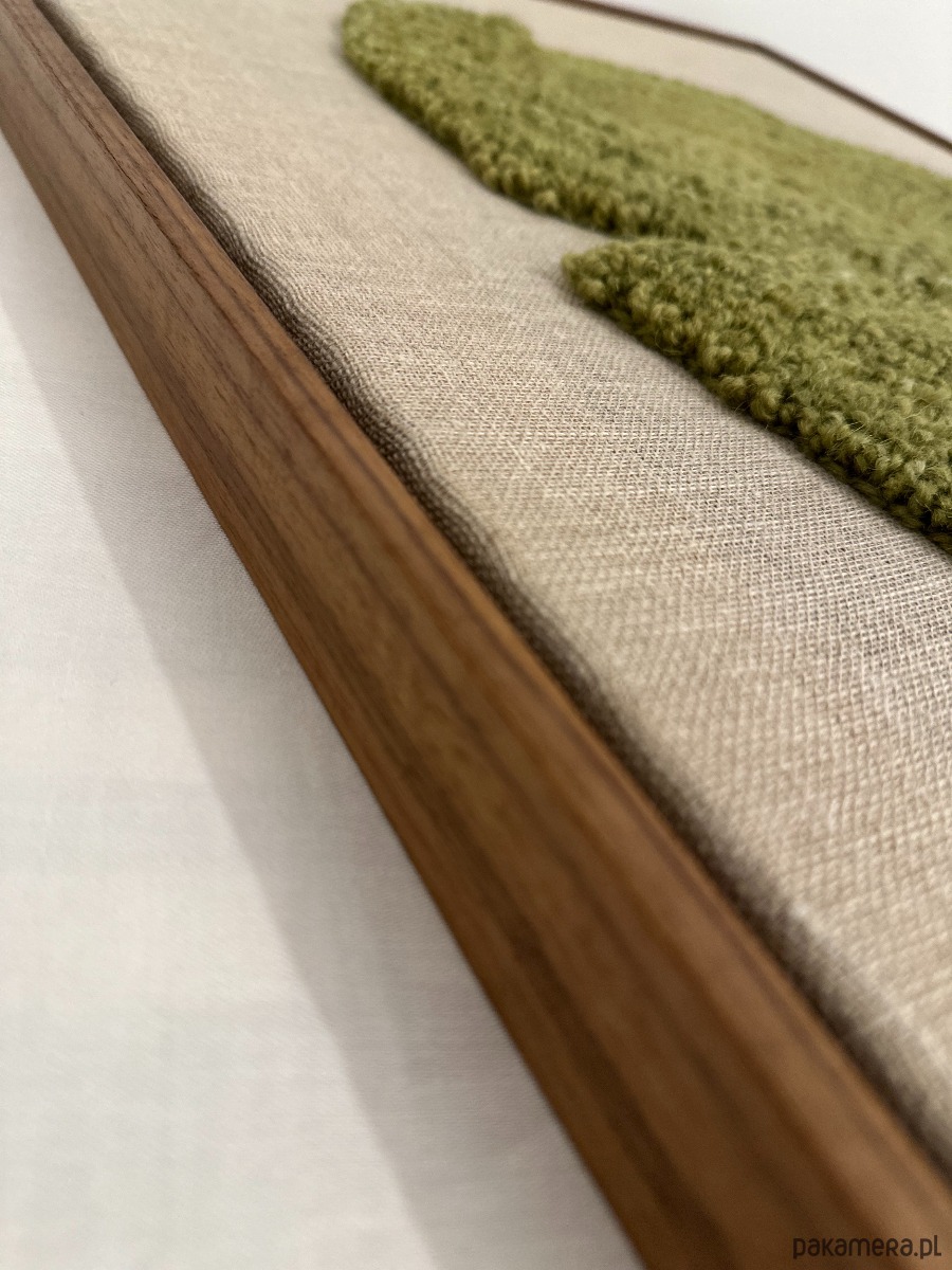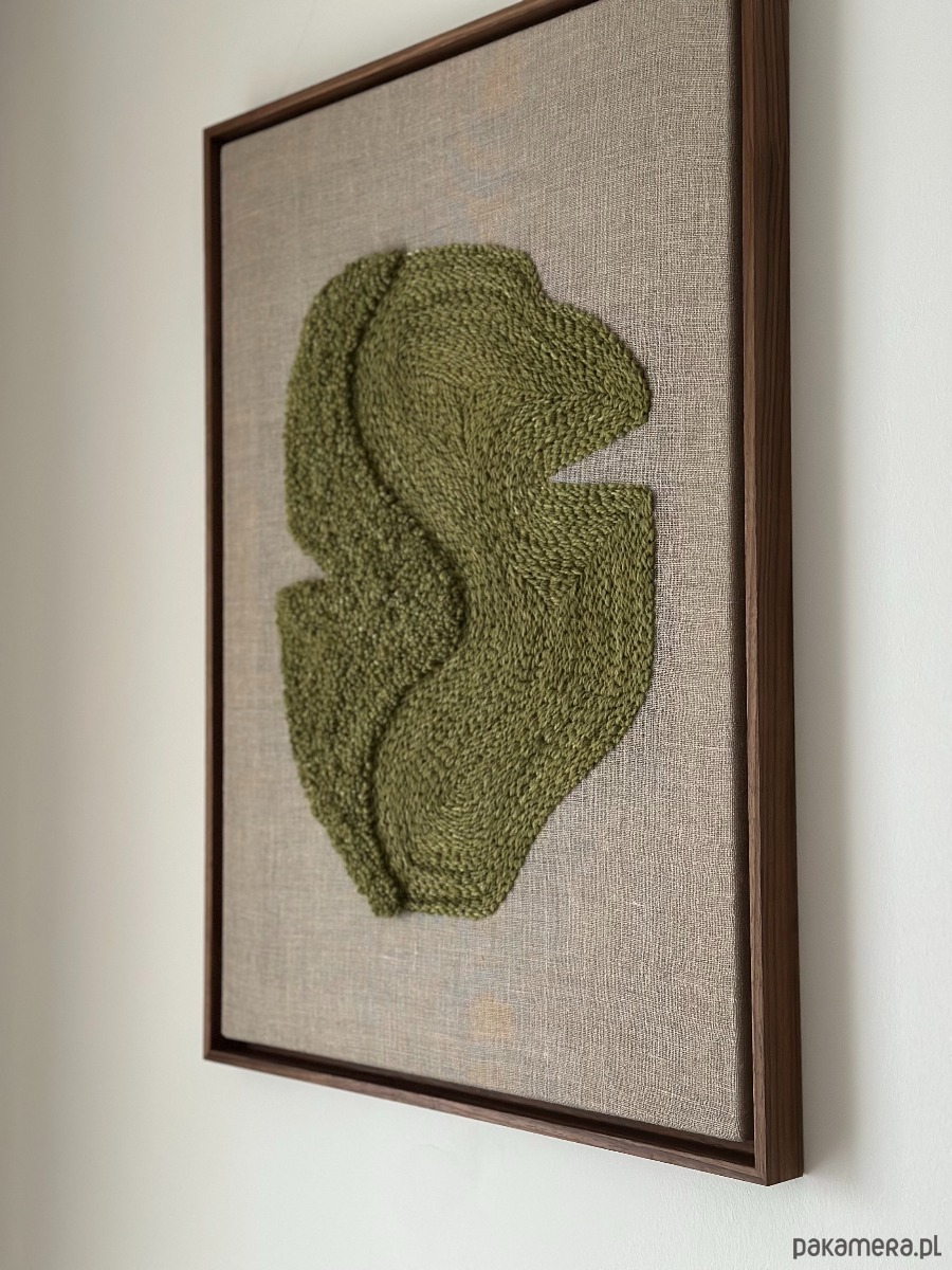 Obraz wykonany technika punch needle naturalną wełną owczą farbowana na kolor oliwkowy, lniane podłoże, drewniana rama w kolorze orzecha.