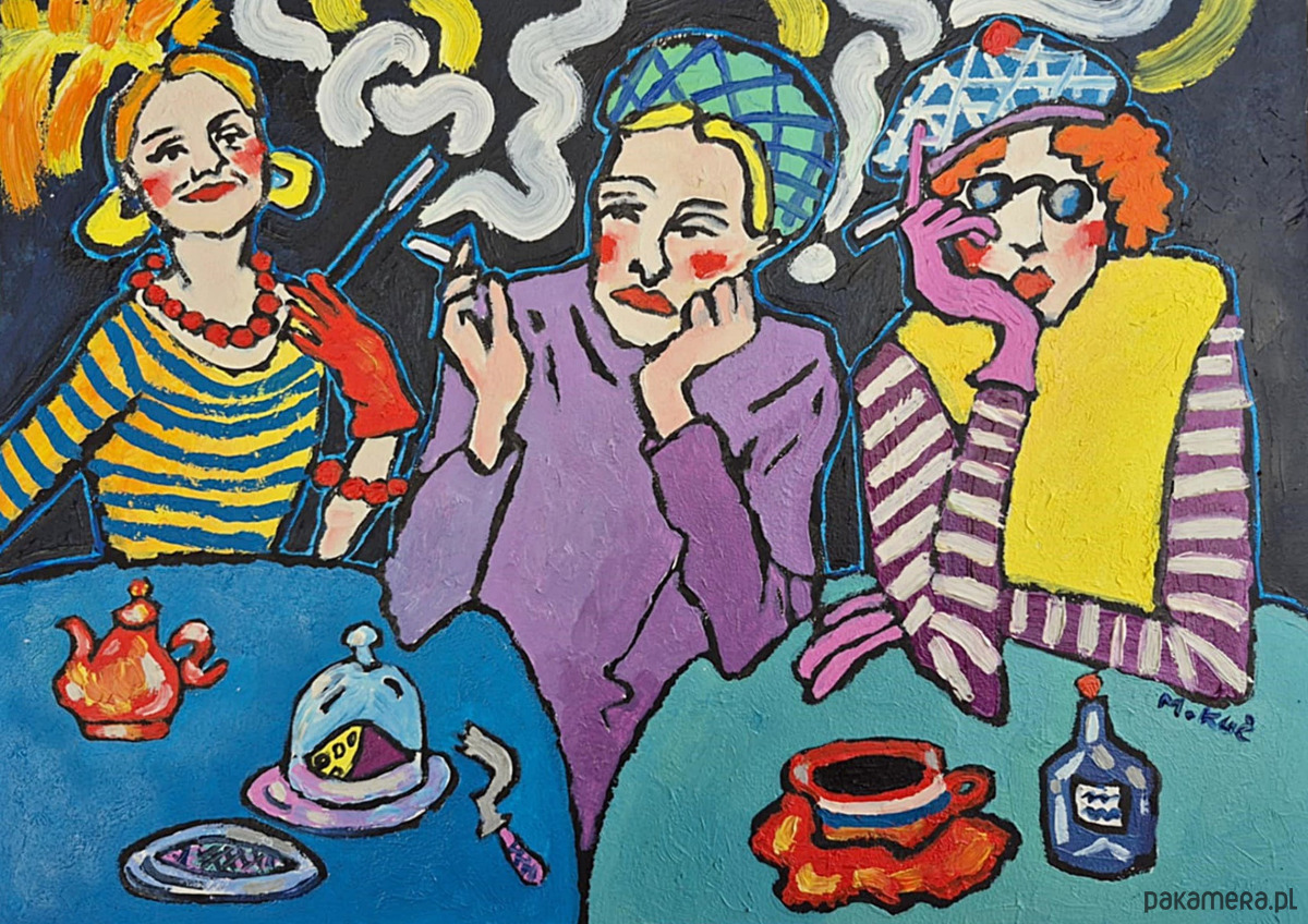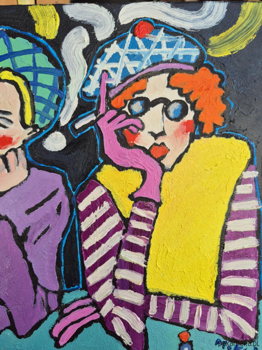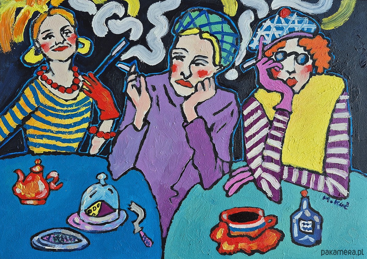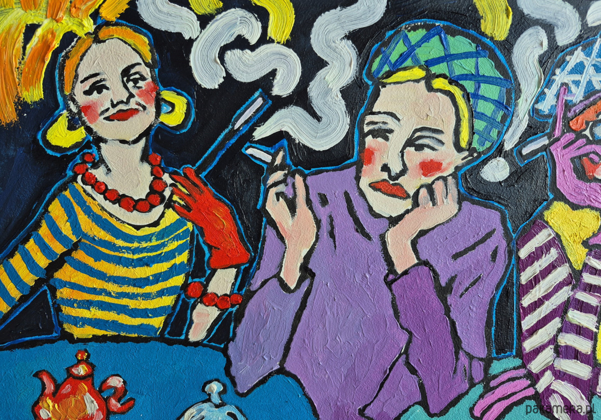 Obraz pulsuje kolorem jak wieczór w zadymionej kawiarni, gdzie czas płynie wolniej, a rozmowy unoszą się w powietrzu niczym białe, wijące się wstęgi dymu. Trzy postaci siedzą przy stole, każda zanurzona w swojej pozie, a jednak splecione wspólną chwilą.