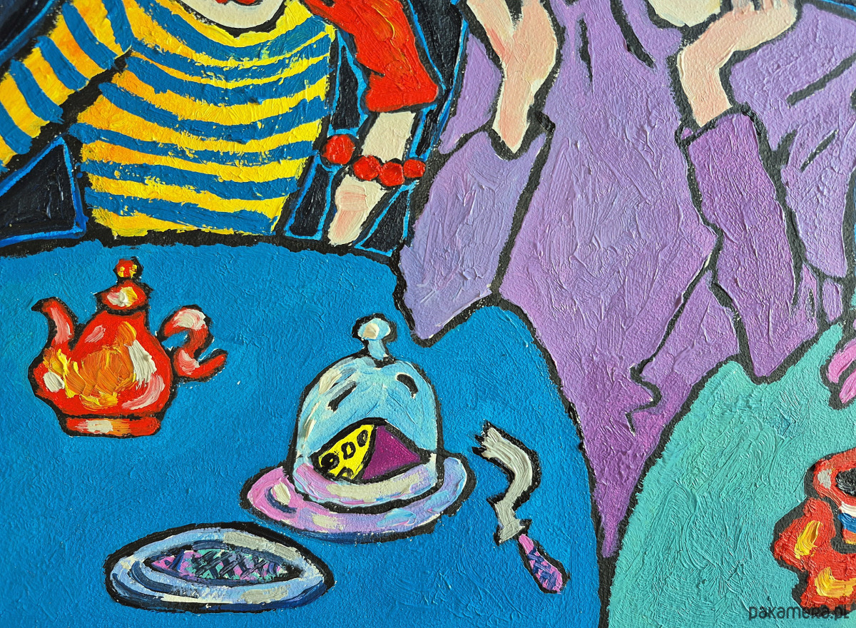 Stół przed nimi to osobna opowieść: mały czerwony czajniczek jak z bajki, talerzyk z serem pod kloszem, filiżanka.