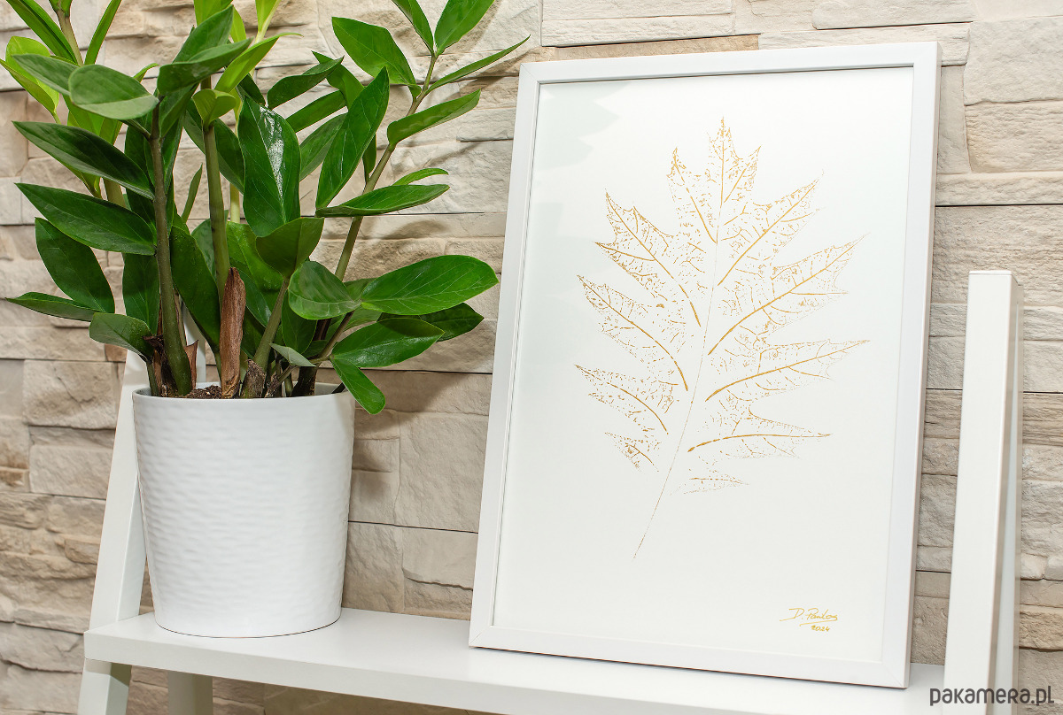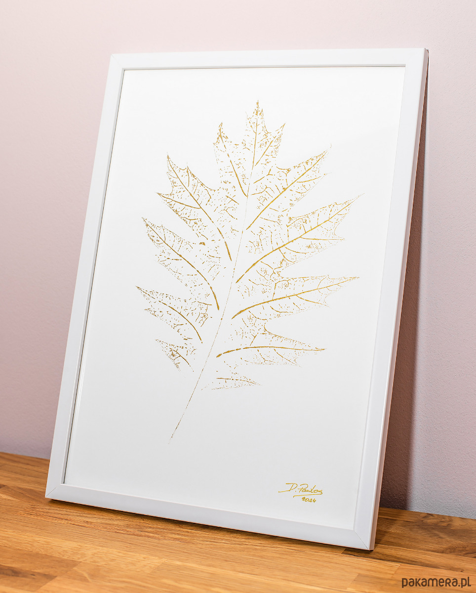 Autorska Grafika w ramie 20x30cm. Plakat Złoty Liść Dąb. Golden Oak Leaf