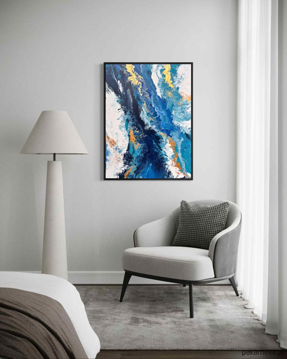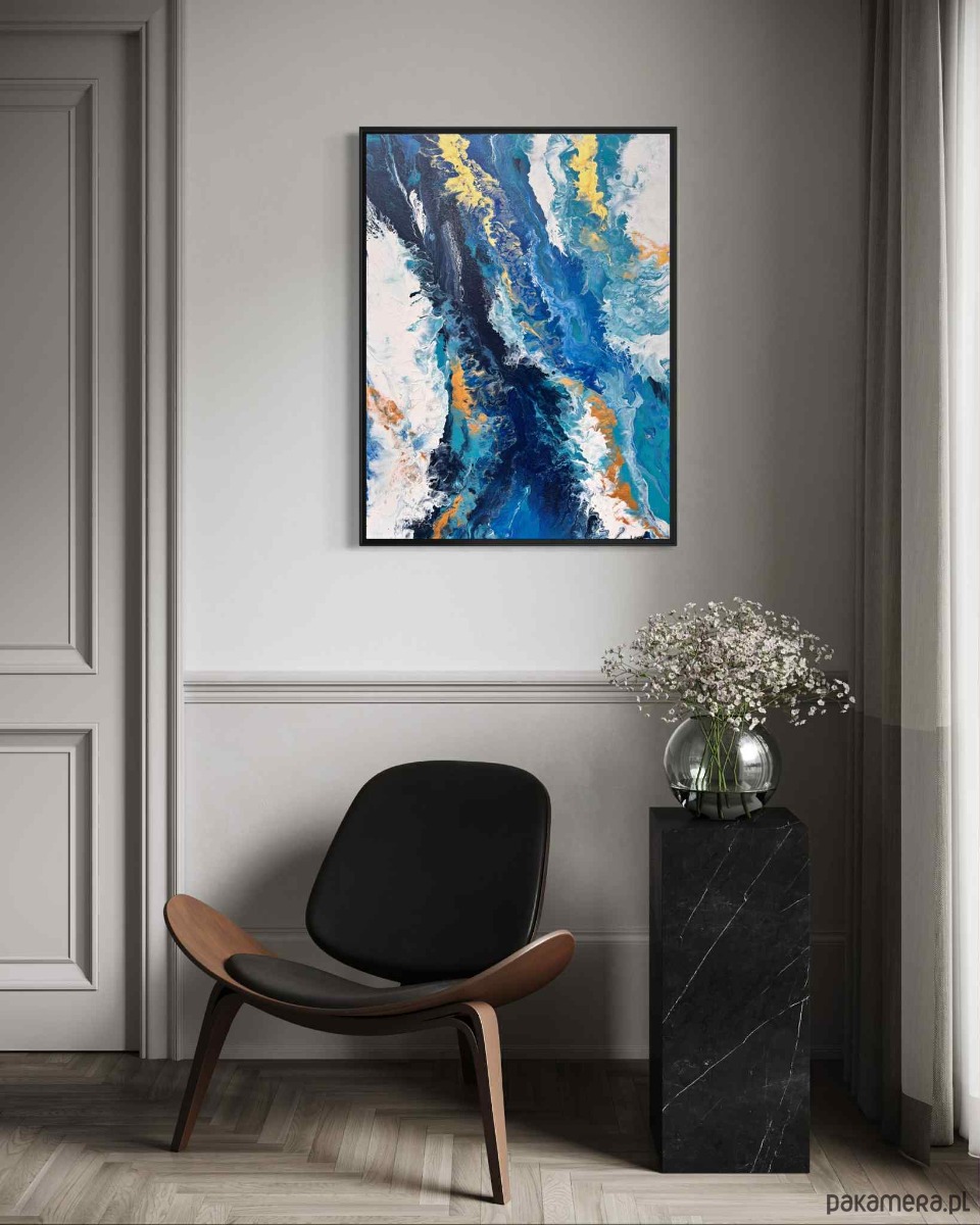 Obraz może przywodzić na myśl naturę w stanie ciągłej zmiany: wodę, lód pękający pod naciskiem, mapę nieznanego lądu lub abstrakcyjny zapis emocji. Całość emanuje ruchem, intensywnością i nowoczesną elegancją. To dzieło, które przyciąga uwagę, budzi emocje i za każdym spojrzeniem może opowiadać inną historię. Świetnie sprawdzi się jako mocny akcent we wnętrzu nowoczesnym, loftowym lub minimalistycznym, nadając przestrzeni głębi i charakteru.