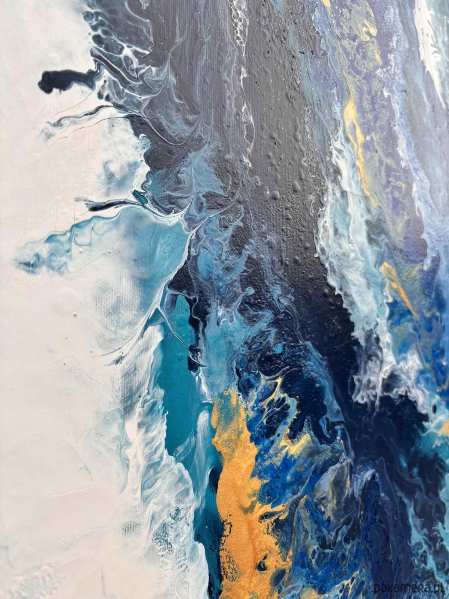 Układ form przypomina ruch wody: wiry, prądy i spienione fale, jakby fragment oceanu widziany z lotu ptaka albo zderzenie dwóch potężnych mas żywiołu. Ciemniejsze partie tworzą wrażenie głębi i tajemnicy, podczas gdy jasne, niemal mleczne obszary wprowadzają oddech i kontrast, równoważąc intensywność barw. Złote linie i plamy działają jak energetyczne żyły – prowadzą wzrok przez całą powierzchnię płótna, sugerując przepływ, transformację i wewnętrzną siłę.