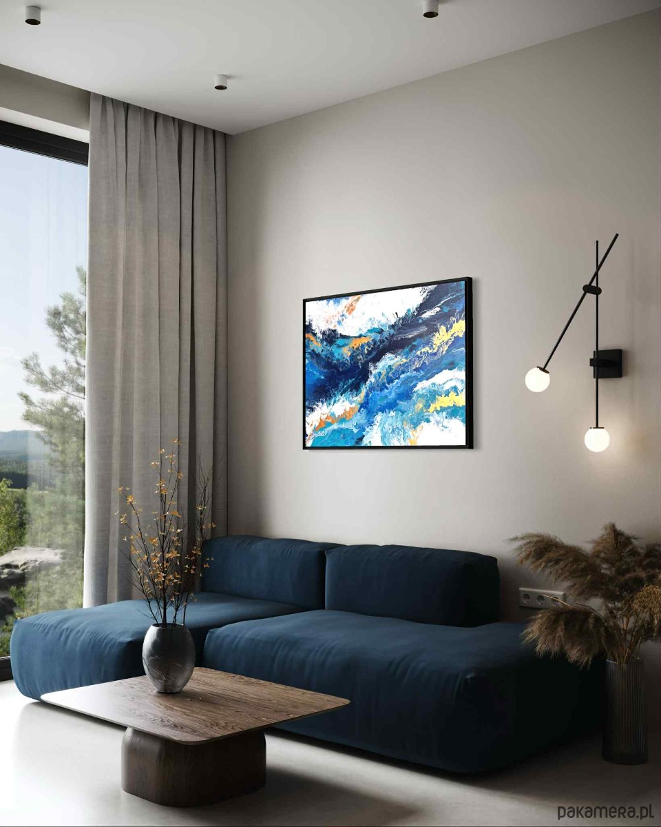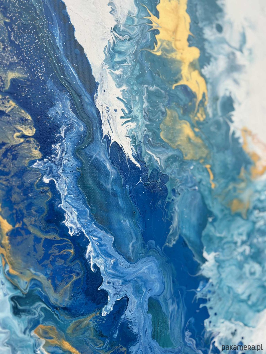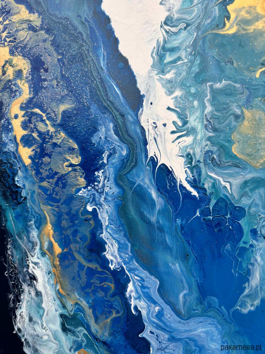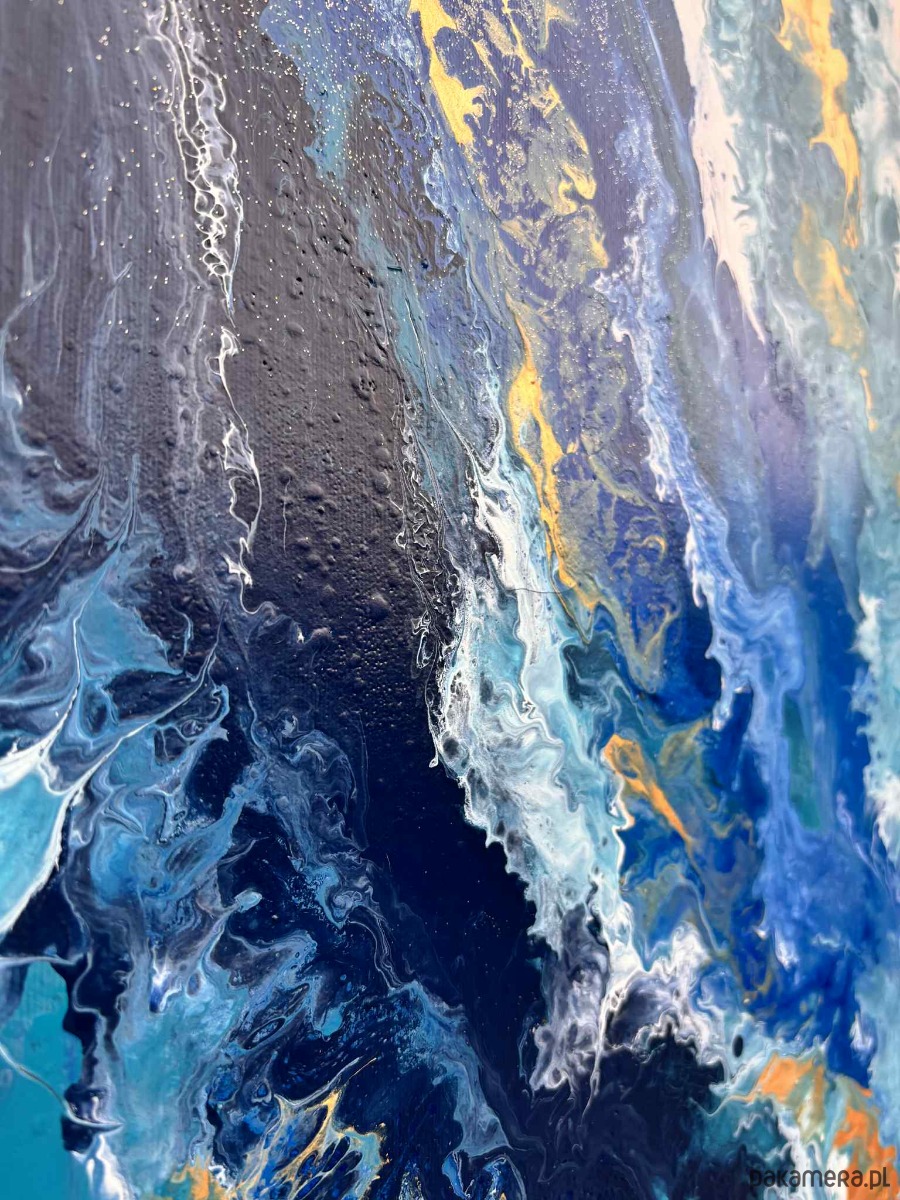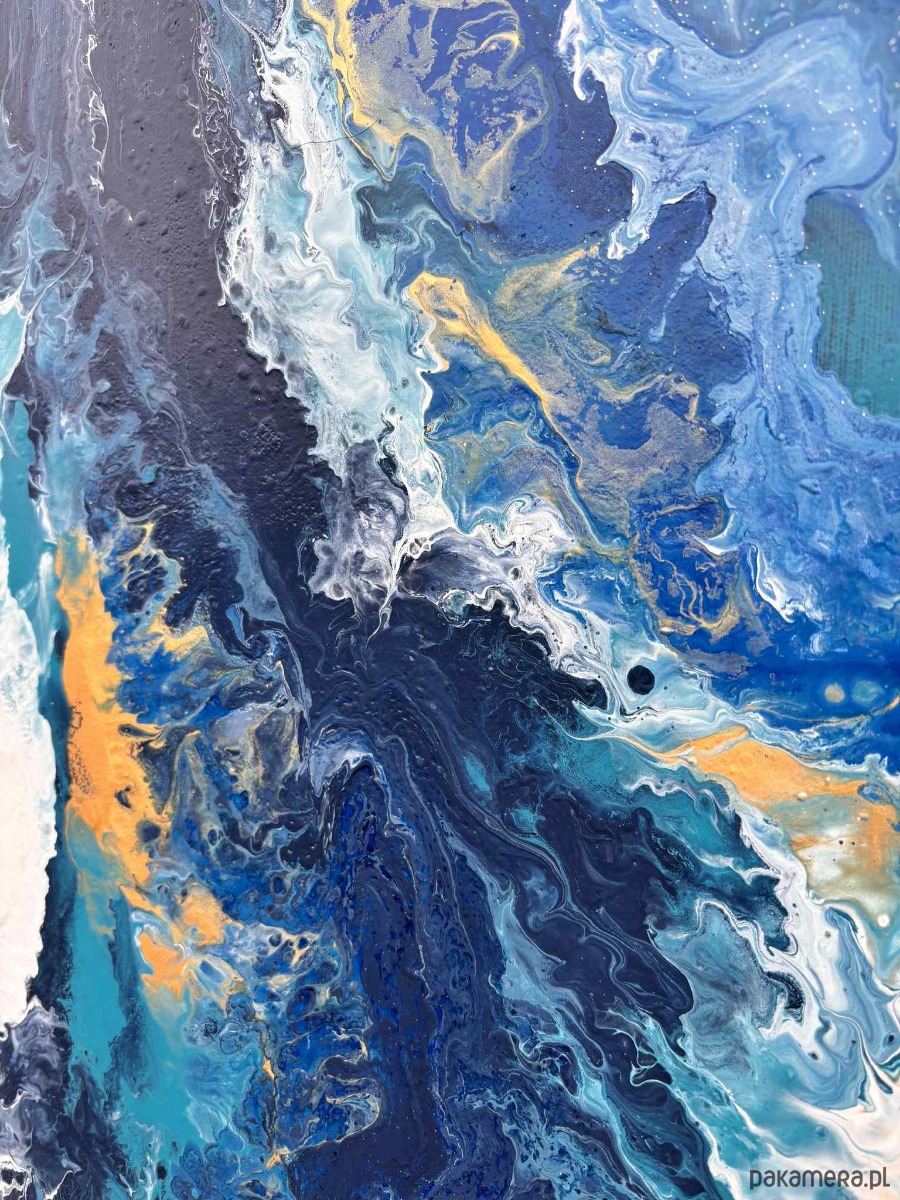 To obraz abstrakcyjny o bardzo dynamicznym, żywiołowym charakterze, wykonany w technice płynnych przejść i organicznych rozlań farby. Dominują w nim głębokie odcienie granatu i nasyconego błękitu, przełamane jaśniejszymi tonami turkusu, bieli i delikatnych szarości.