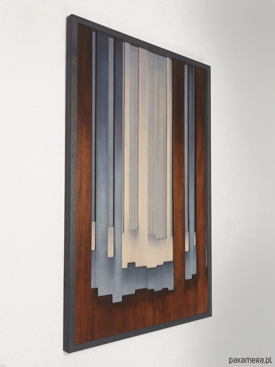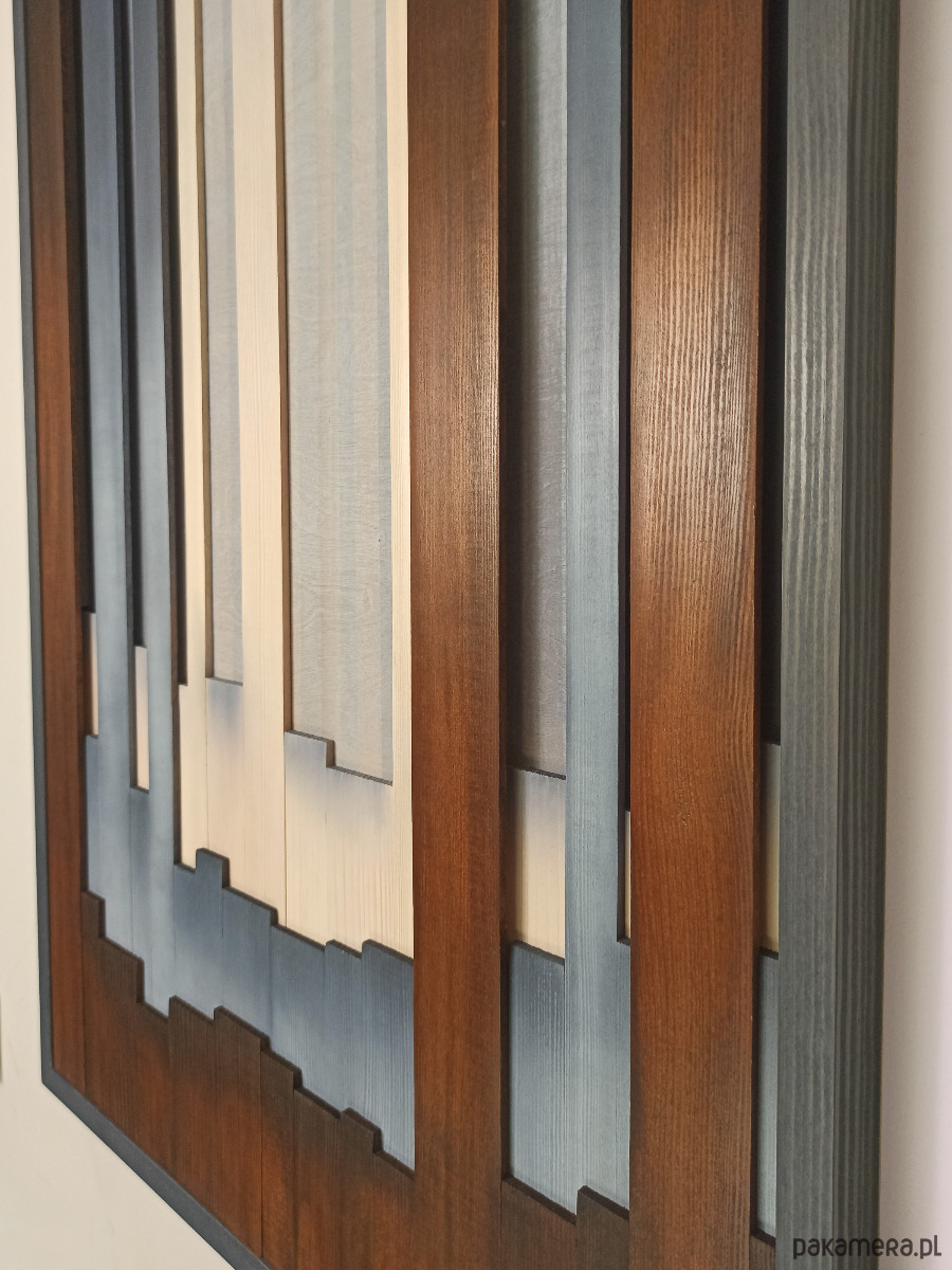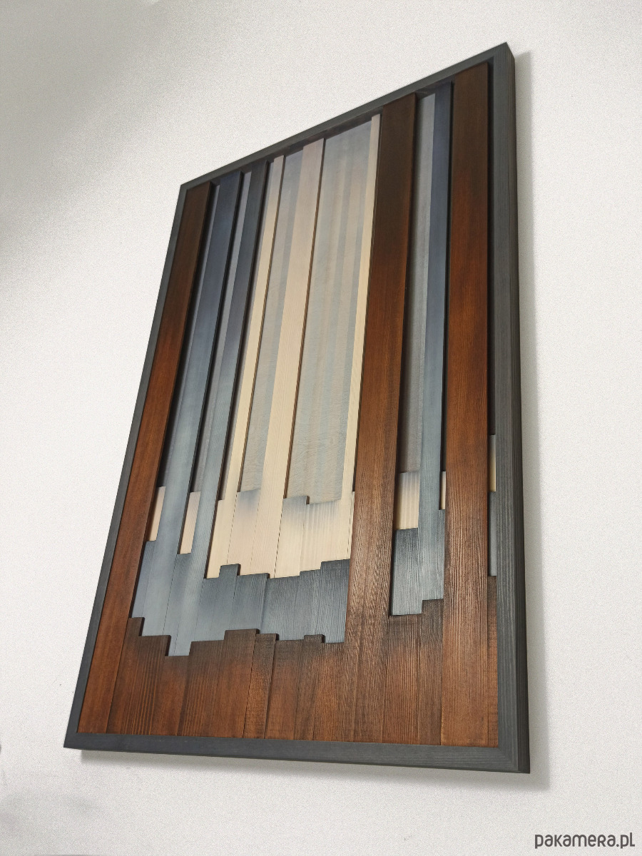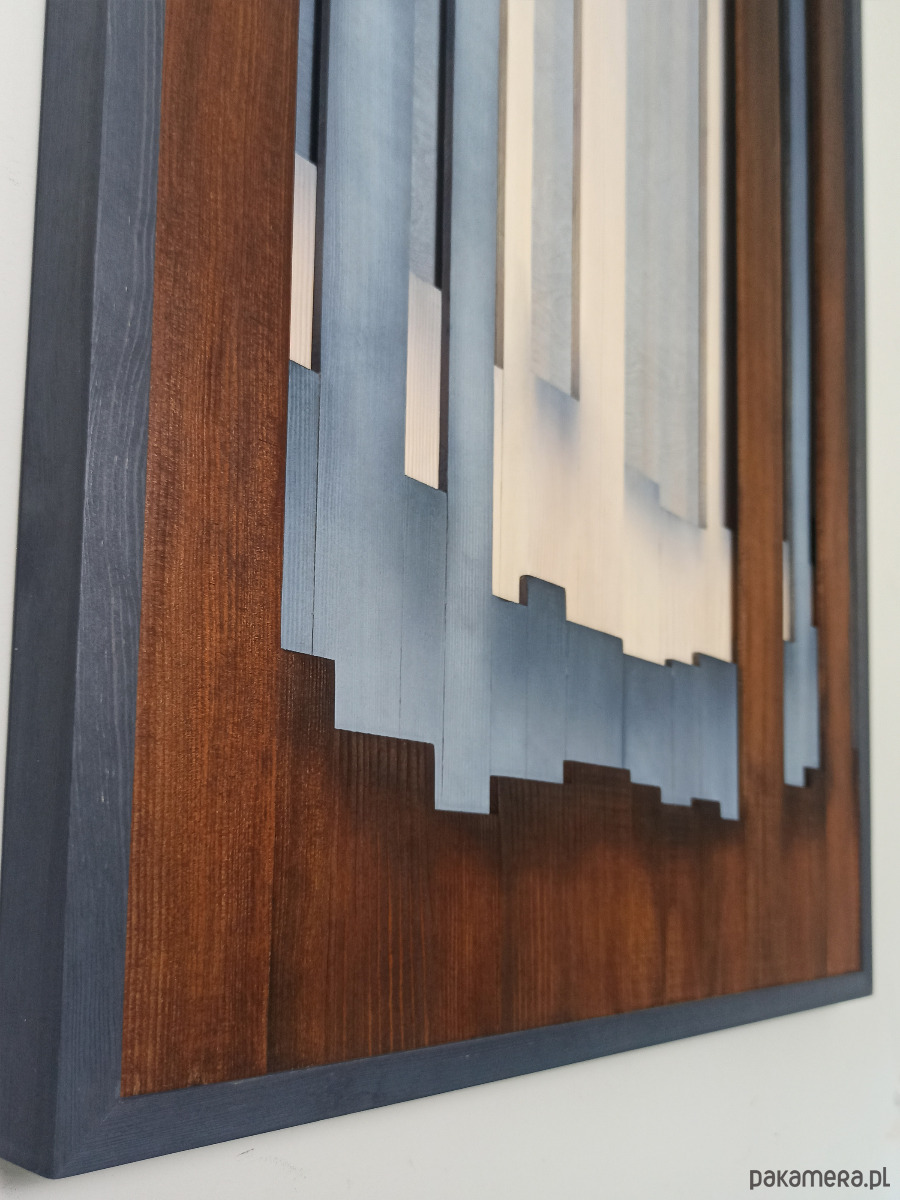 Każdy element tej kompozycji został precyzyjnie wycięty, wyszlifowany i zabarwiony, a następnie przyklejony na na malowanym tle. Warstwowe ułożenie elementów nadaje kompozycji głębi i trójwymiarowego efektu, który przyciąga wzrok. Wykończenie wysokiej jakości olejowoskiem podkreśla naturalną strukturę drewna i zabezpiecza je na długie lata.
