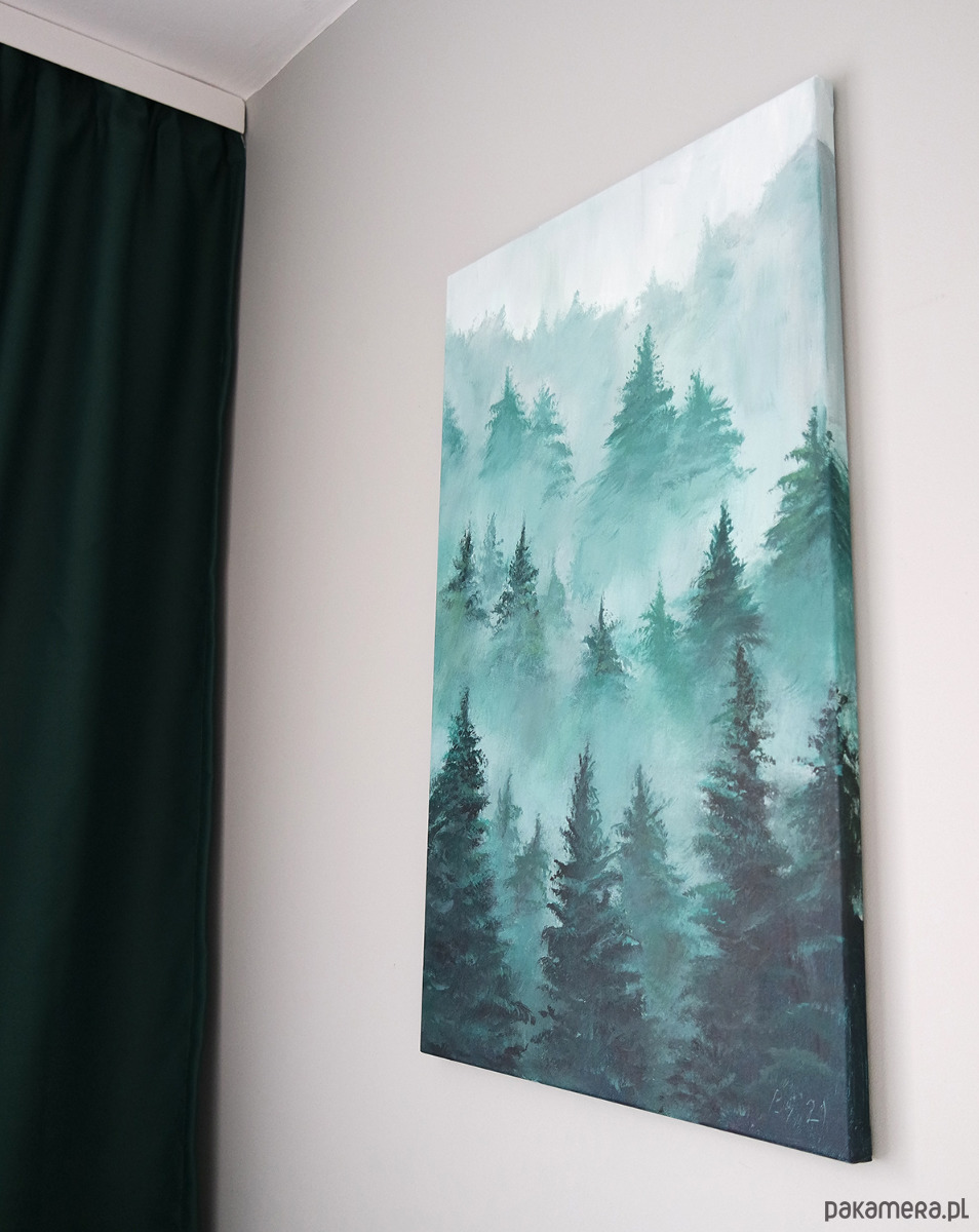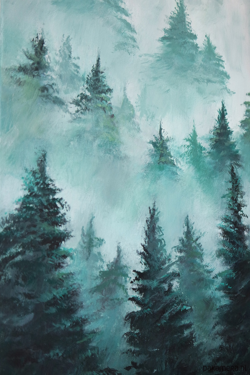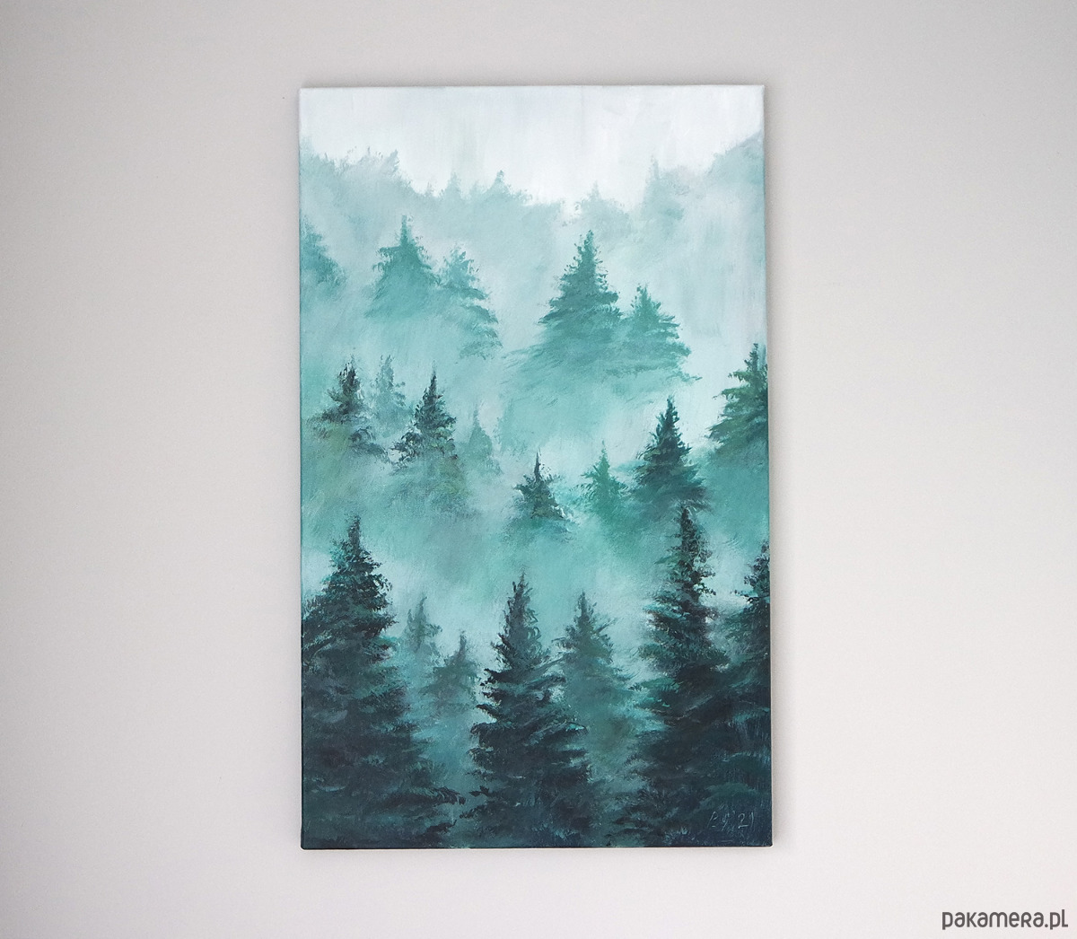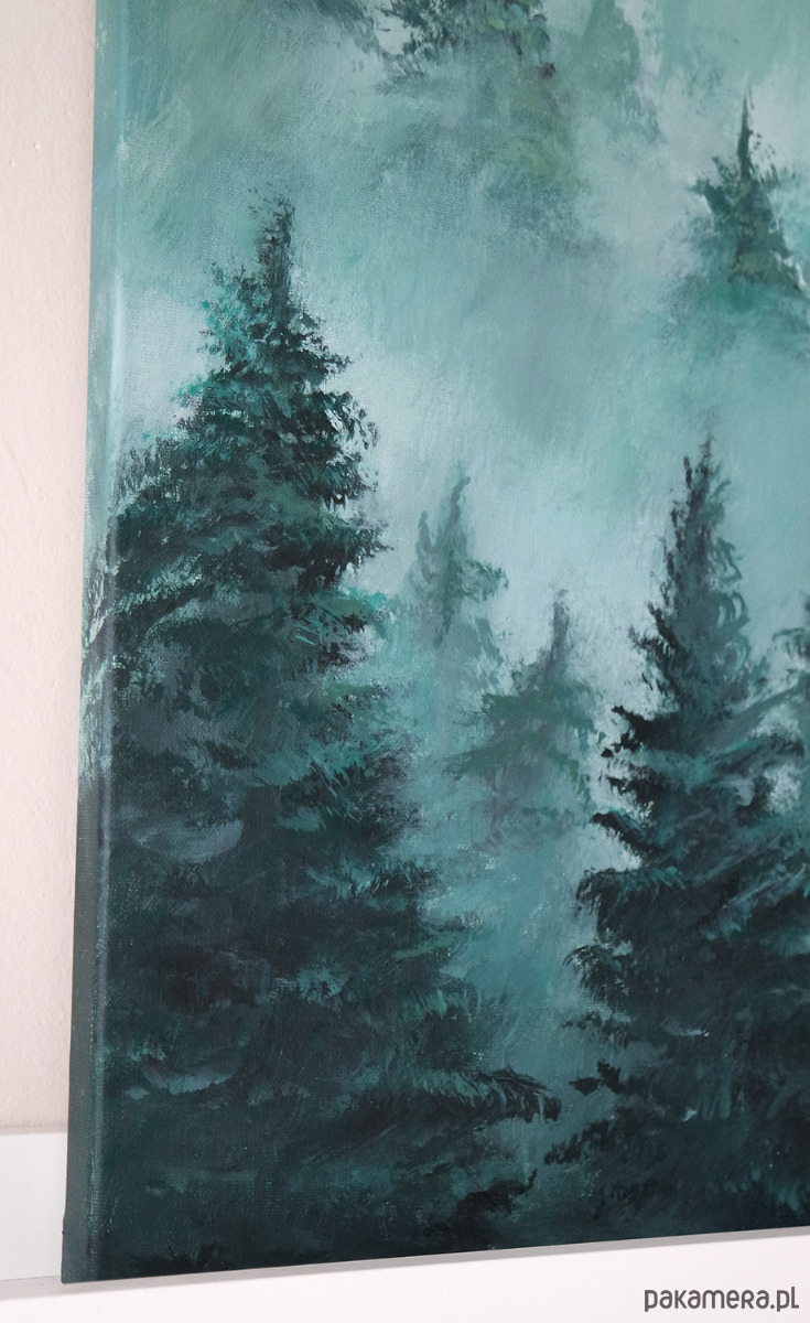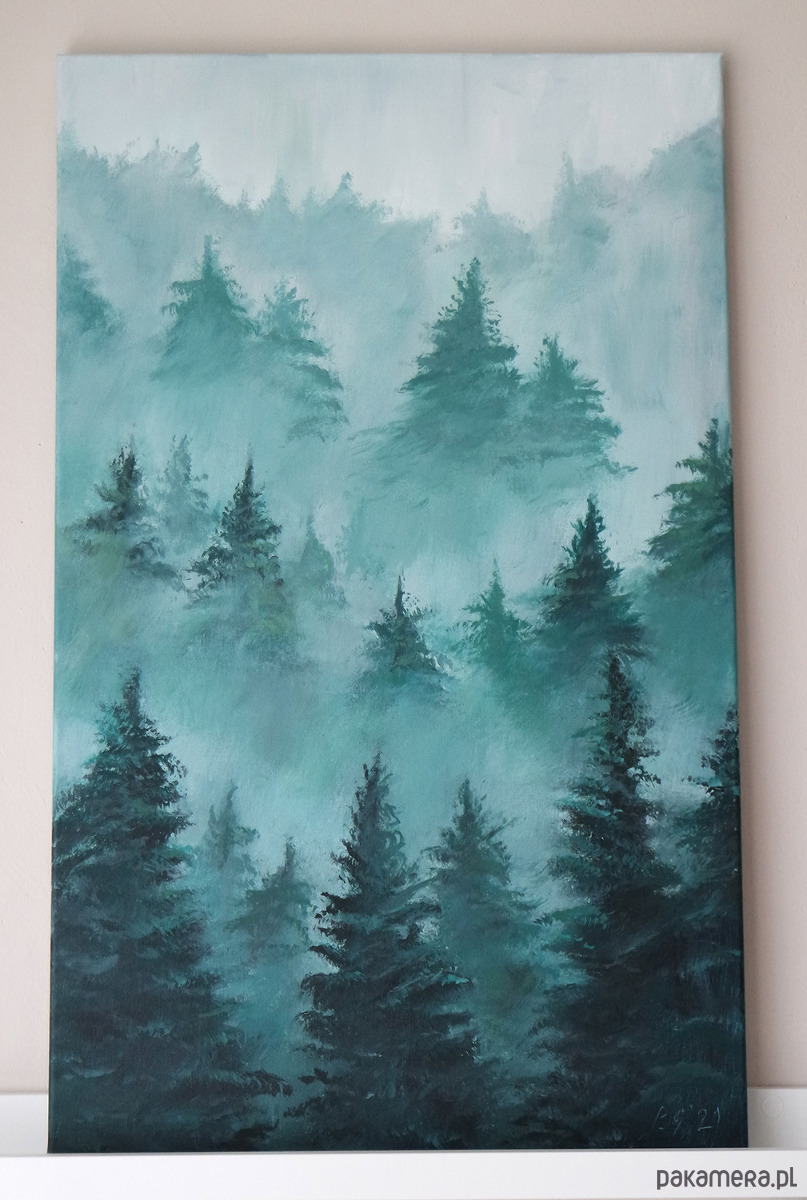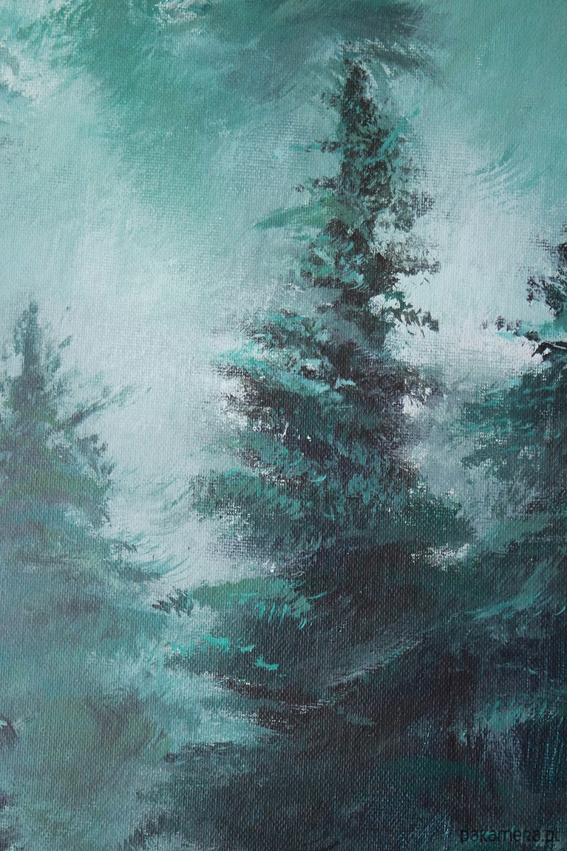 Obraz namalowany jest farbami akrylowymi na płótnie.