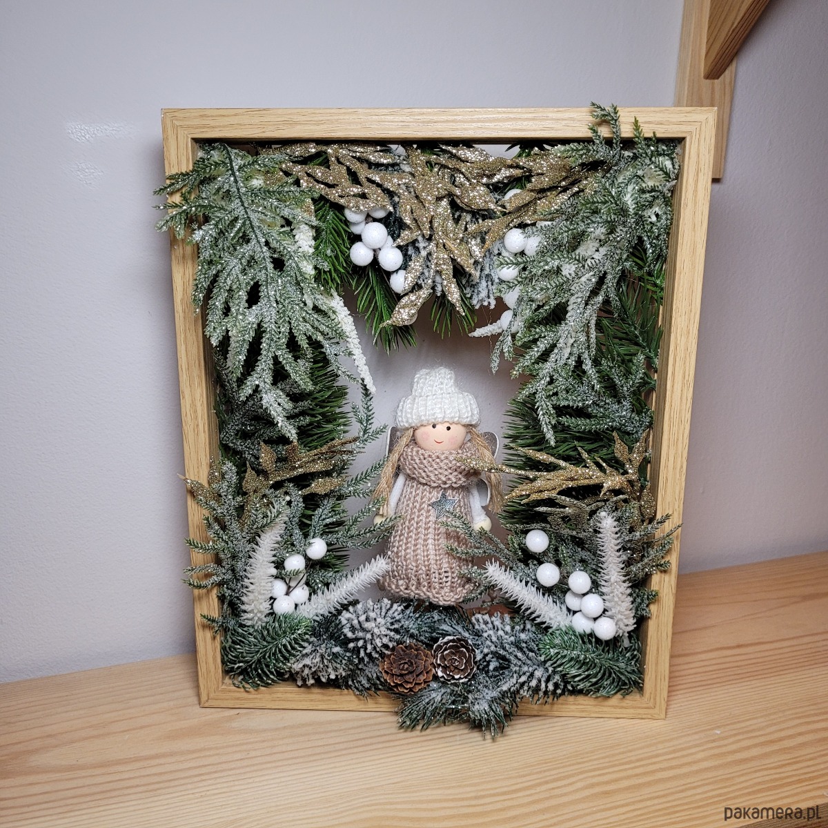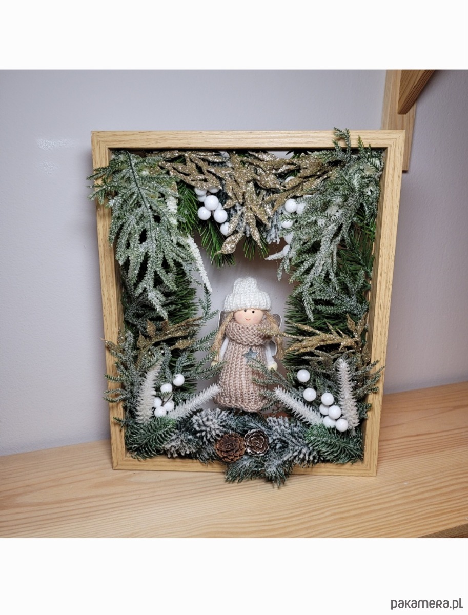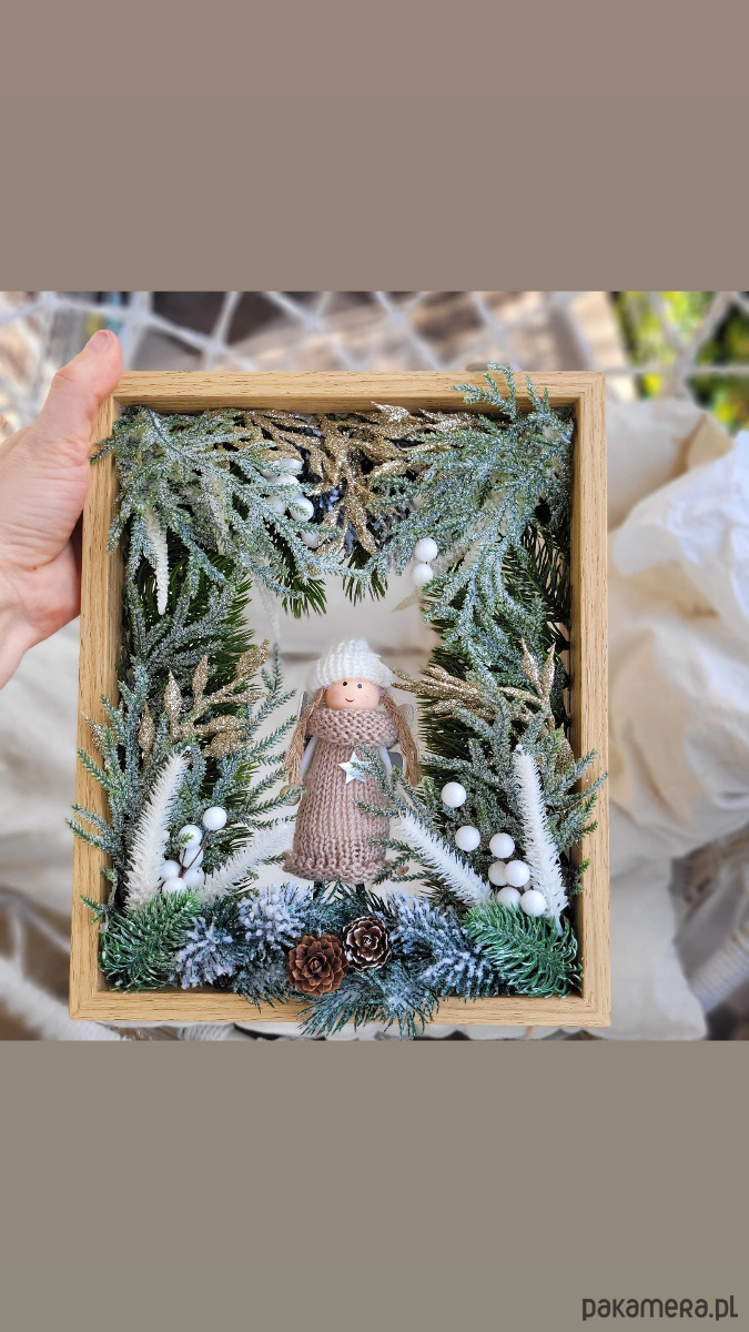 W drewnianej ramce własnoręcznie ułożyłam zimową kompozycję: ośnieżone gałązki, dekoracyjne jagódki, szyszki i uroczą laleczkę w ciepłym, dzianym stroju.