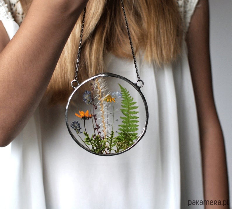 Szkło i suszone kwiaty oprawione w cynę. Każdy przedmiot jest wykonany ręcznie, dlatego jest niepowtarzalny. Zdjęcia pokazują przykładowy przedmiot.