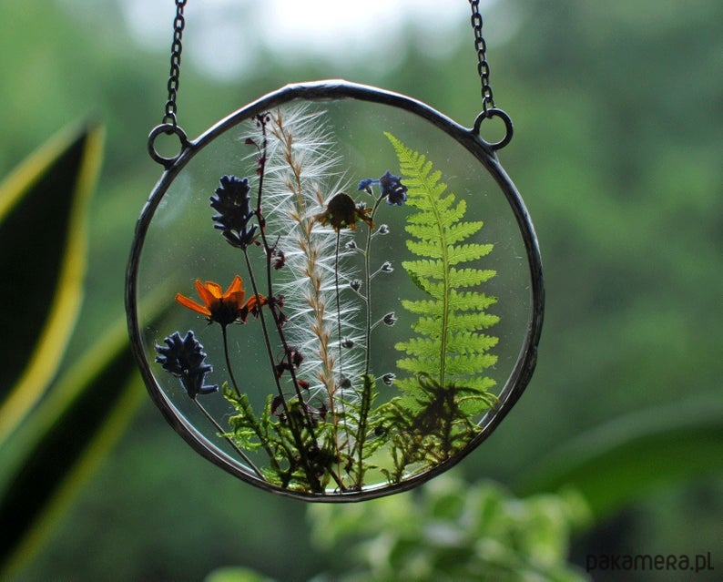 Szkło i suszone kwiaty oprawione w cynę. Każdy przedmiot jest wykonany ręcznie, dlatego jest niepowtarzalny. Zdjęcia pokazują przykładowy przedmiot.