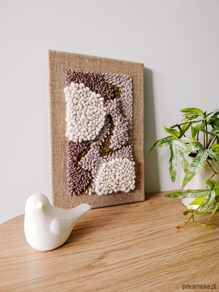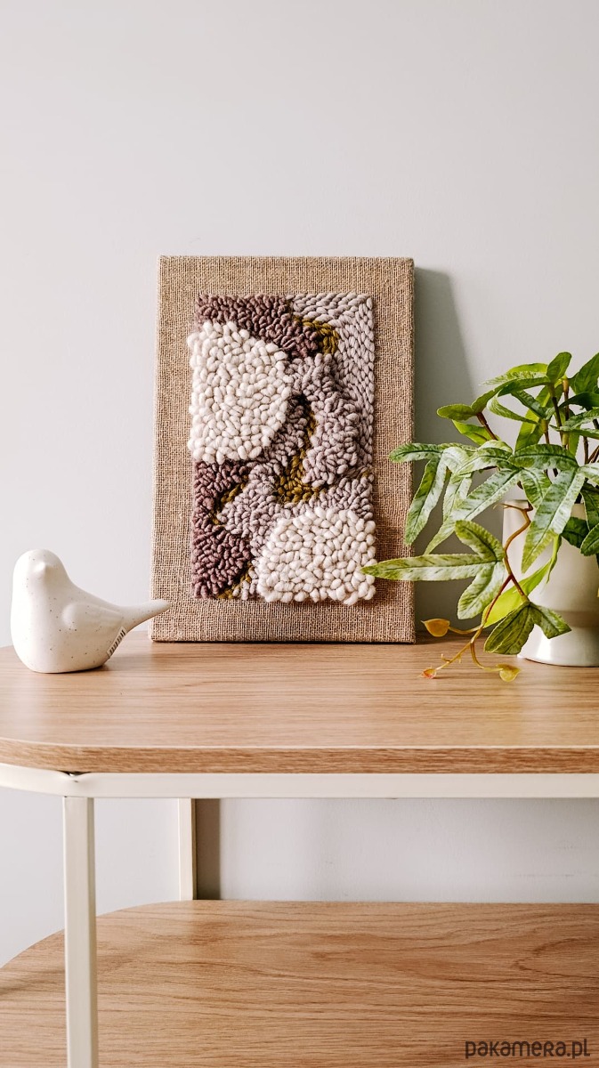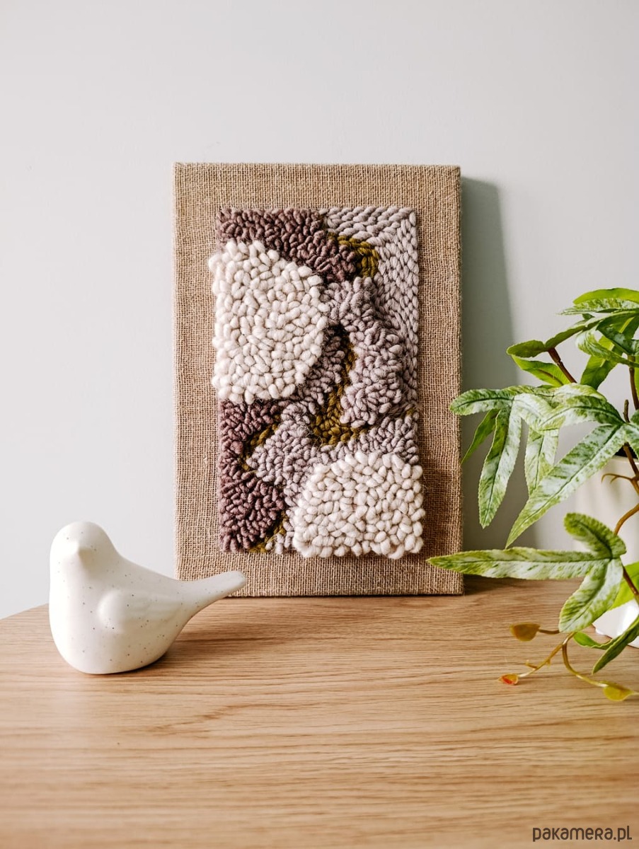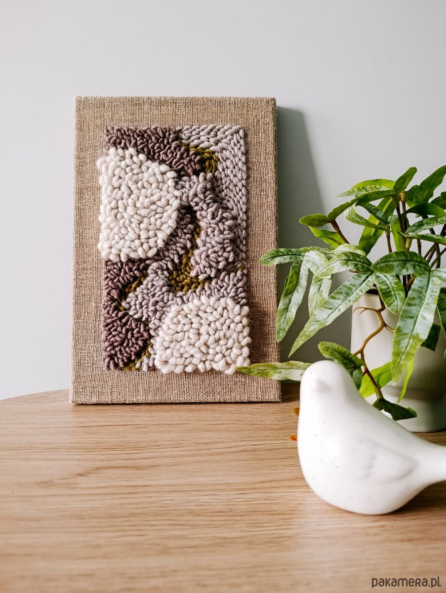 Obraz tekstylny "Miniatura z Podhala" to spokojny akcent do wnętrz, w których liczy się uważność i naturalność. Powstał w całości ręcznie, w technice punch needle, z wykorzystaniem naturalnej wełny, lnianej tkaniny i drewnianej ramki.