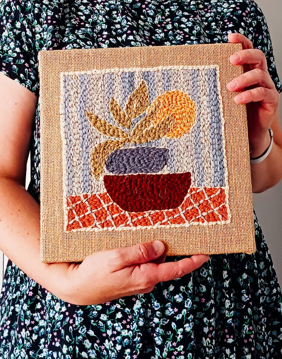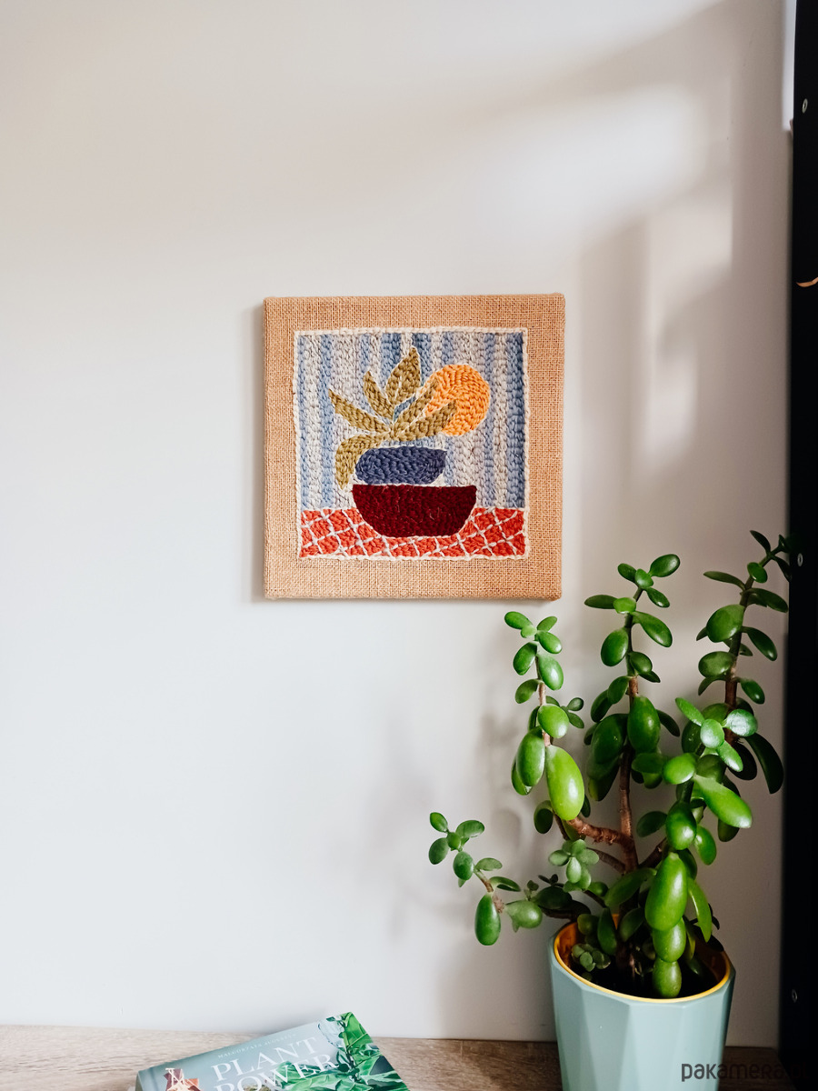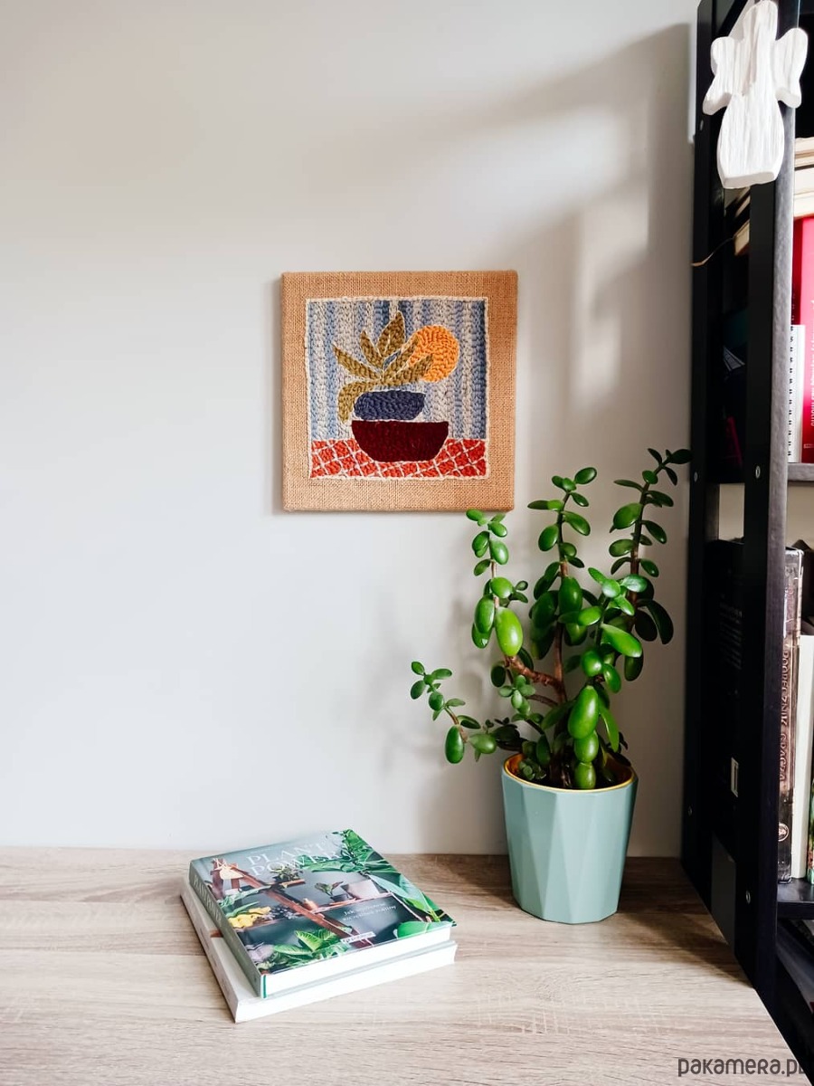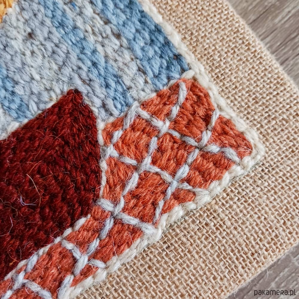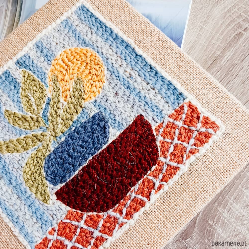 Obrazek wykonałam w technice punch needle (haftu pętelkowego) wełnianą surową przędzą na naturalnej jucie. Jest szorstki w dotyku, co nadaje mu wyjątkowego charakteru.