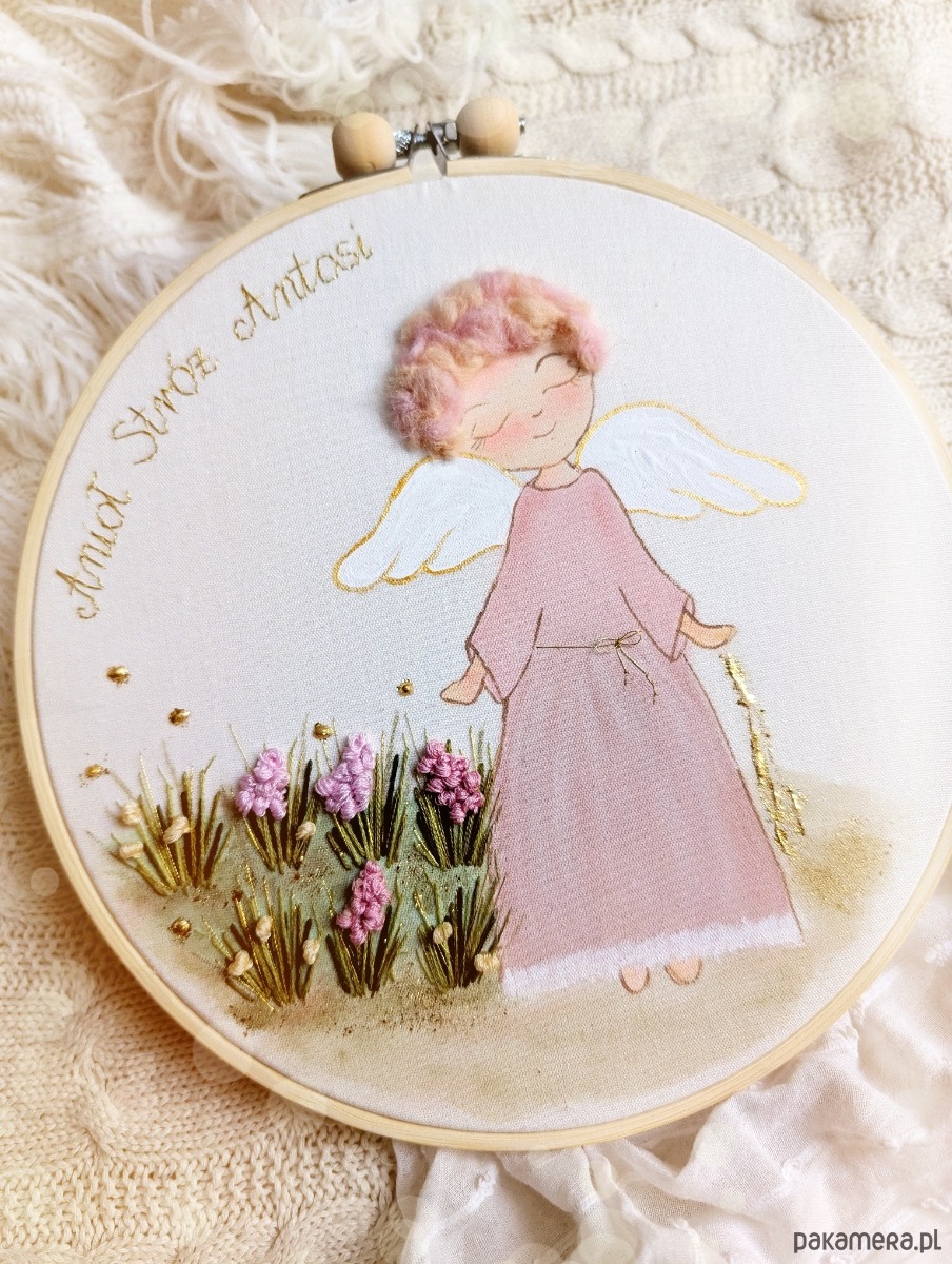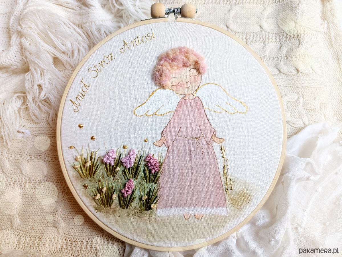 Anioł został namalowany farbami akwarelowymi na płótnie bawełnianym.