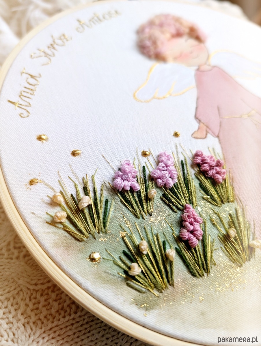 Obrazek z aniołem stróżem na haftowanej łące, pamiątka Chrztu