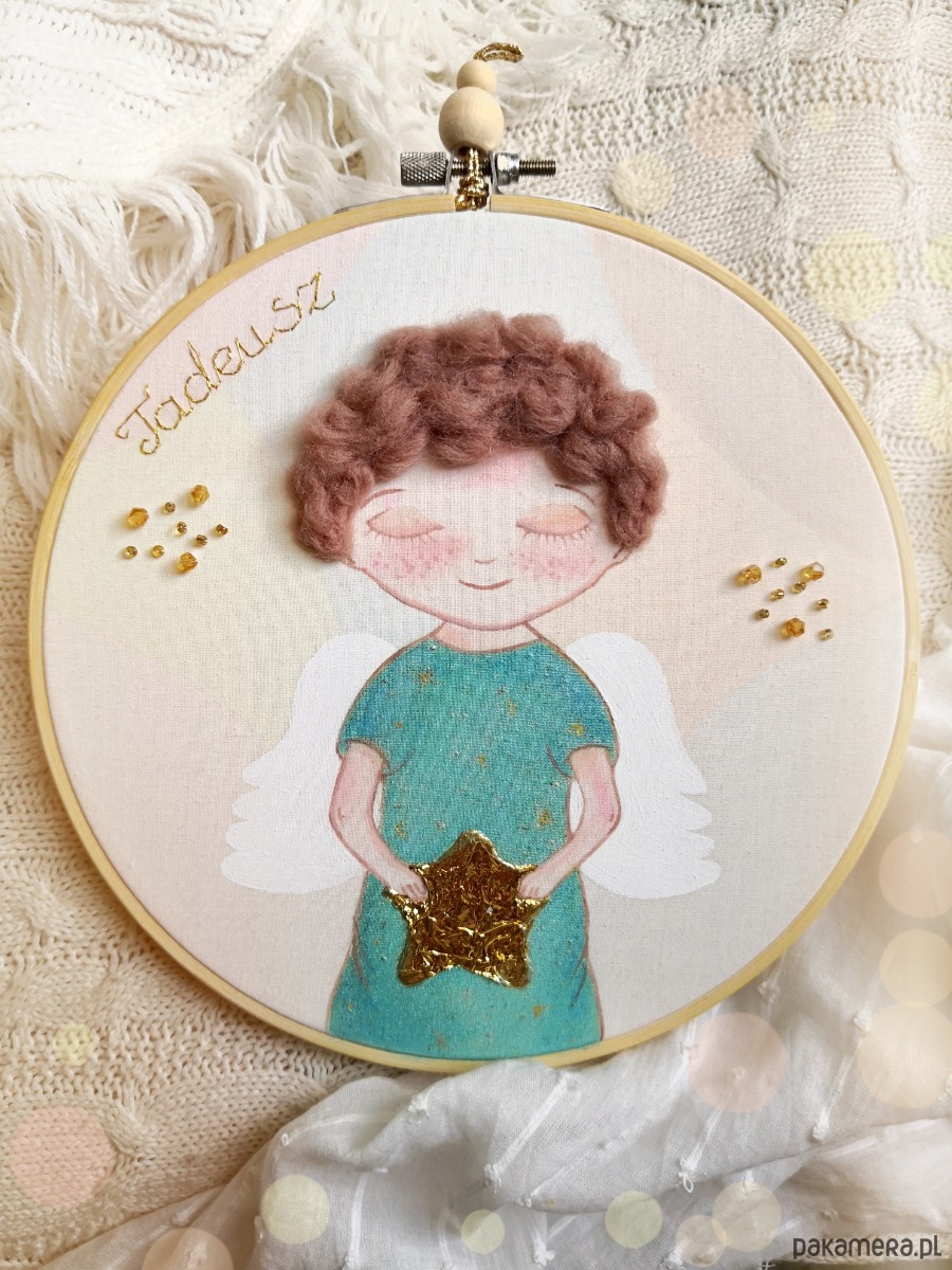 Efekt 3D tworzą włoski aniołka i elementy wykonane hafem ręcznym.