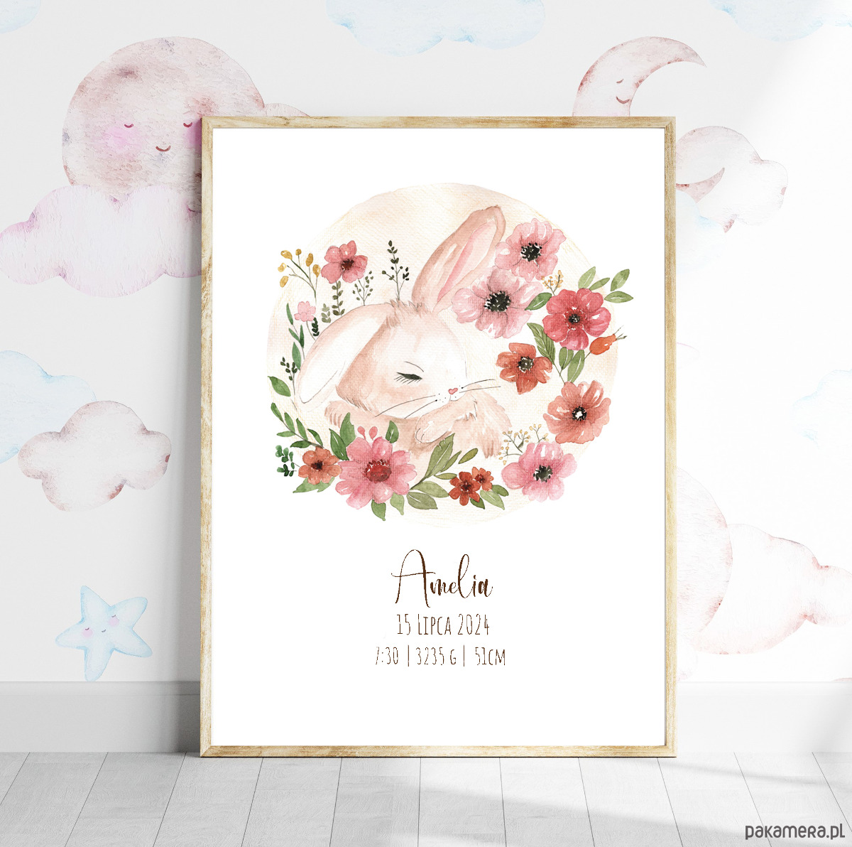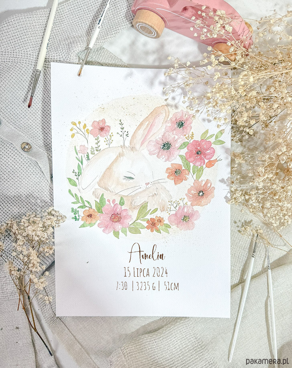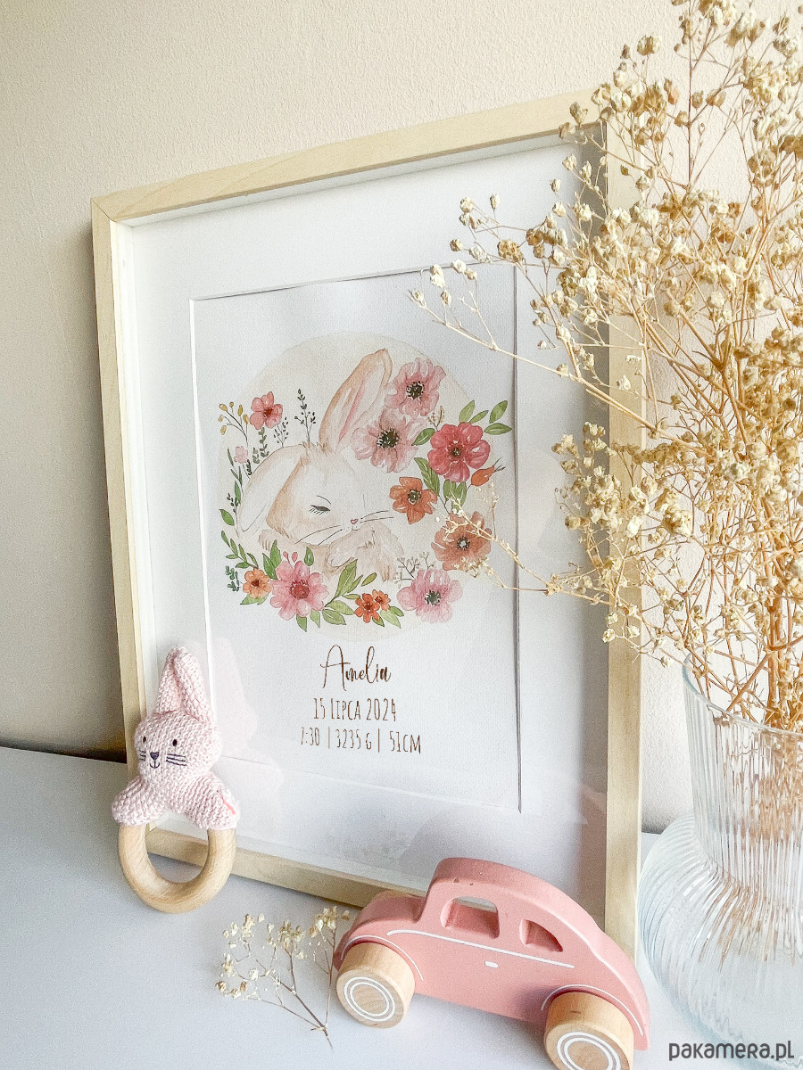 Obrazek z króliczkiem, metryczka dla dziewczynki, prezent na pierwsze urodziny