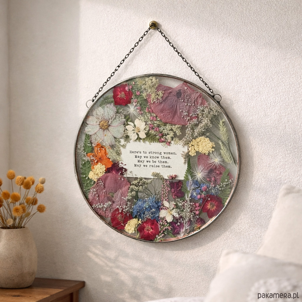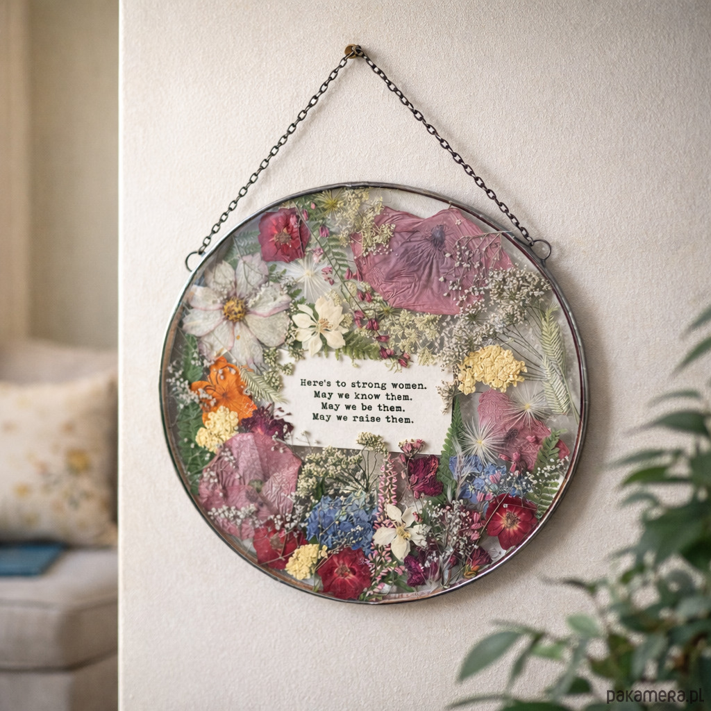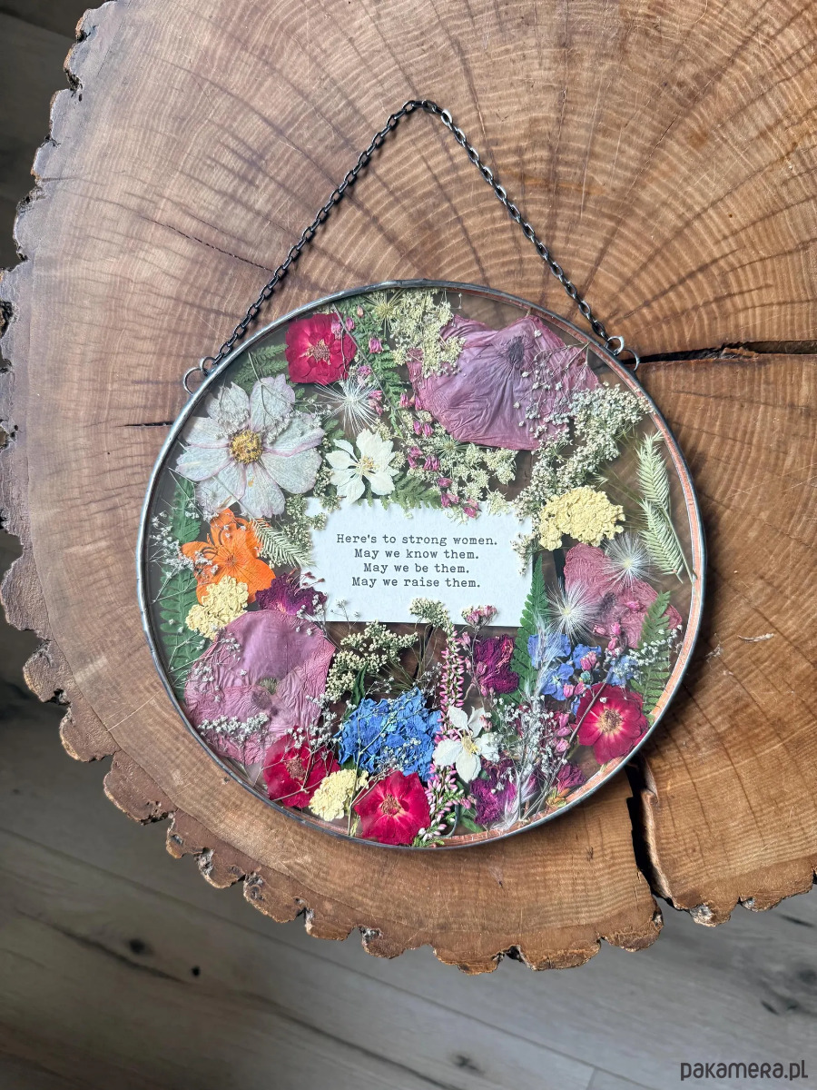 Ręcznie wykonany dekor ścienny 22 cm z suszonymi kwiatami i tekstem – prezent premium.