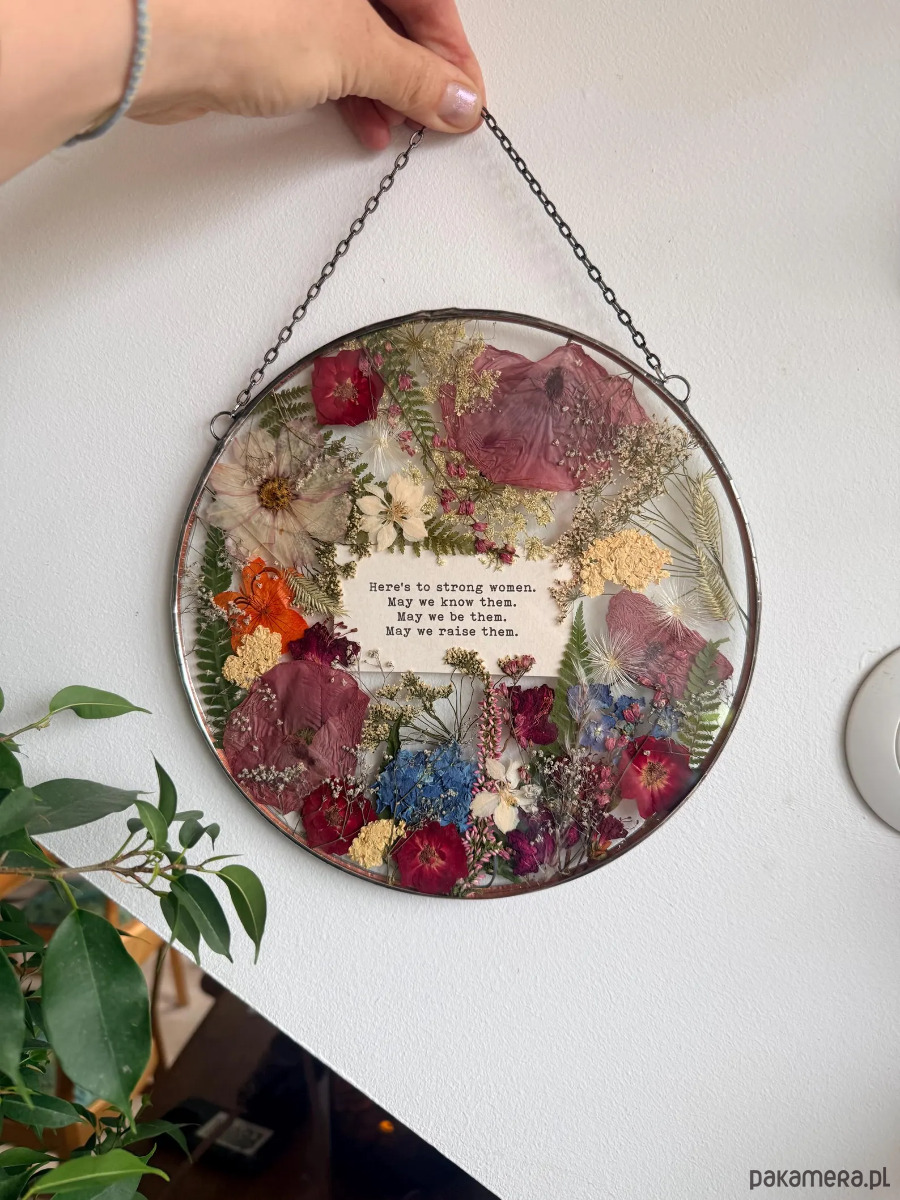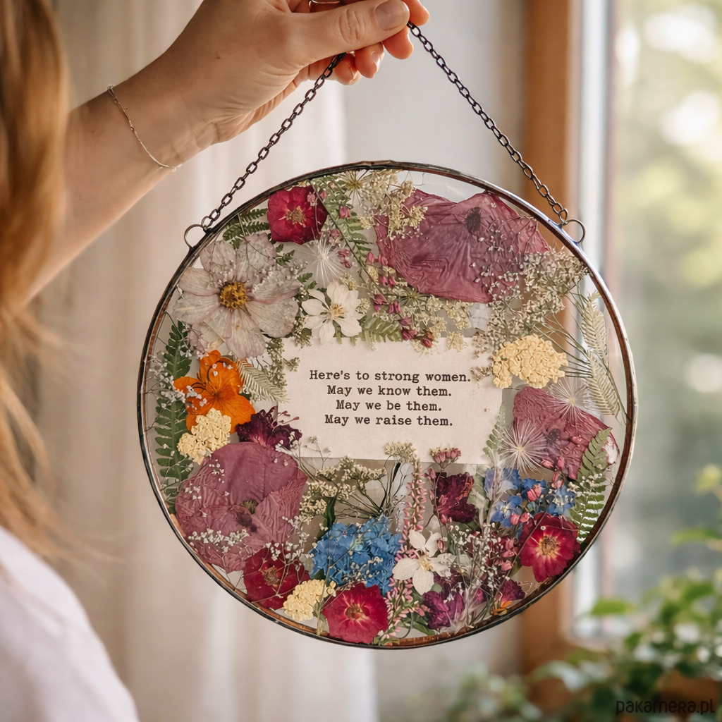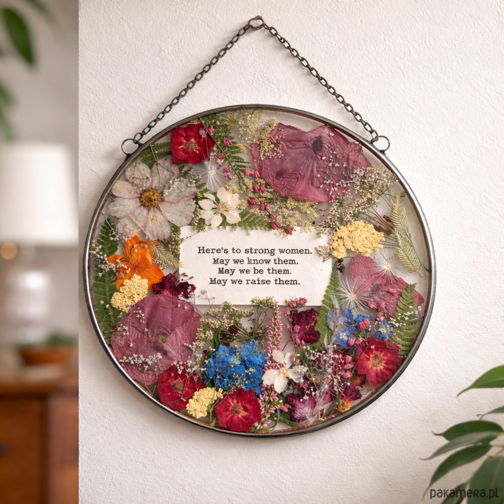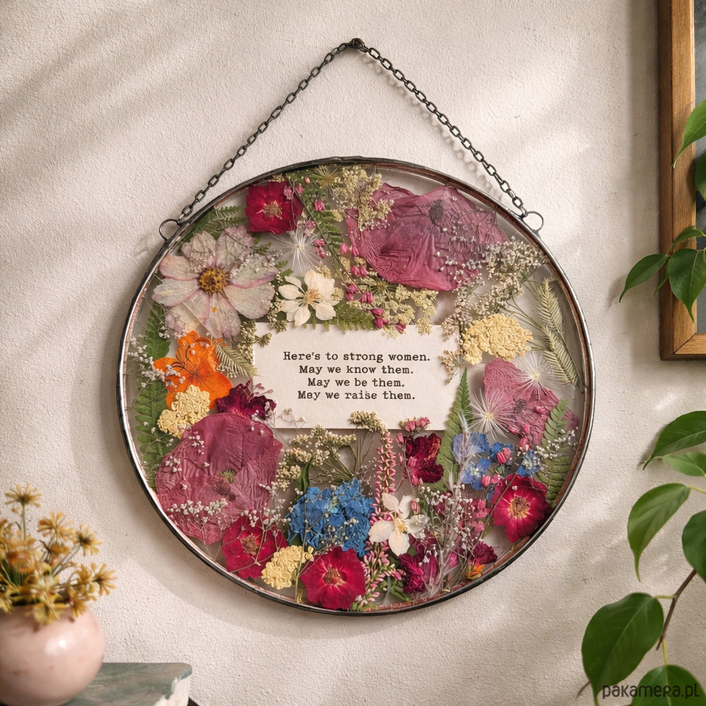 Ręcznie wykonany dekor ścienny 22 cm z suszonymi kwiatami i tekstem – prezent premium.