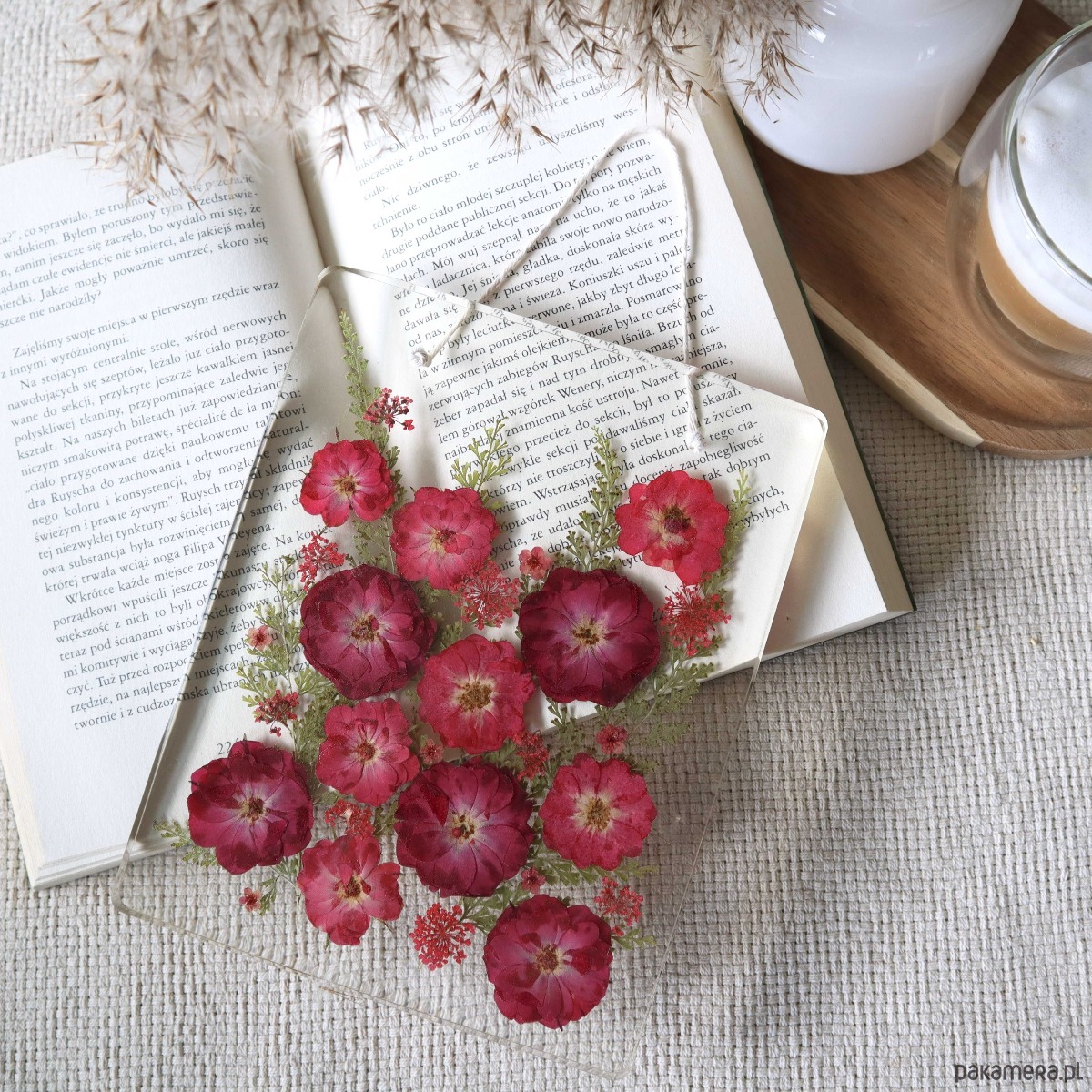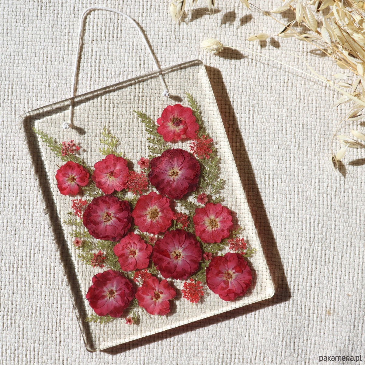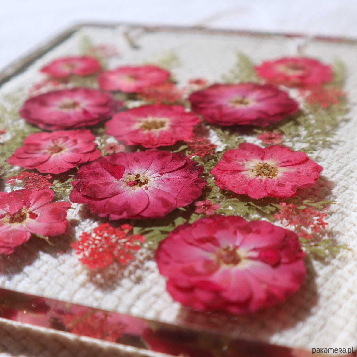Obrazek ze sprasowanymi i naturalnymi kwiatami zatopionymi w żywicy epoksydowej.