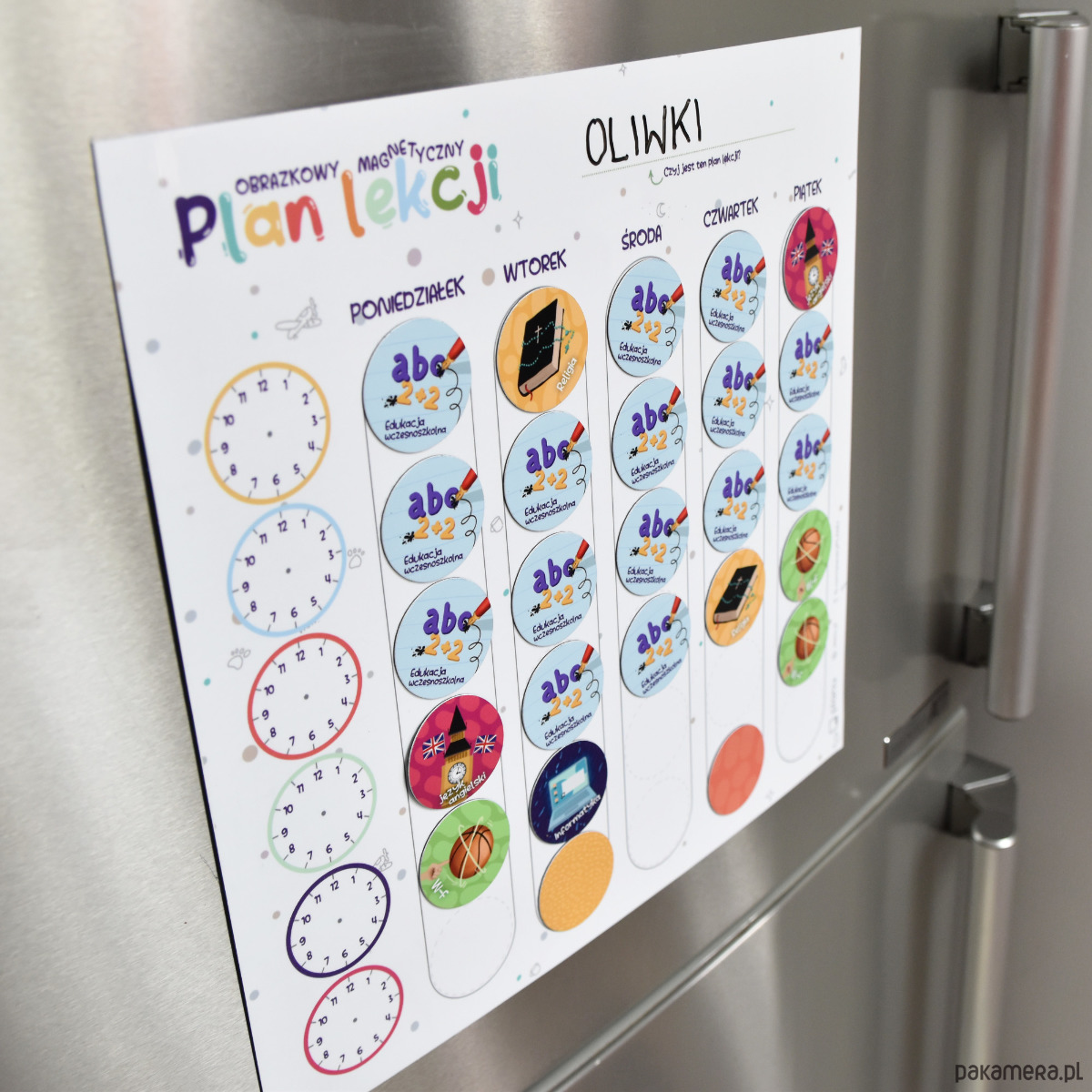 Plan lekcji złożony z pięknie ilustrowanych, kolorowych magnesów.