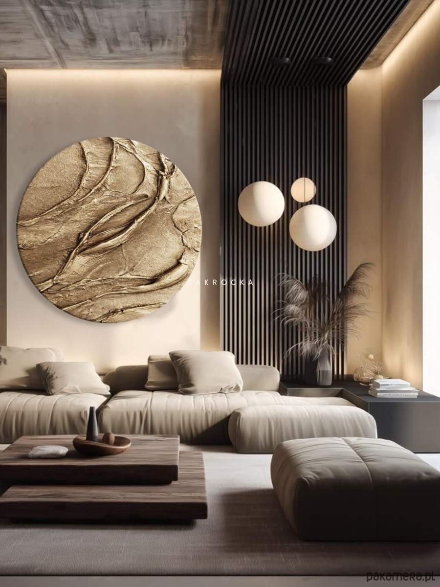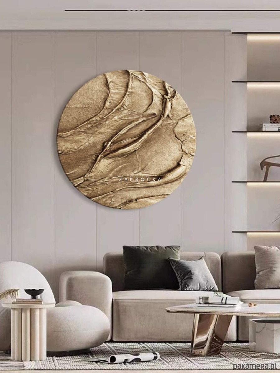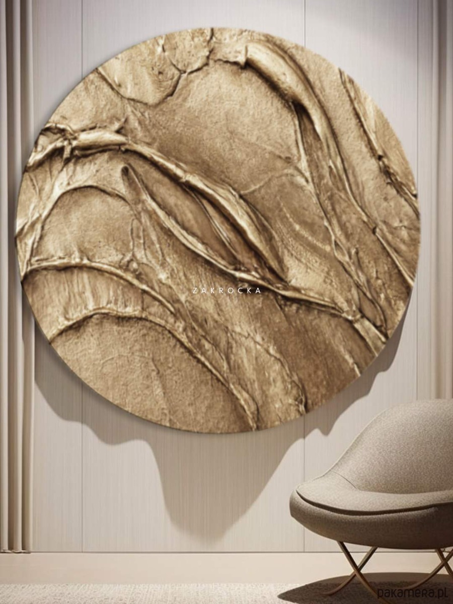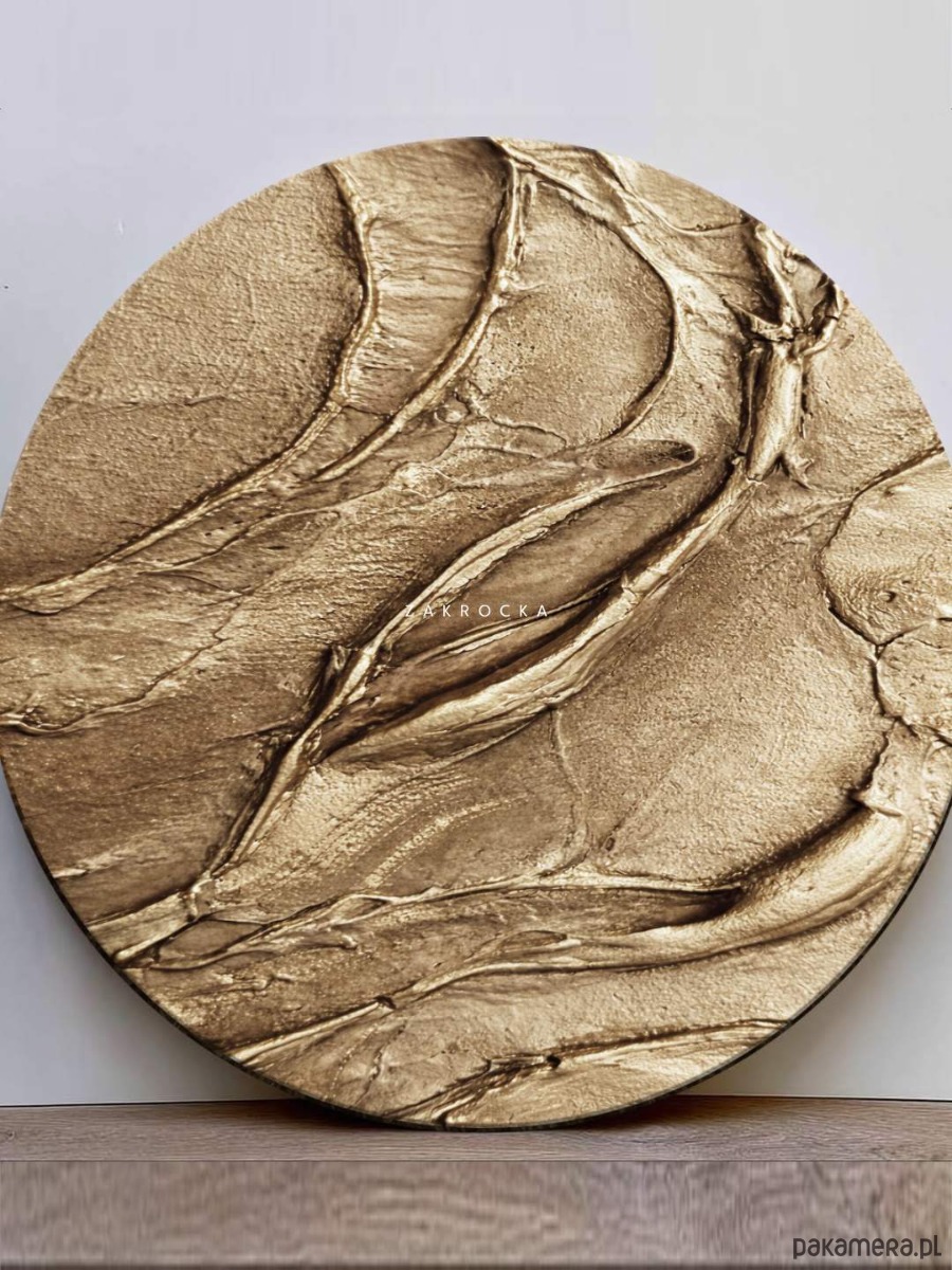 Ten okrągły obraz strukturalny przyciąga uwagę subtelną grą światła i faktury. Delikatne, organiczne linie układają się w harmonijną kompozycję, przypominającą naturalne formy ziemi lub falujące piaski. Ciepła, metaliczna kolorystyka sprawia, że obraz doskonale wpisuje się w nowoczesne wnętrza, dodając im elegancji i spokoju.
