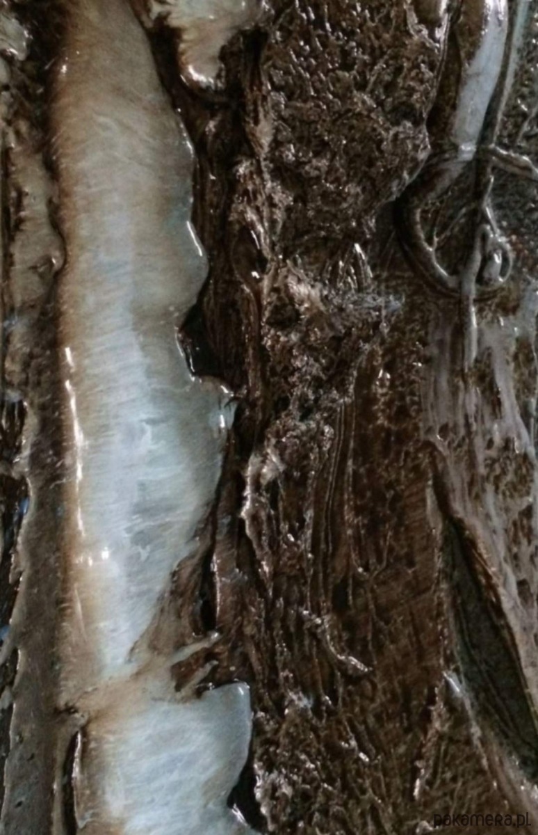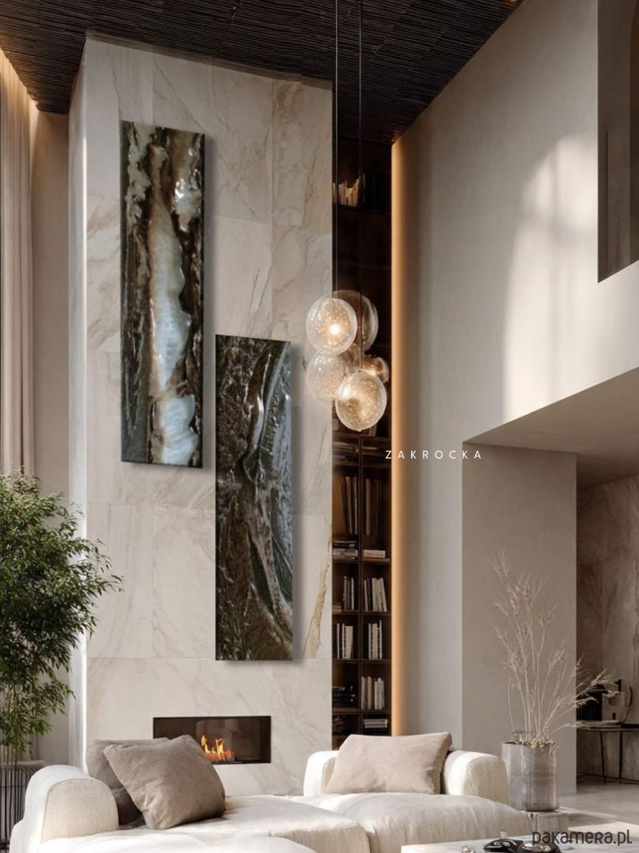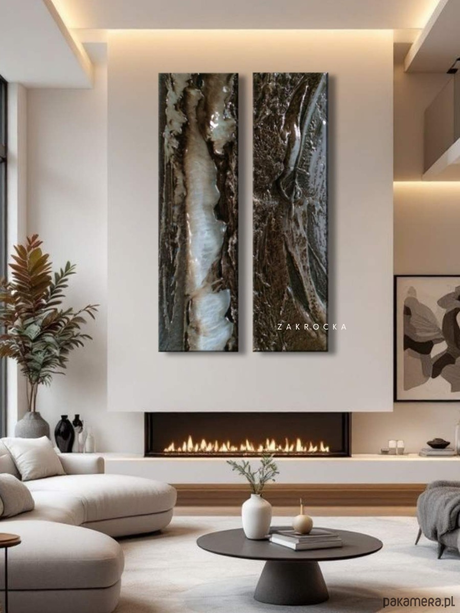 Ten obraz strukturalny przyciąga spojrzenie swoją głębią i organiczną formą. Dominują tu odcienie ciepłego brązu, przełamane mleczną bielą i subtelnym połyskiem jak perła, który pięknie pracuje ze światłem. Podłużny dyptyk idealnie sprawdzi się w wysokich wnętrzach – nad sofą, w klatce schodowej czy w nowoczesnym holu. Możesz powiesić elementy razem lub rozdzielić je, tworząc własną kompozycję dopasowaną do przestrzeni.
