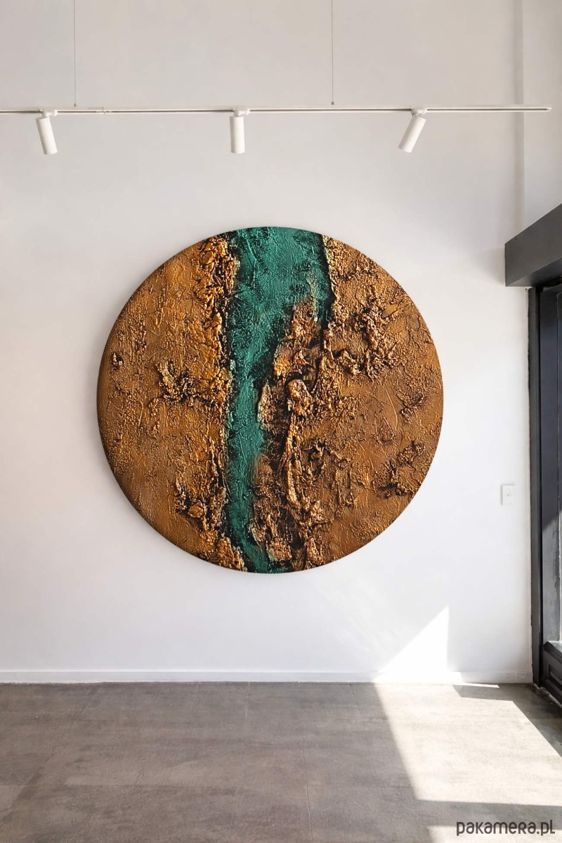 Obrazy okrągłe z wyraznym reliefem złoto szmaragd model 120326