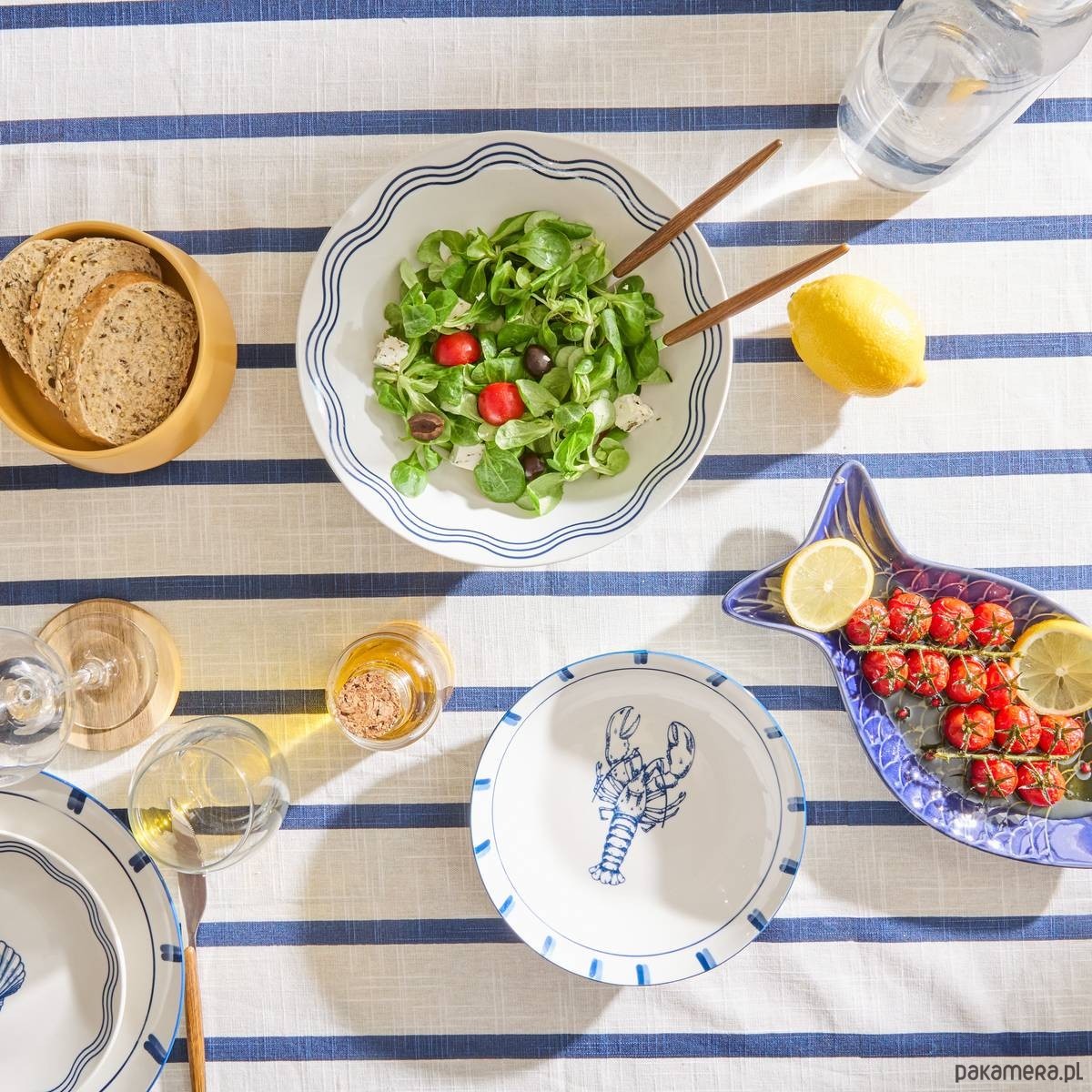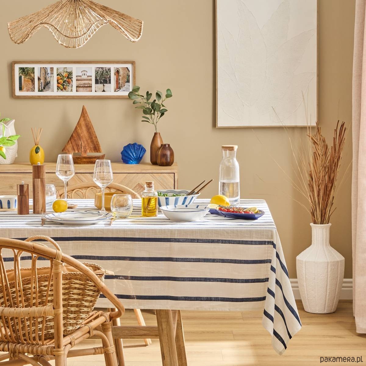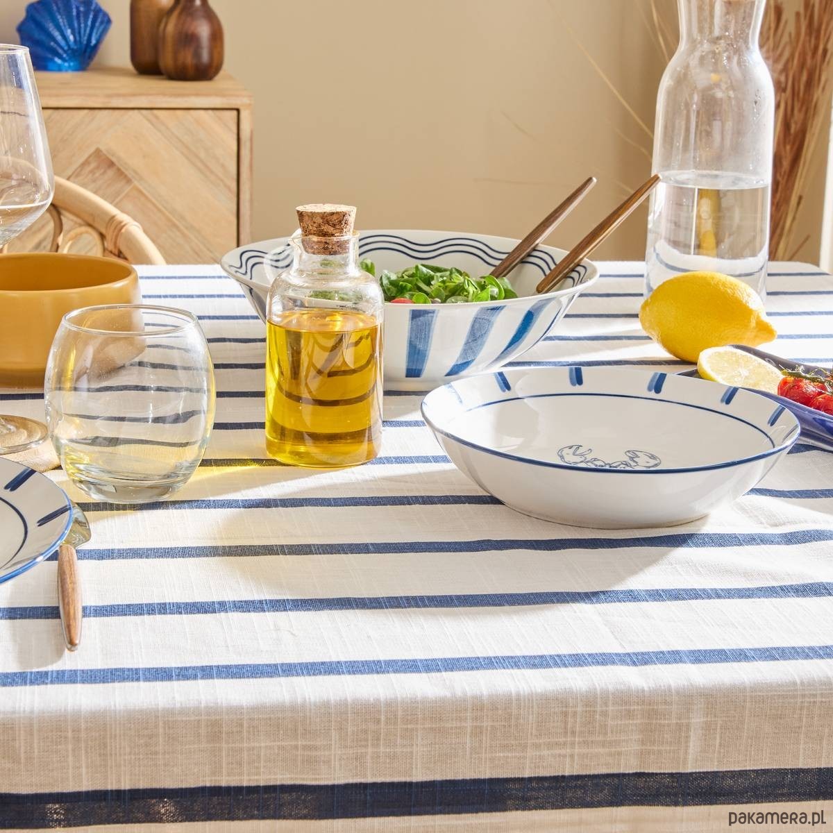Obrus bawełniany, biały w granatowe pasy, 140x240 cm Oceania
