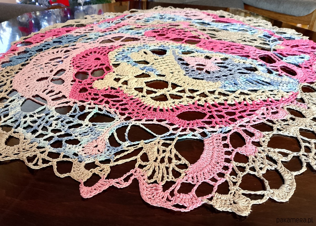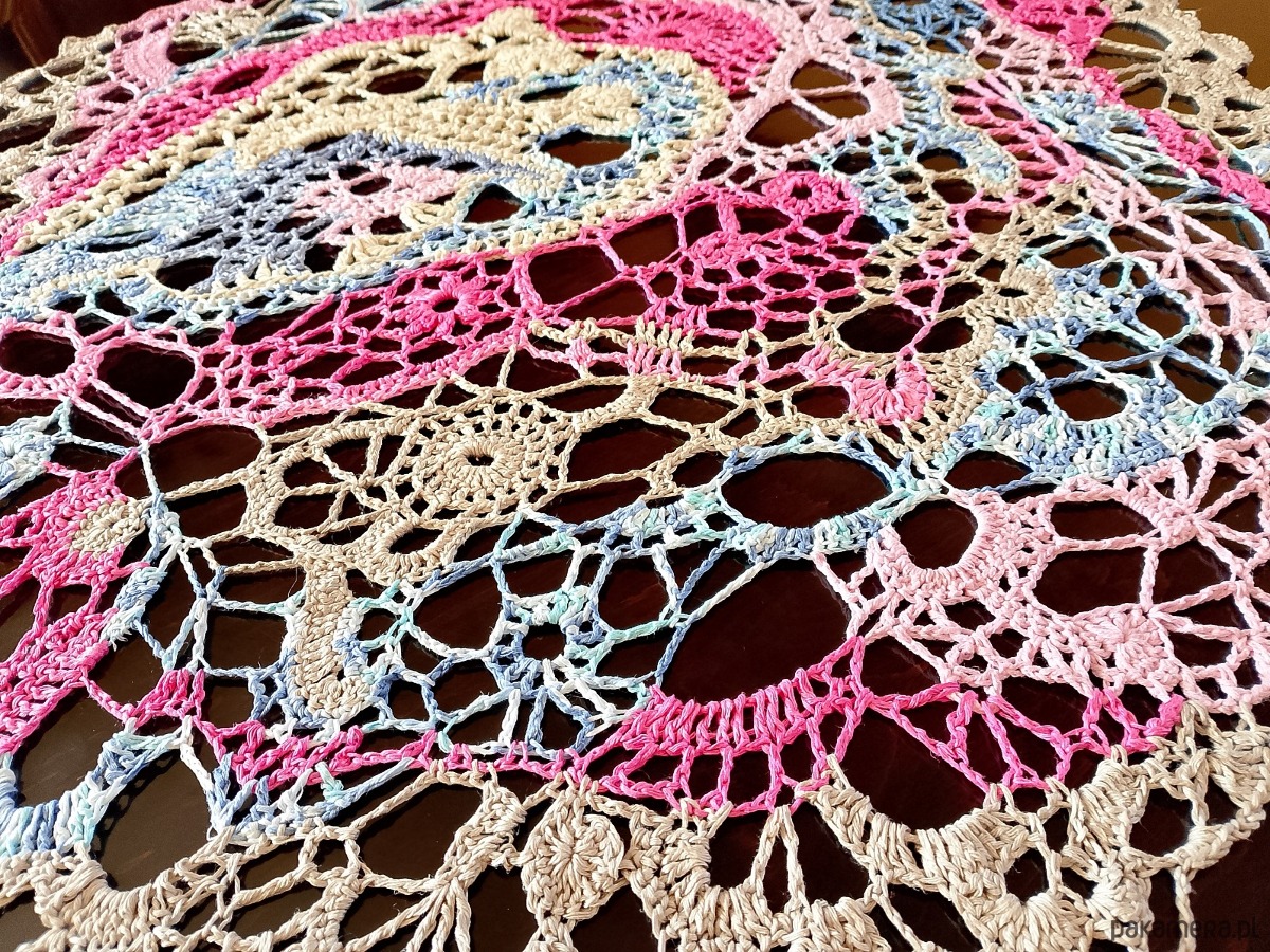 Wyjątkowy obrus wykonany w całości ręcznie w formie kolorowej abstrakcji. Freeform crochet to technika tworzenia rękodzieła szydełkiem, która nie opiera się na żadnych wzorach czy schematach, pozwalając na całkowitą swobodę twórczą, łączenie różnych ściegów, kolorów i faktur w asymetryczne, unikalne formy. Polega na intuicyjnym dzierganiu i tworzeniu artystycznych kolorowych, organicznych kształtów.