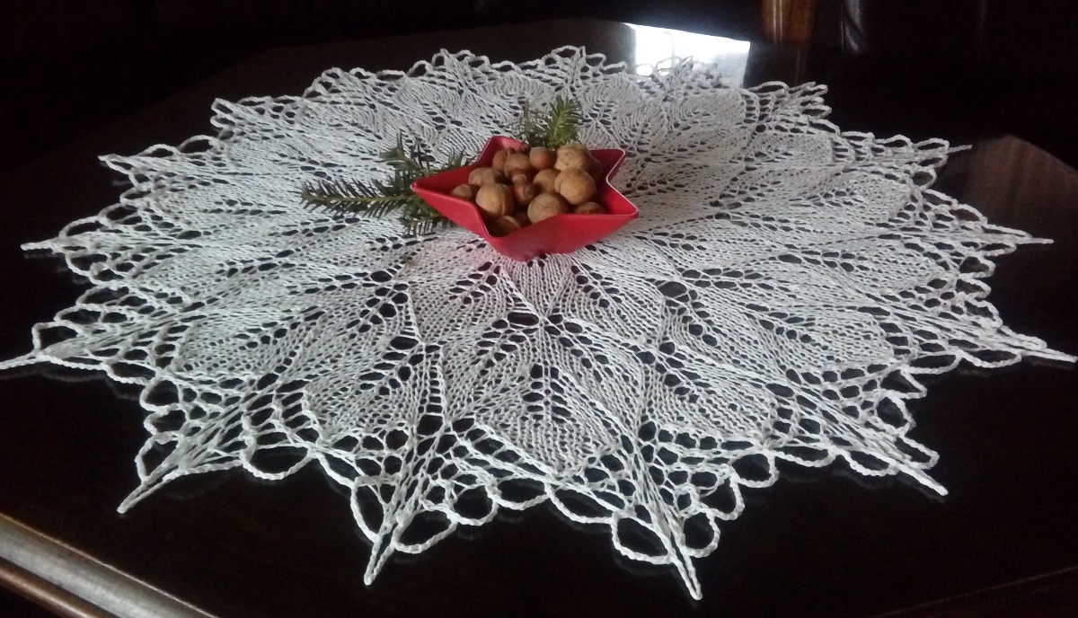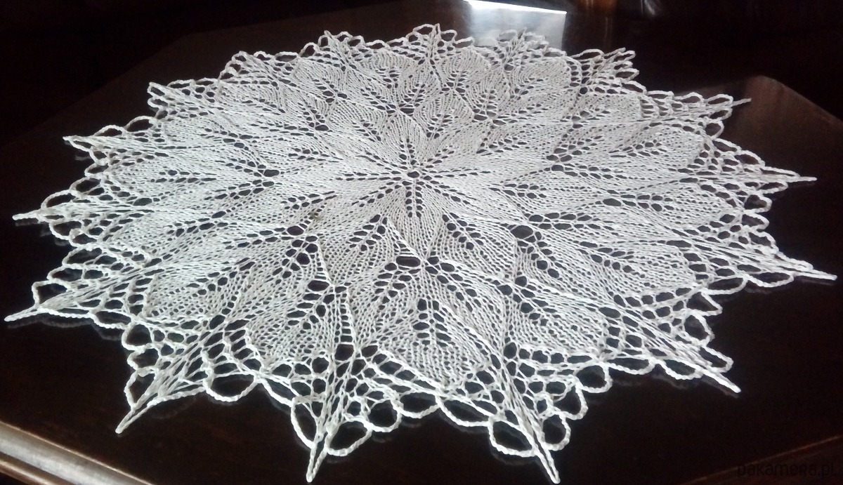 Obrus wykonany na drutach. Piękna a zarazem oryginalna ozdoba mieszkania, ponieważ koronki robione na drutach są wyjątkowo delikatne i mają niecodzienny urok. Dodatkowo wyróżnia je technika wykonania, która obecnie jest rzadkością z uwagi na trudność i pracochłonność. Zastosowany wzór sprawia wręcz hipnotyzujące wrażenie efektu 3D. Średnica obrusa 82 cm, bawełna 100%, kolor biały. Możliwość wykonania podobnego w innym wymiarze lub kolorze, wówczas cena uzależniona od rozmiaru.
