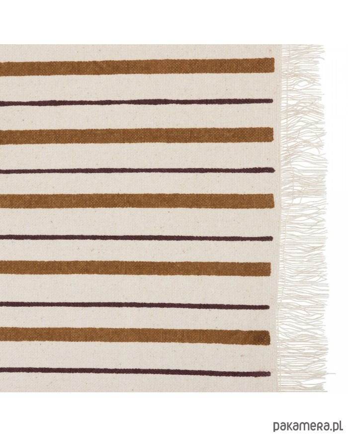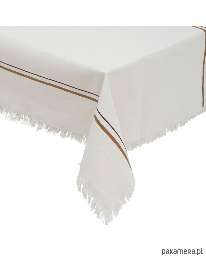 Elegancki obrus na prostokątny stół został wykonany w 100% z bawełny. Wzór - biały z beżowymi pasami wzdłuż dłuższego brzegu. Ozdobiony został drobnymi frędzlami.