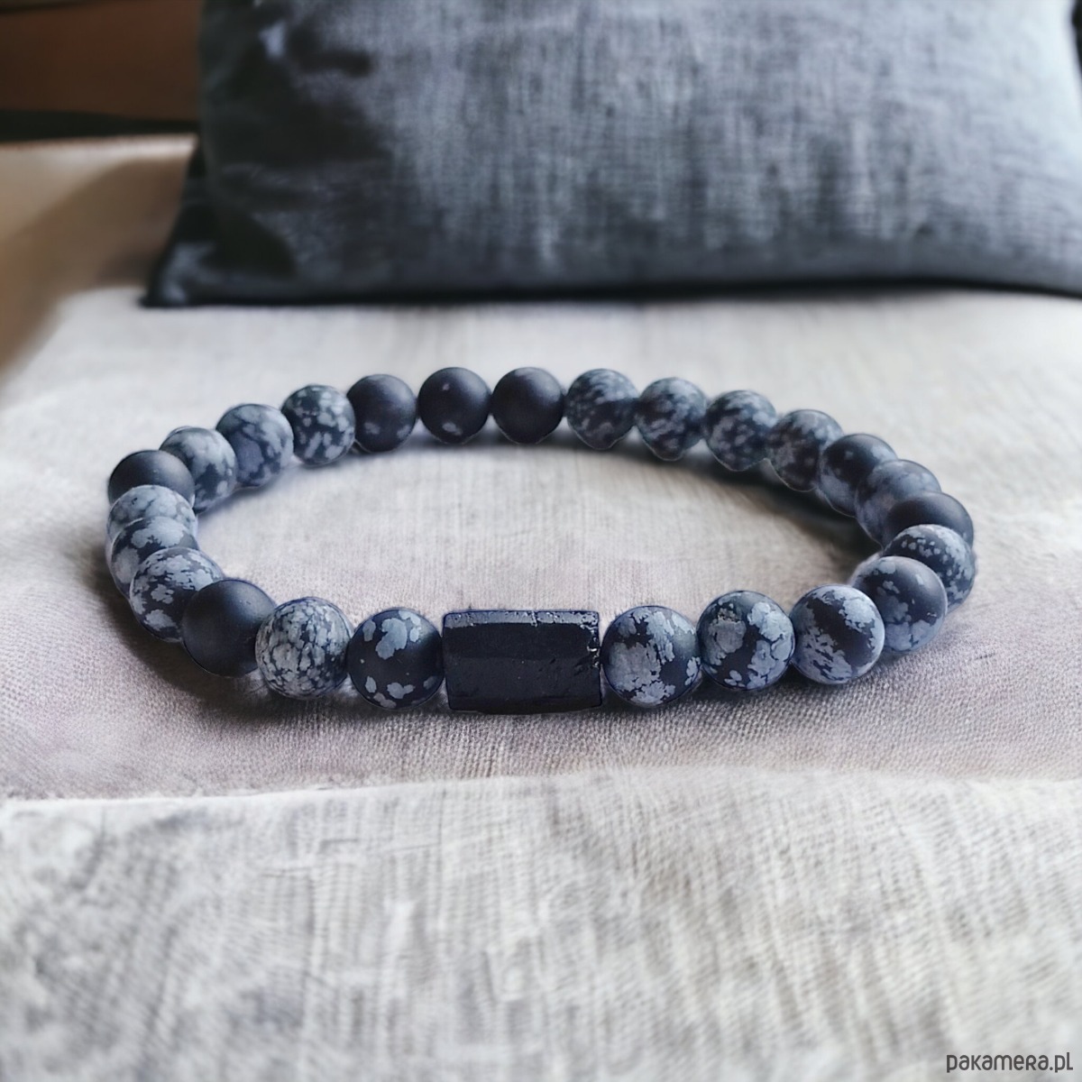 niezwykle ciekawa bransoletka- talizman wykonana z kul matowego obsydianu śnieżnego (8mm) i surowej bryłki czarnego turmalinu.na solidnej gumce jubilerskiej. bez elementów metalowych.