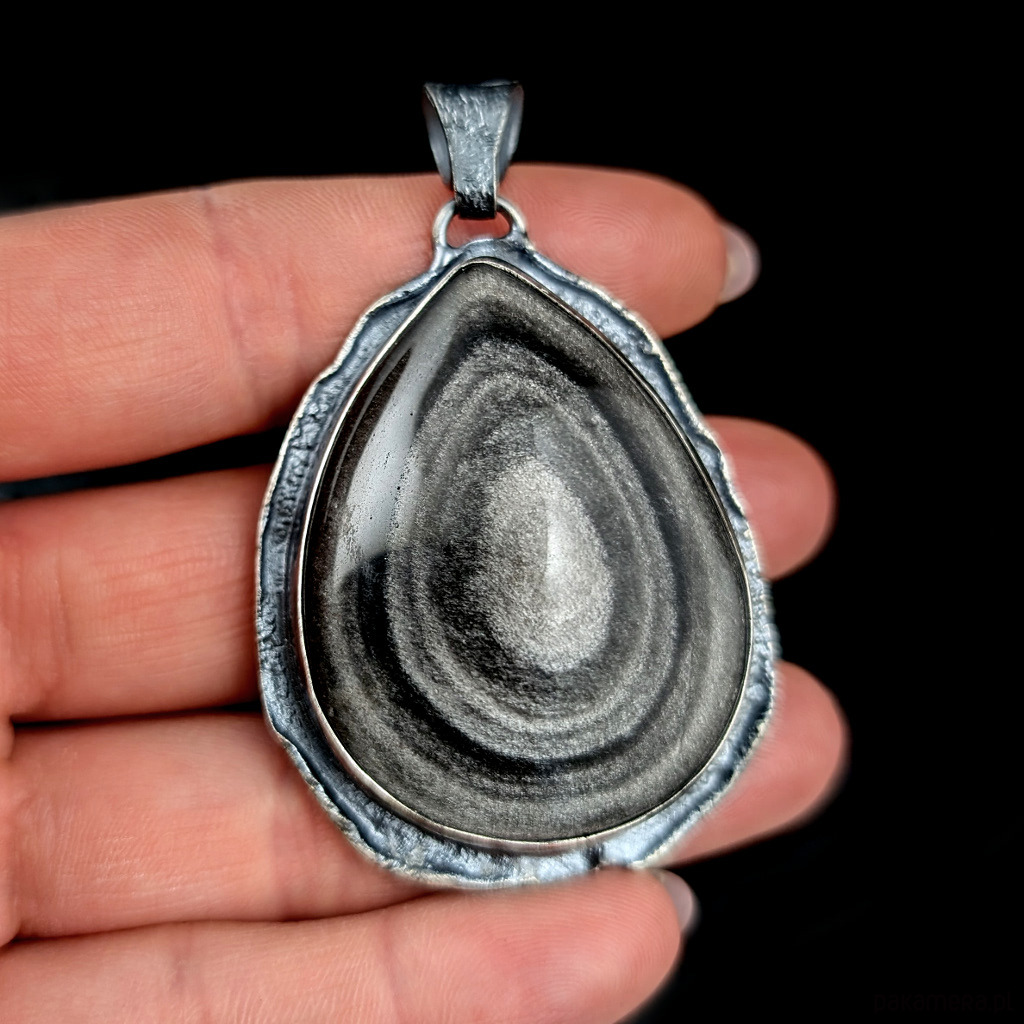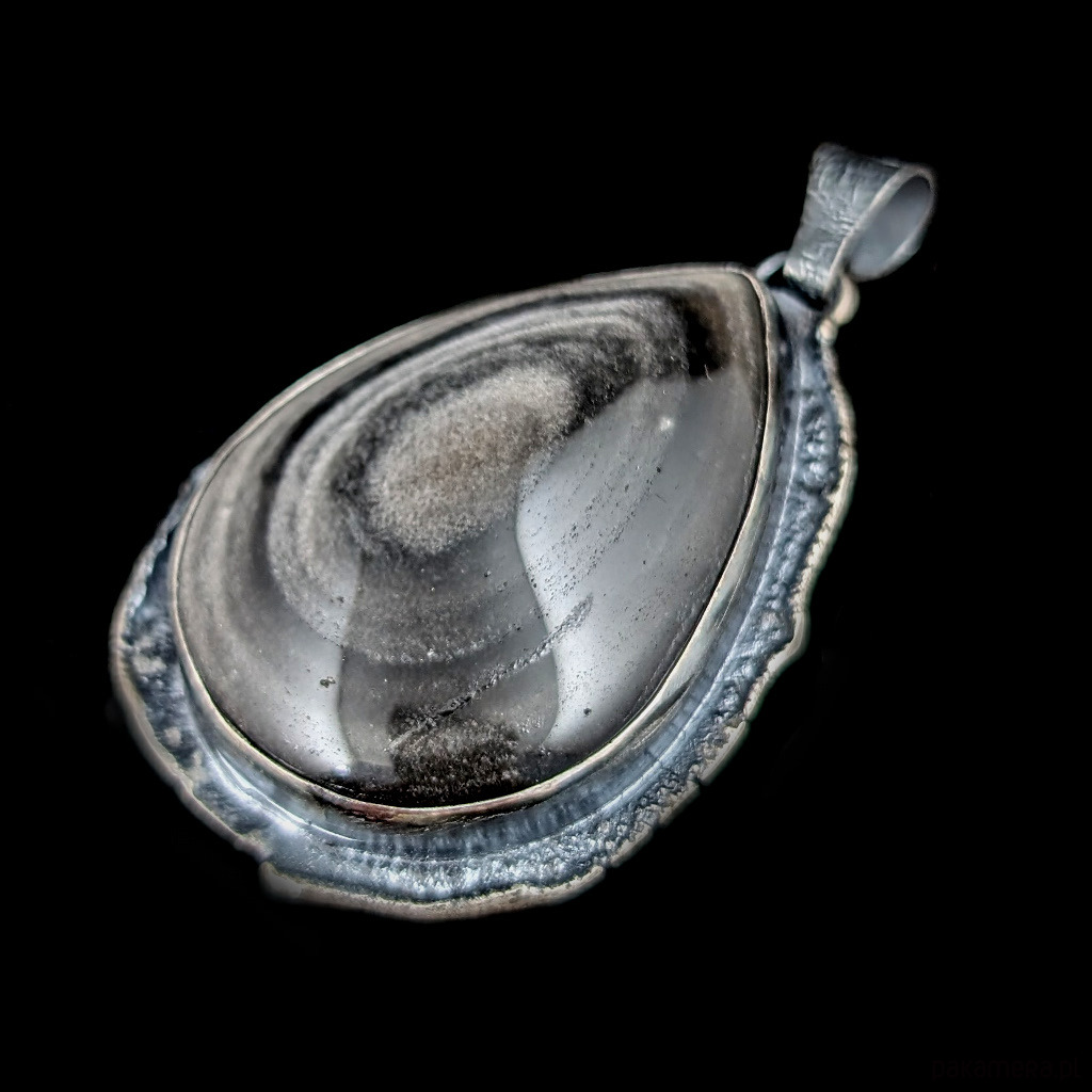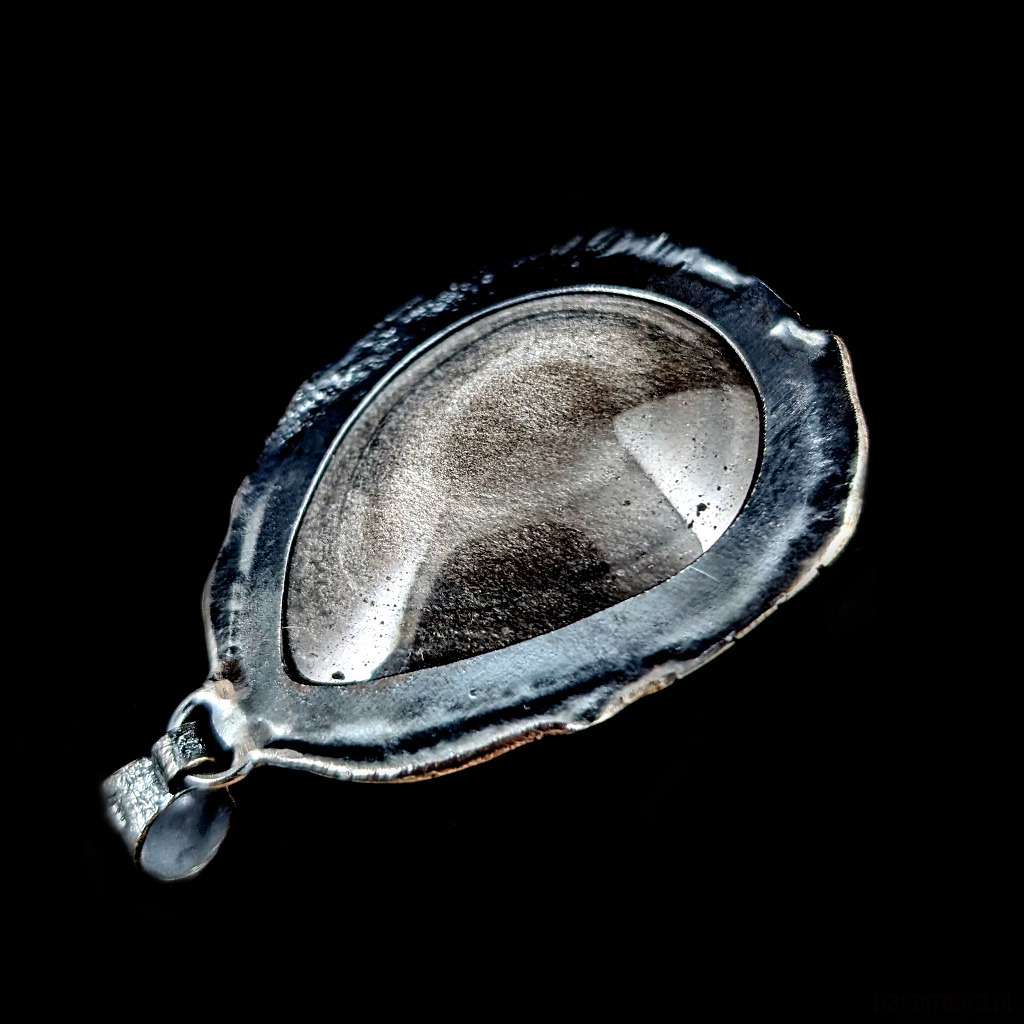 Tajemniczy wisior wykonany z oksydowanego srebra próby 925 oraz niezwykłego obsydianu tęczowego. Tafla minerału gładko szlifowana, spowita elegancką, aksamitną szarością, iryzującą w odcieniach srebra. Iryzacja ukazuje się podczas poruszenia kamieniem, pod odpowiedni kątem. Wymiary oprawy 50 x 40 mm, długość max 65 mm, waga 25 gramów. Tył otwarty, wisior zostanie zapakowany w ozdobne pudełeczko.