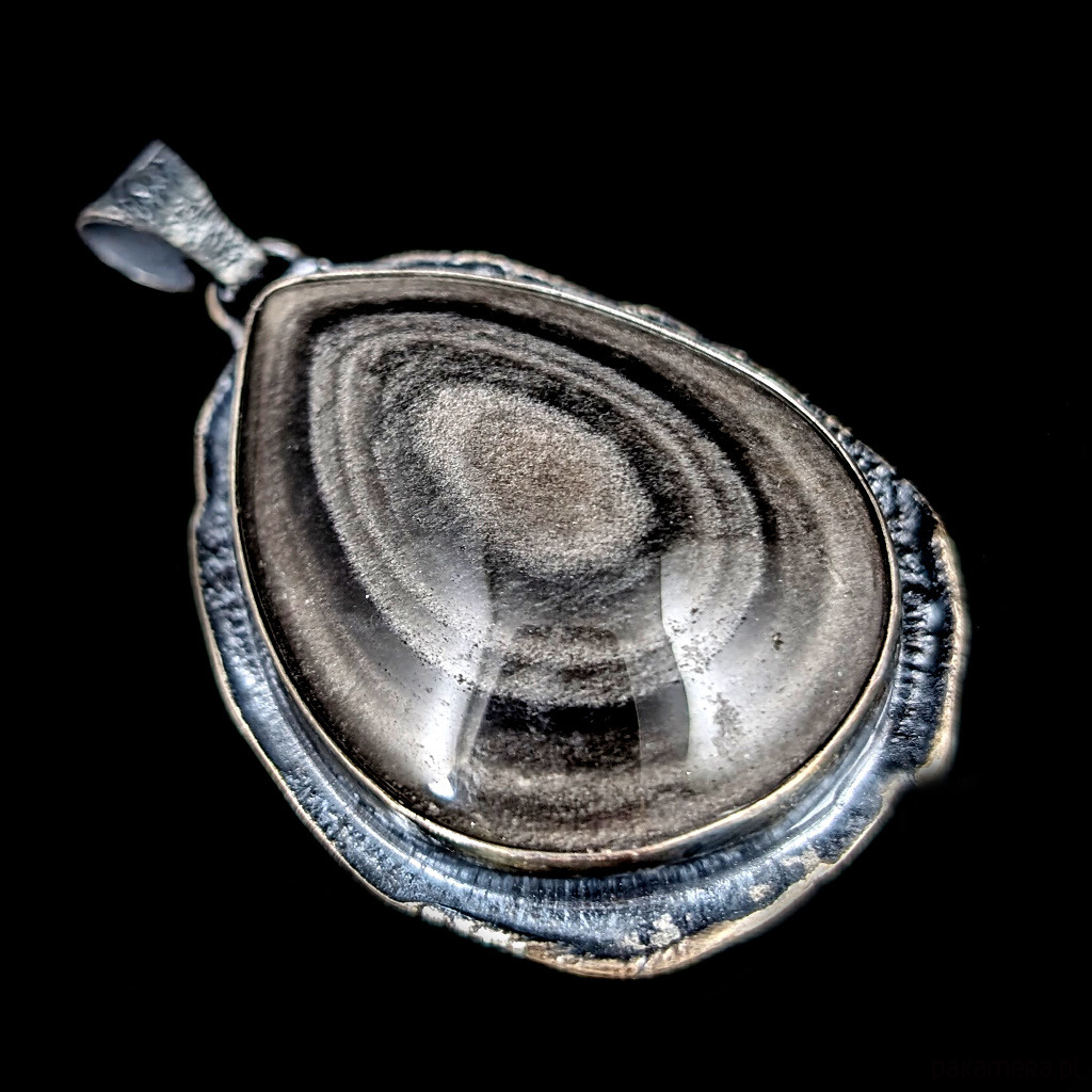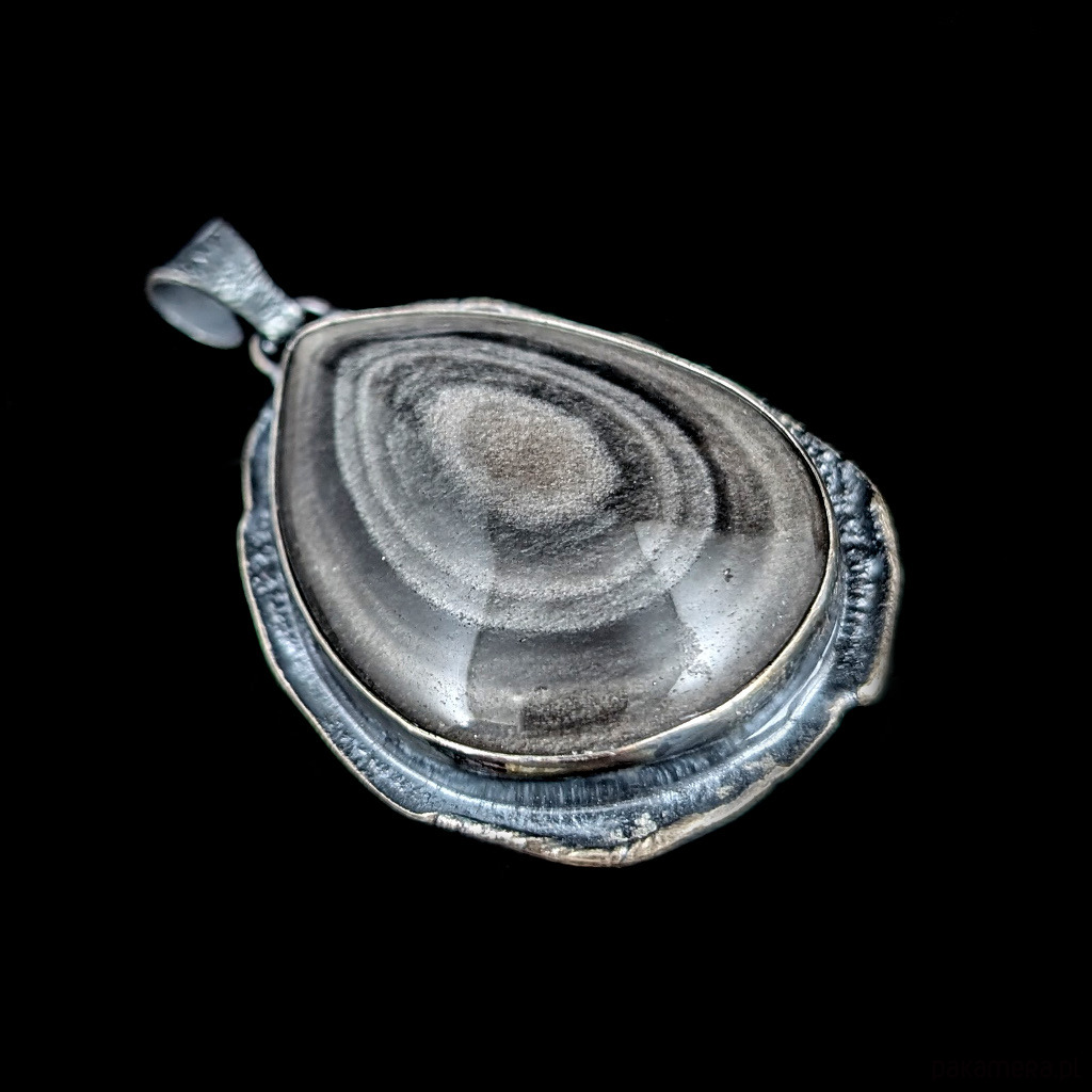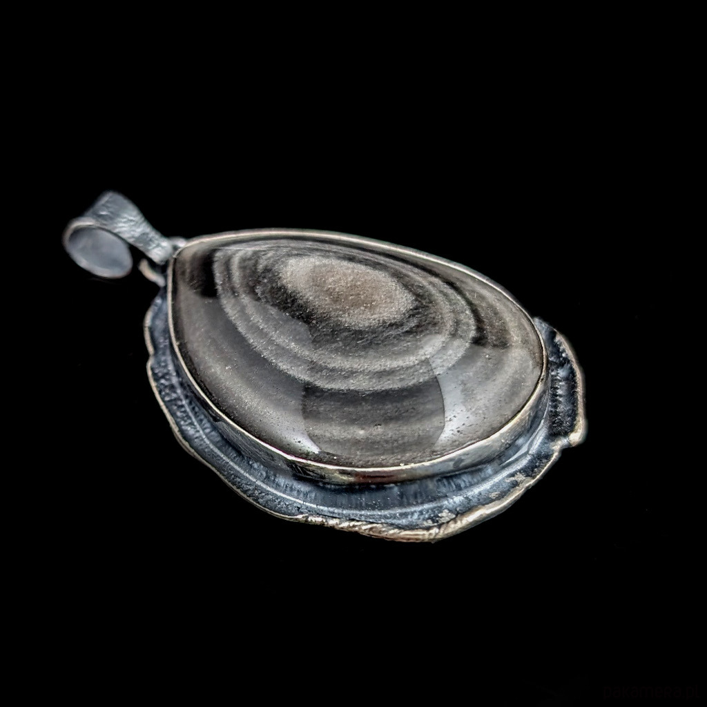 Tajemniczy wisior wykonany z oksydowanego srebra próby 925 oraz niezwykłego obsydianu tęczowego. Tafla minerału gładko szlifowana, spowita elegancką, aksamitną szarością, iryzującą w odcieniach srebra. Iryzacja ukazuje się podczas poruszenia kamieniem, pod odpowiedni kątem. Wymiary oprawy 50 x 40 mm, długość max 65 mm, waga 25 gramów. Tył otwarty, wisior zostanie zapakowany w ozdobne pudełeczko.