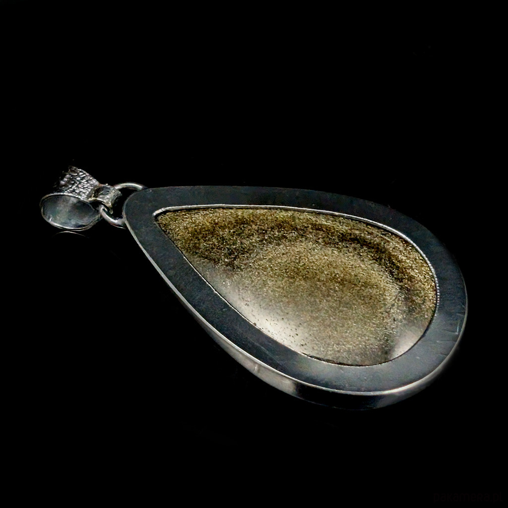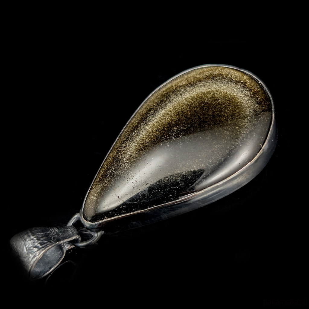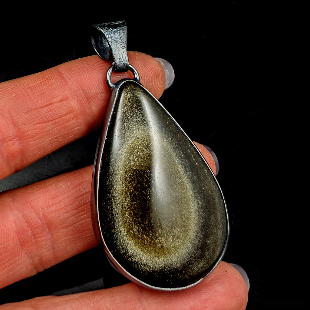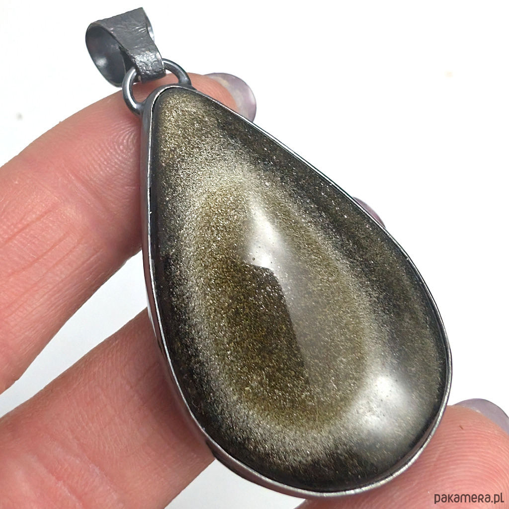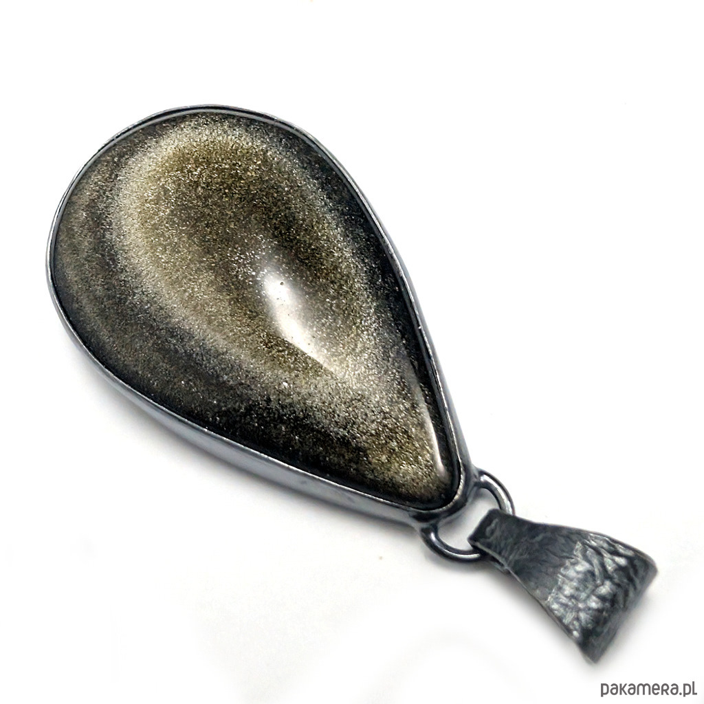 Tajemniczy wisior wykonany z oksydowanego srebra próby 925 oraz niezwykłego obsydianu tęczowego. Tafla minerału gładko szlifowana, spowita elegancką, aksamitną szarością, iryzującą w odcieniach starego złota. PRZEPIĘKNY. Iryzacja ukazuje się podczas poruszenia kamieniem, pod odpowiedni kątem. Wymiary oprawy 45 x 27 mm, długość max 60 mm, waga 19 gramów. Tył otwarty, wisior zostanie zapakowany w ozdobne pudełeczko..