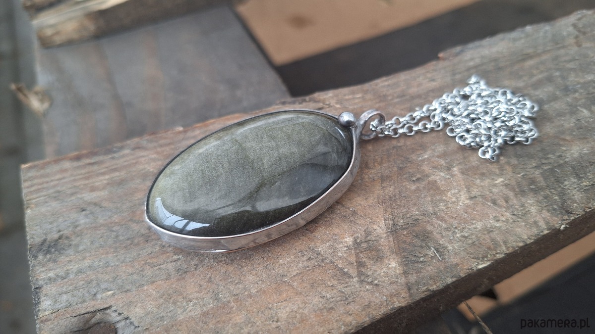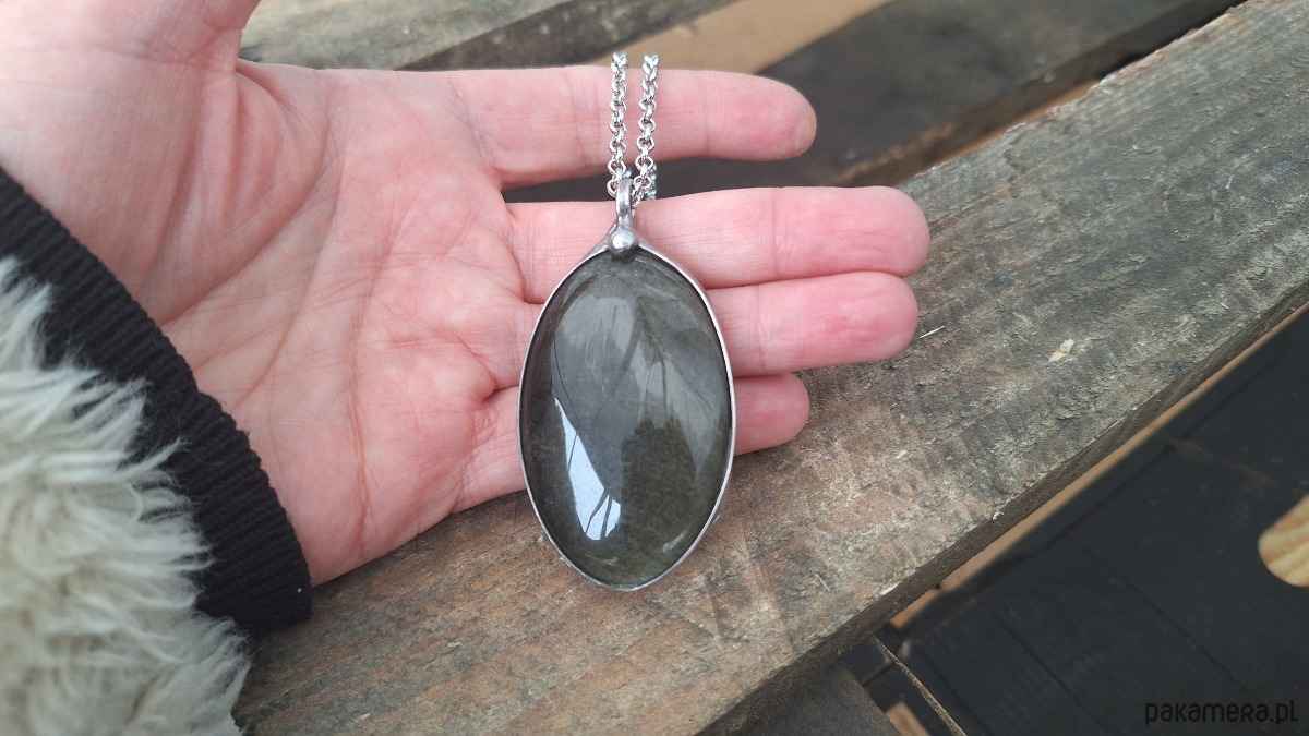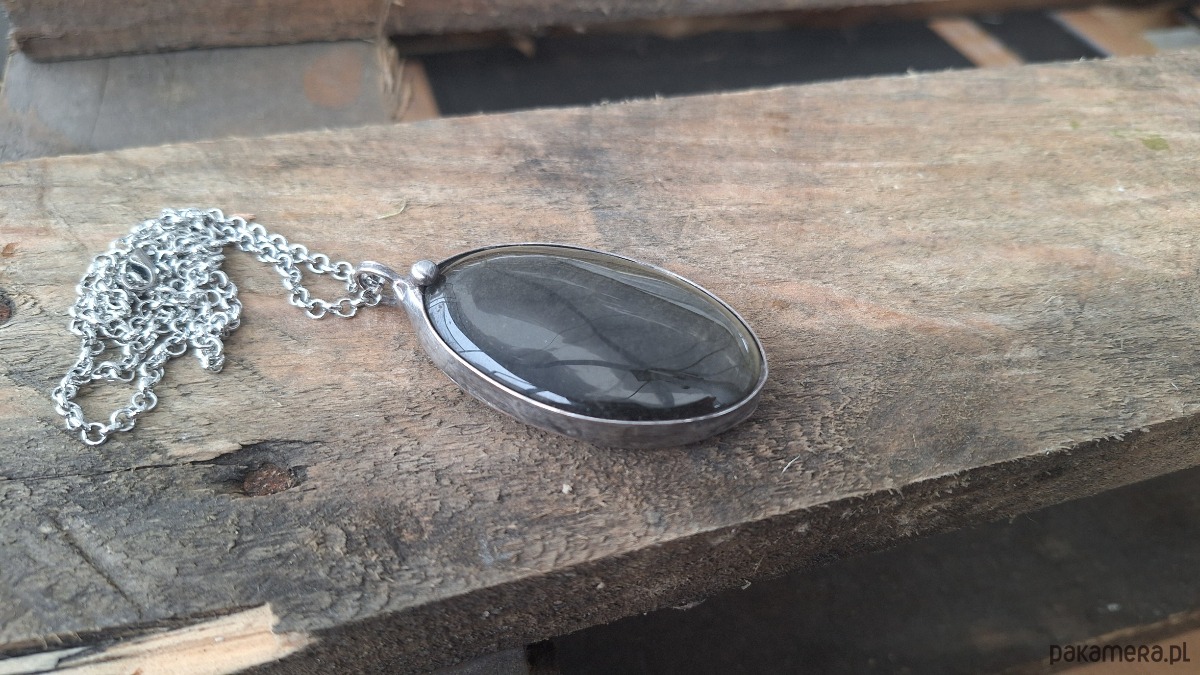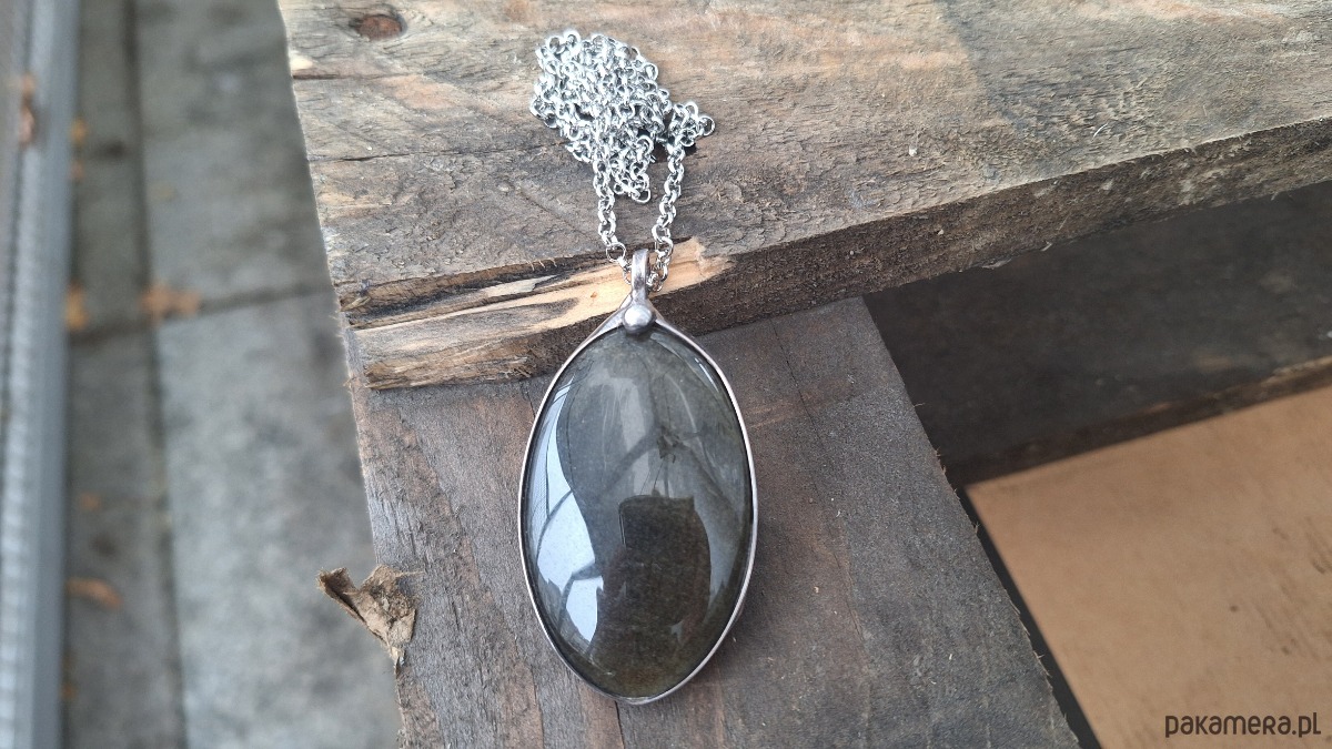 Wisiorek wykonany z miedzi, cyny i obsydianu. Wymiary ok. 5.5 na 3 cm. Zawieszony na łańcuszku o długości ok. 50 cm.