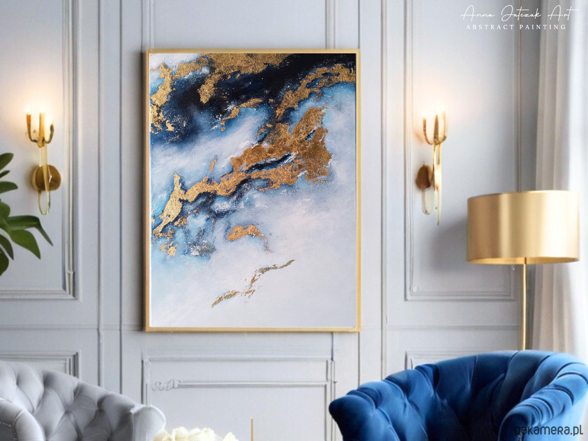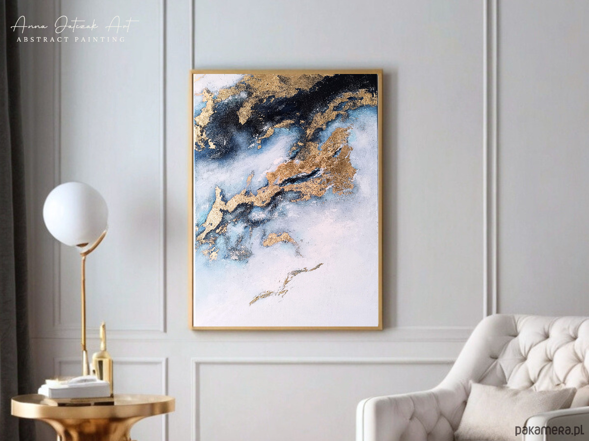 OCEAN Abstrakcyjny obraz akrylowy ze złotem, ręcznie malowany, 70x50 cm