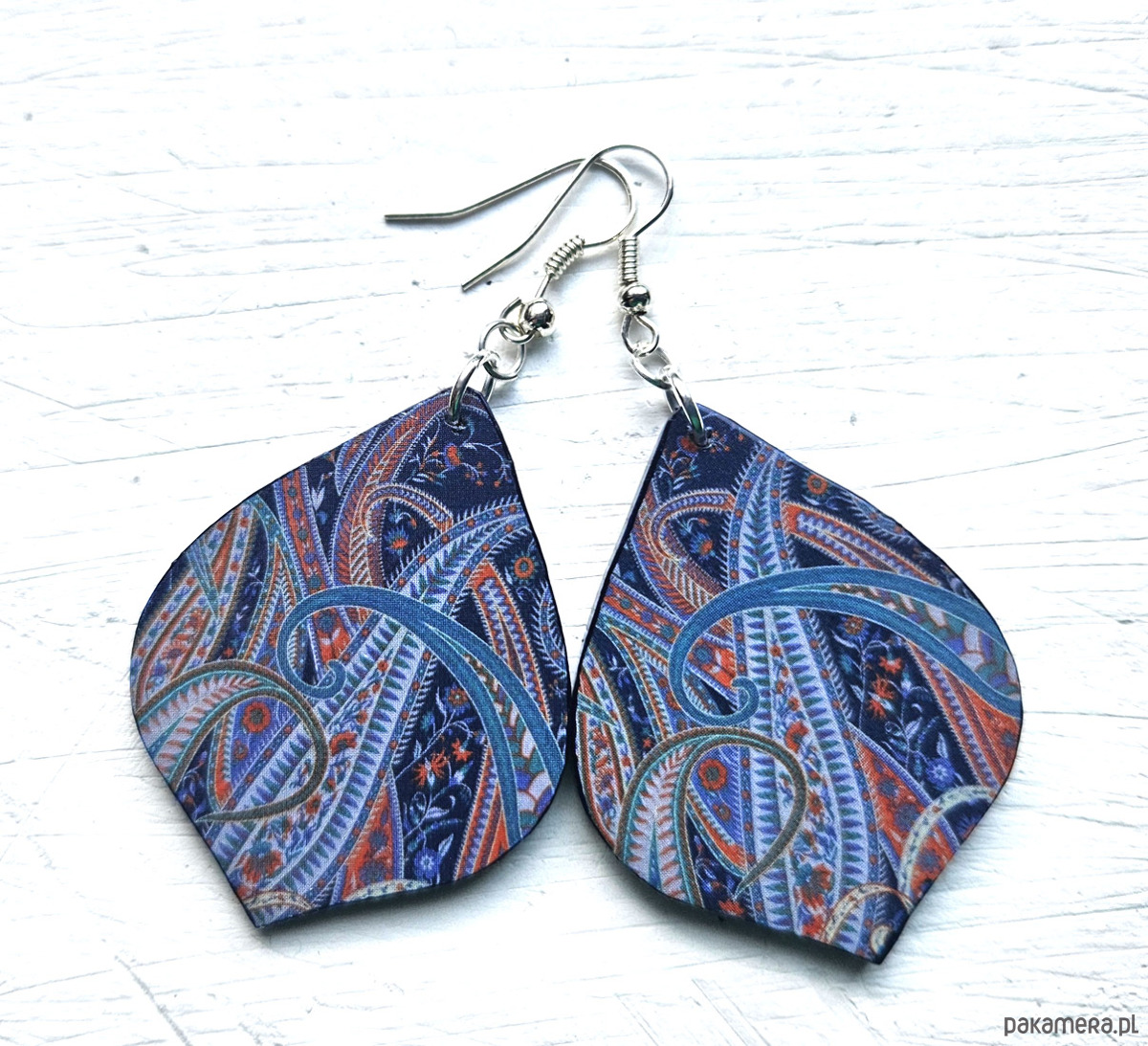 kolczyki drewniane, ozdobione metodą decoupage, dwustronne, starannie wykończone farbami akrylowymi i zabezpieczone wielokrotnie lakierem, bigle posrebrzane, długość kolczyków bez bigli: 6 cm, szerokość: 3,5 cm, bardzo lekkie