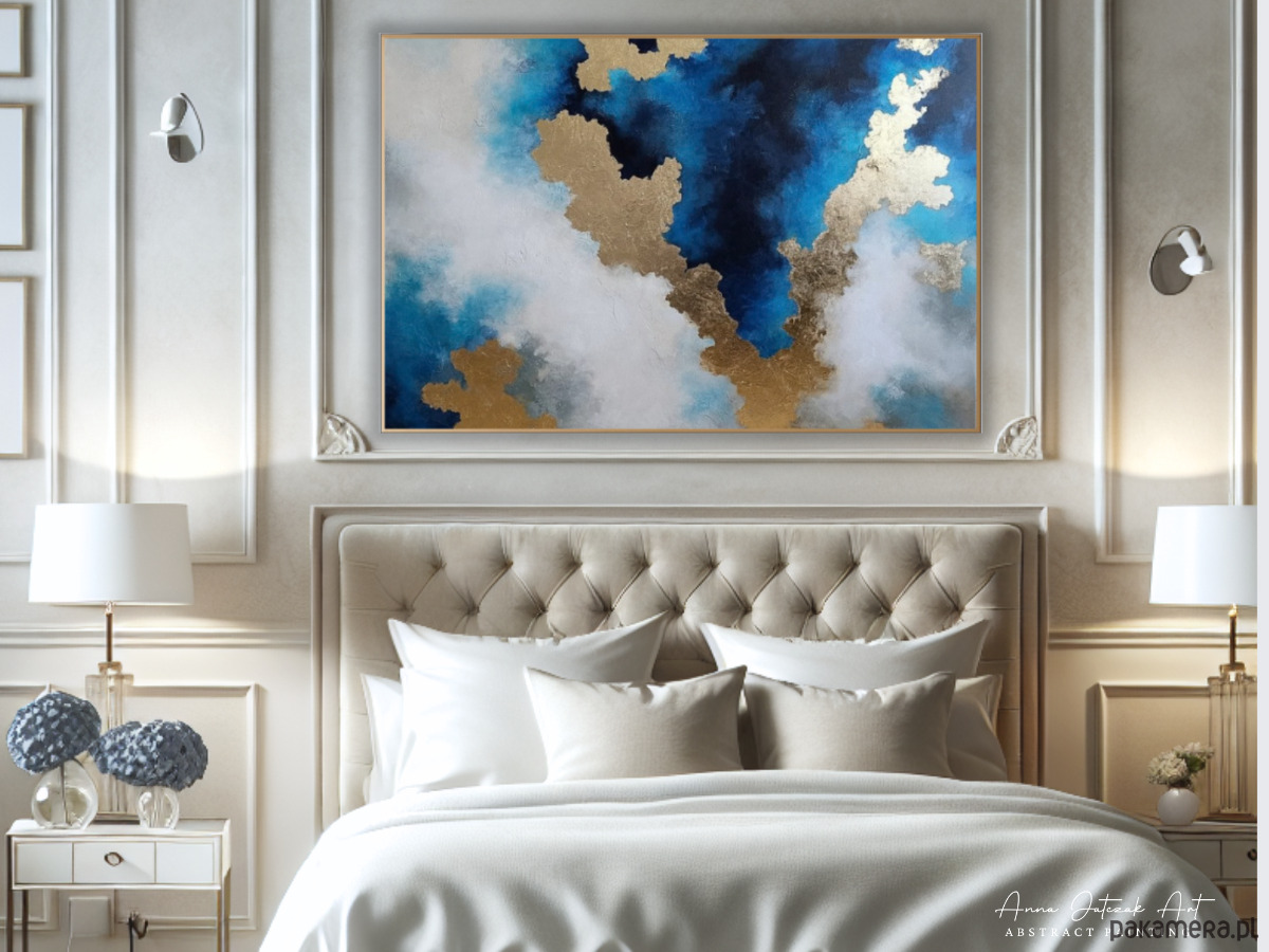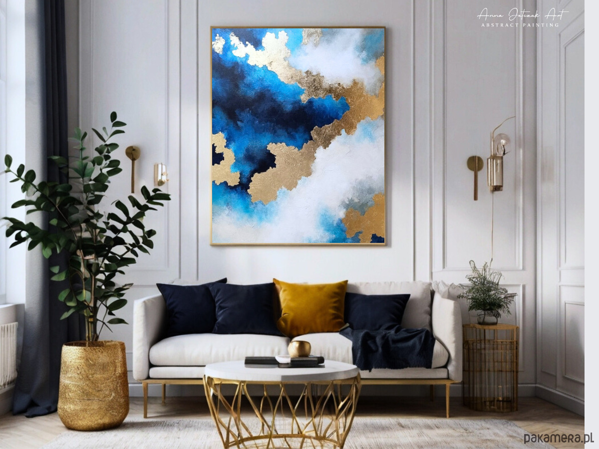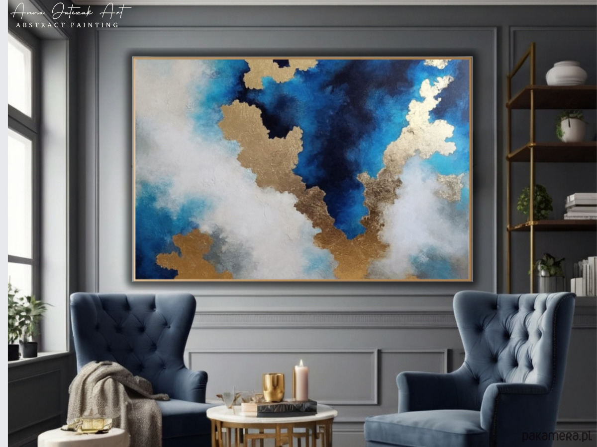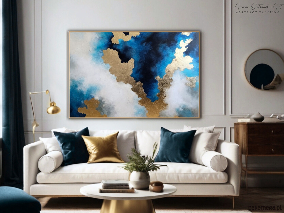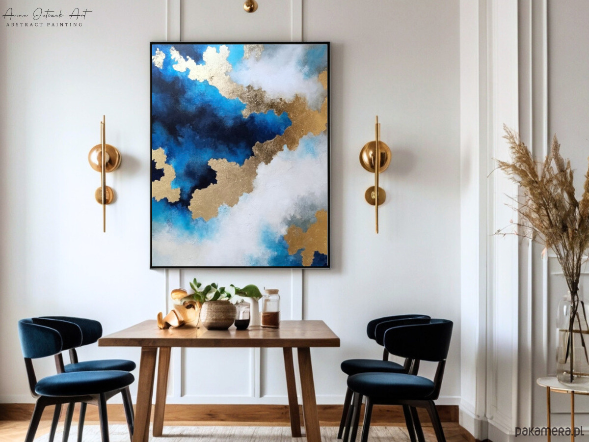 Nowoczesna abstrakcja inspirowana spotkaniem nieba i wody. Delikatne przejścia błękitu tworzą wrażenie przestrzeni i ciszy, jakby światło swobodnie rozlewało się po tafli morza.