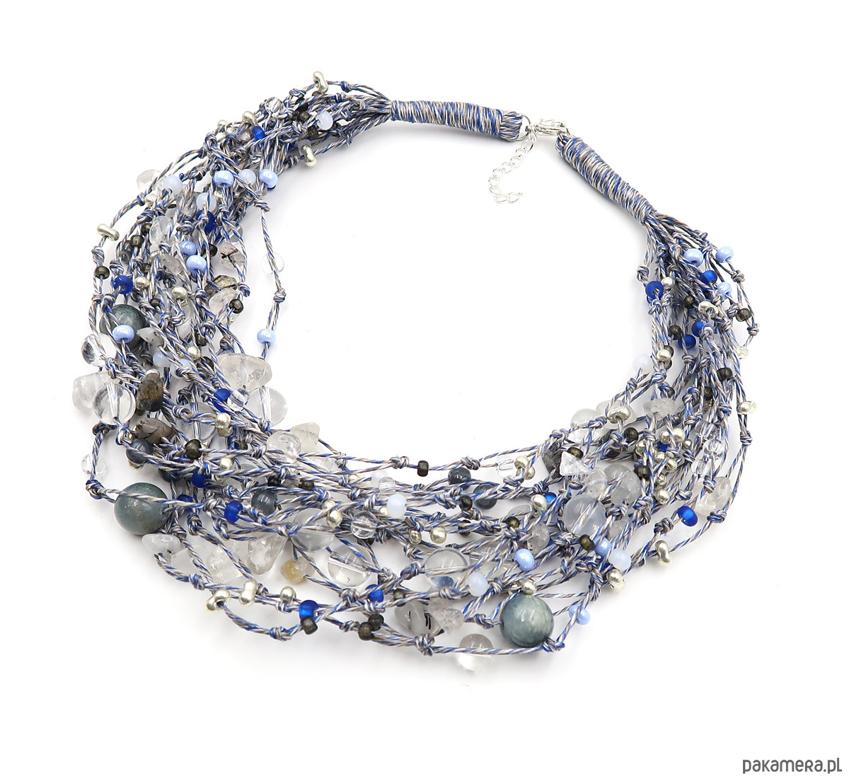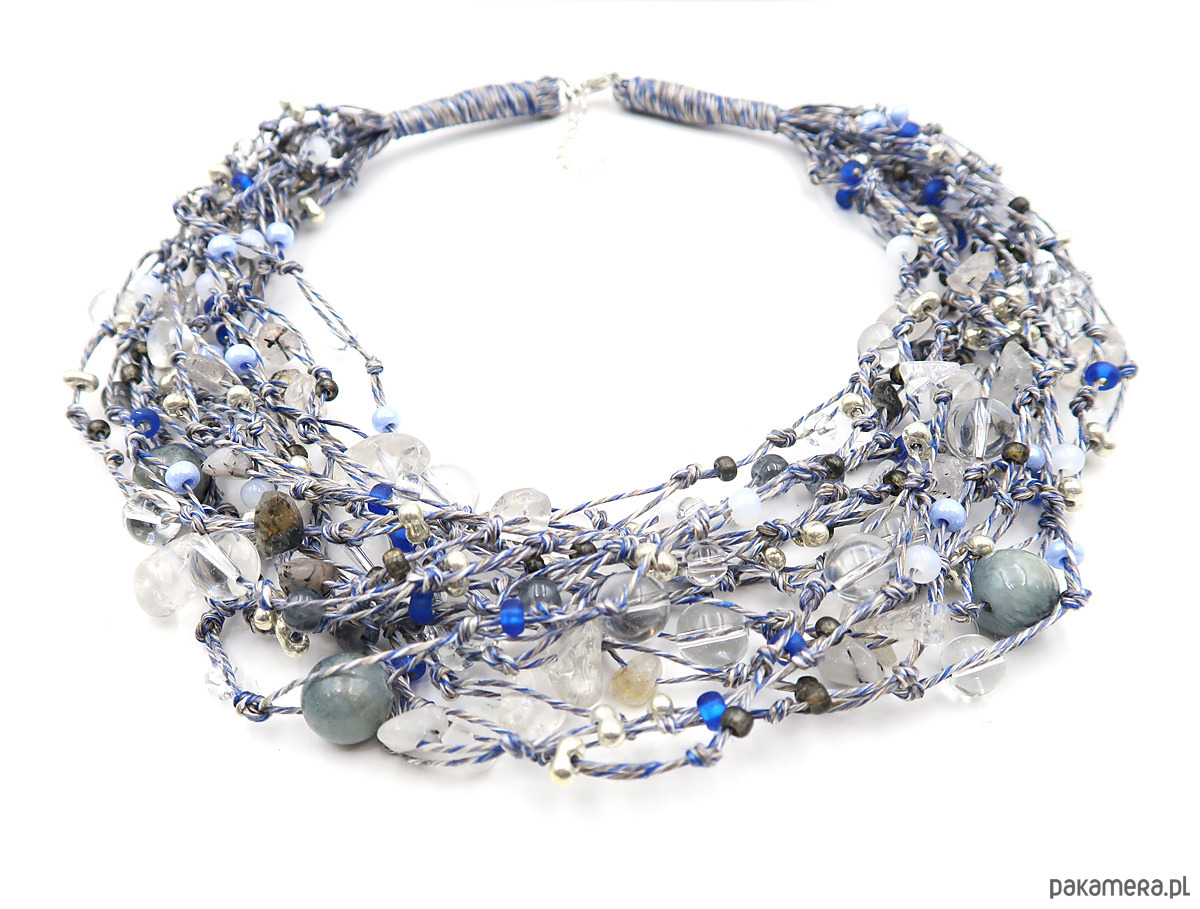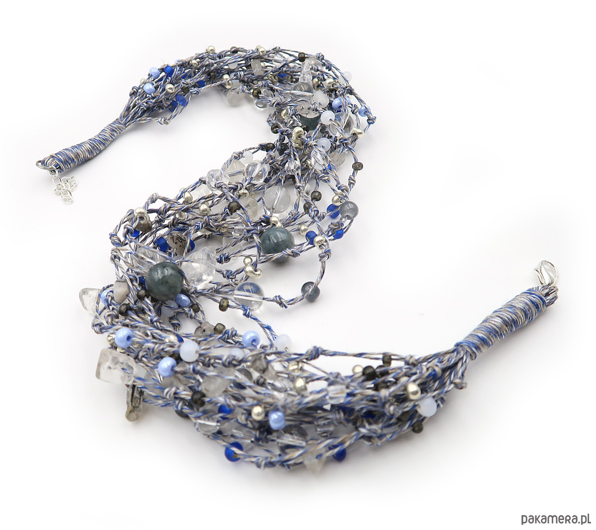 Autorski naszyjnik wykonany ręcznie na bazie naturalnej przędzy lnianej w odcieniach szarości, delikatnych błękitów i bieli. Każdy egzemplarz jest unikatowy.