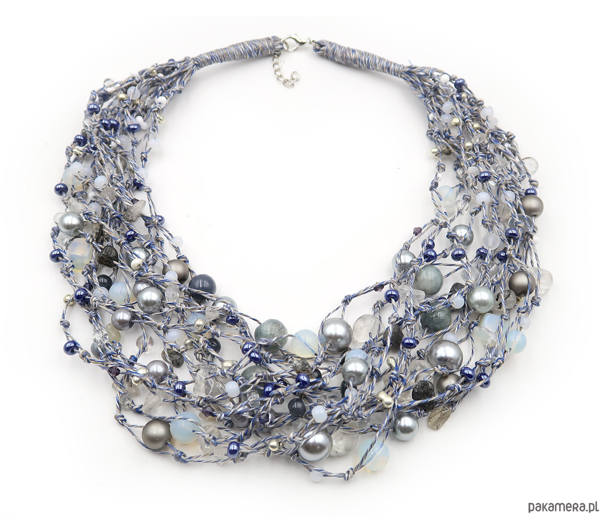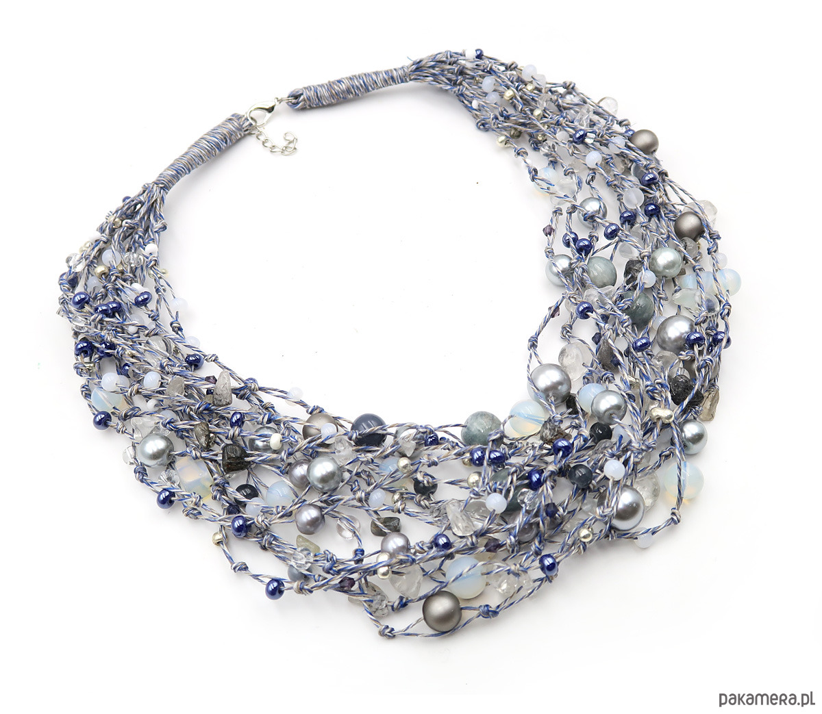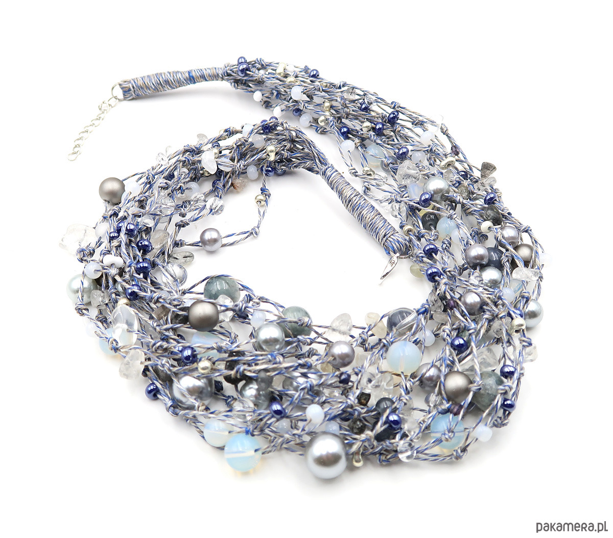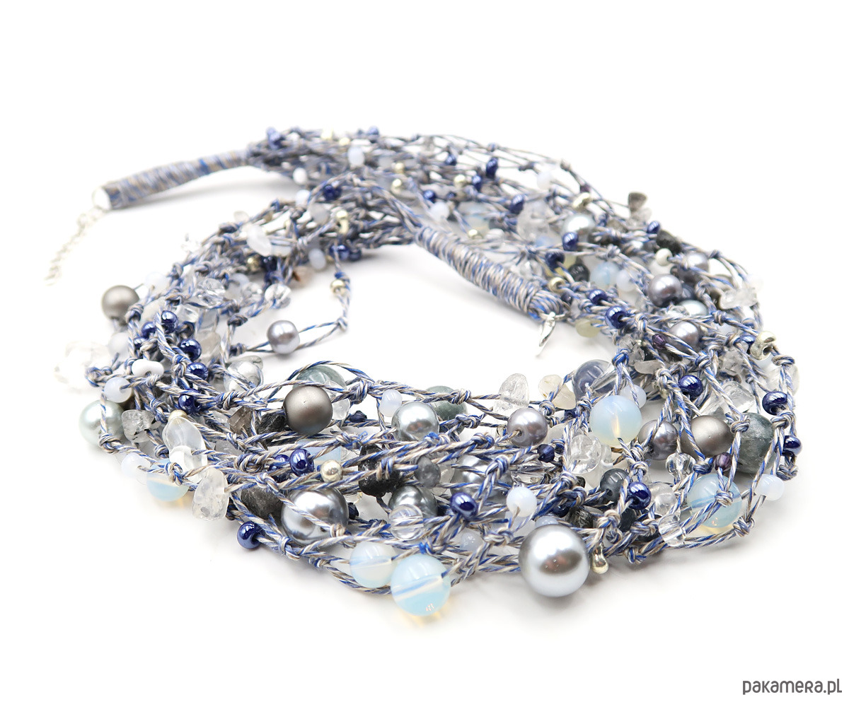 Autorski naszyjnik wykonany ręcznie na bazie naturalnej przędzy lnianej w odcieniach szarości, delikatnych błękitów i bieli. Każdy egzemplarz jest unikatowy.