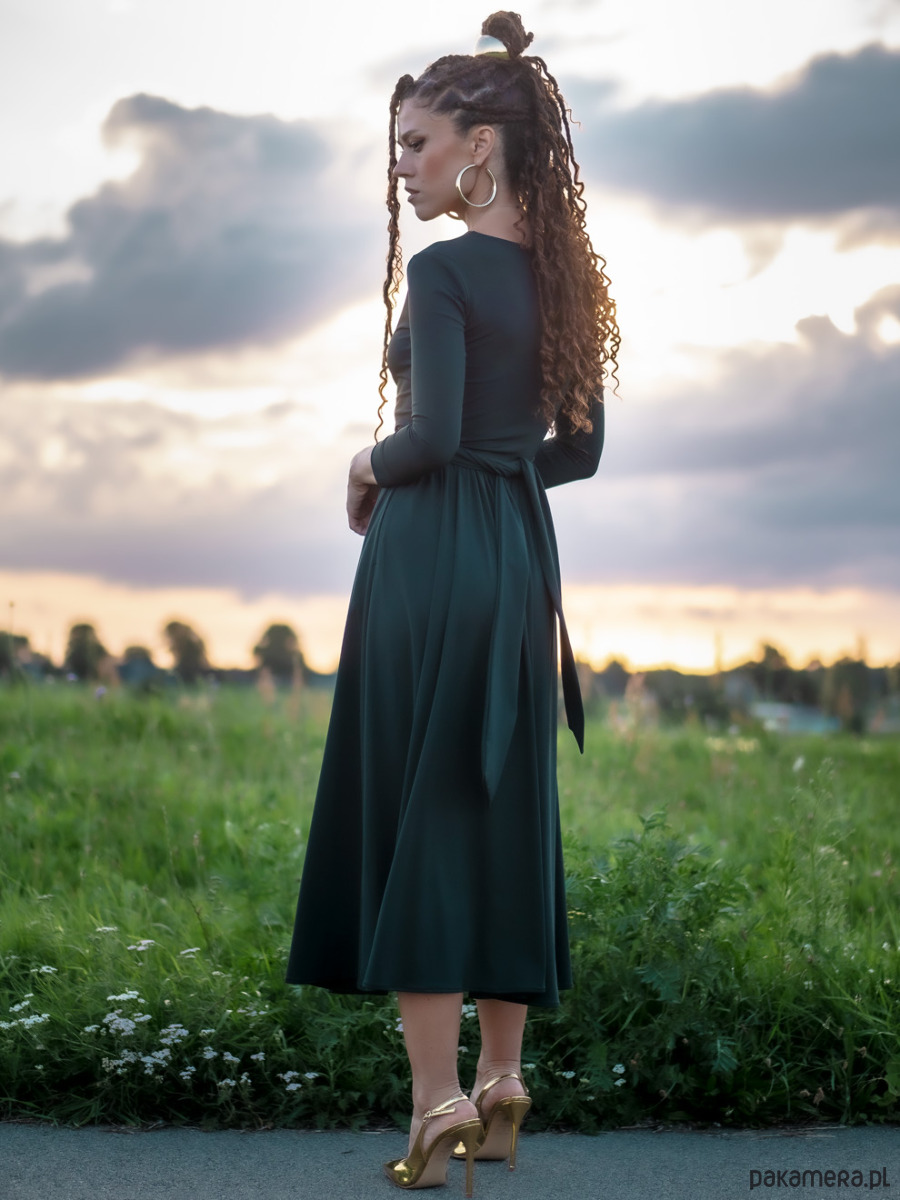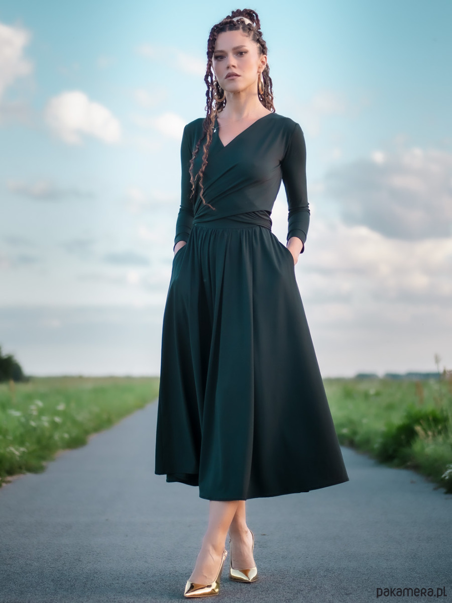 Dół sukienki jest rozkloszowany, długości 7/8 długości, a kieszenie ukryte w bocznych szwach dodają jej praktycznego charakteru. Rękaw kończy się w okolicach łokcia, a całość pięknie wysmukla sylwetkę i zapewnia pełen komfort noszenia.